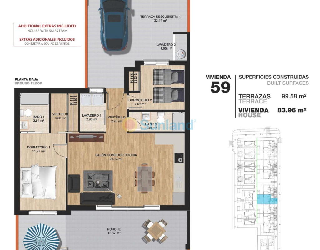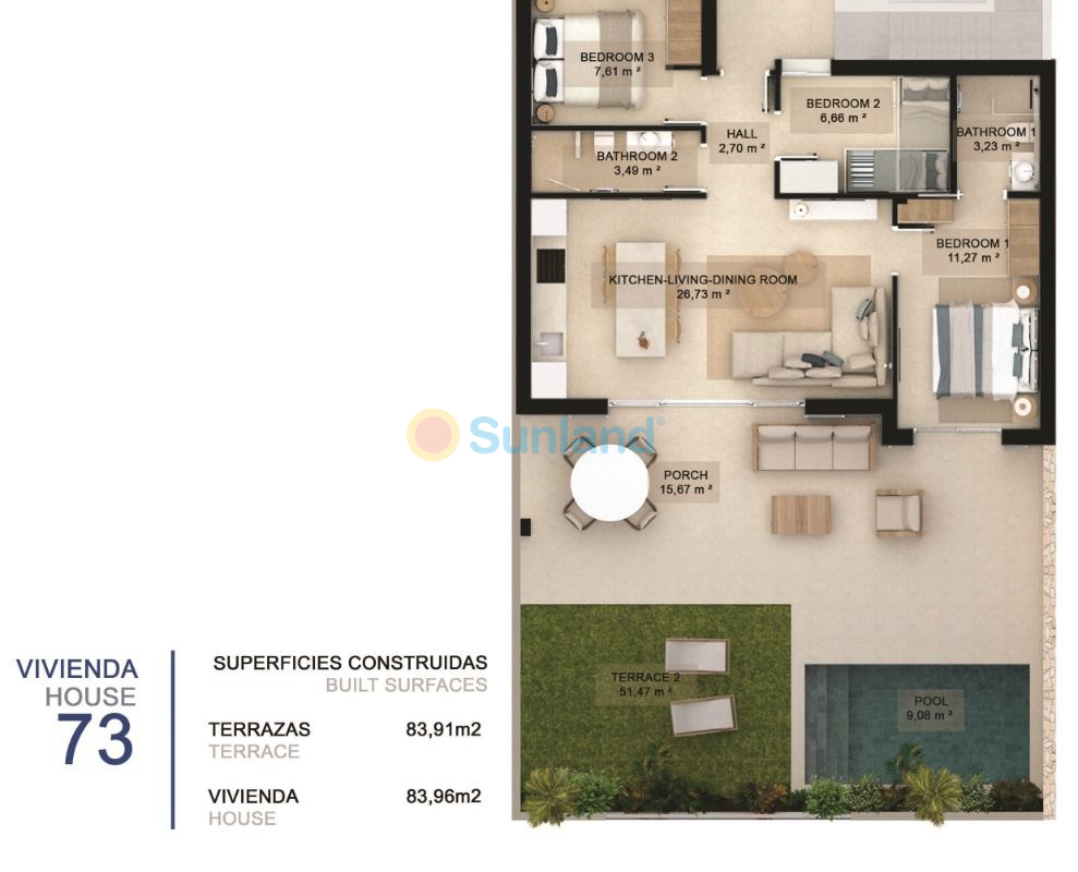 NEW BUILD RESIDENTIAL COMPLEX IN TORRE DE LA HORADADA New Build residential complex of bungalow apartments in Torre de la Horadada only 450m from the beach. All properties has 2/3 bedrooms, 2 bathrooms, open plan kitchen with the lounge area, fitted wardrobes and terrace. Beautiful bungalows on the ground floor has private garden with the pool, bungalow on the top floor has private solarium with the pool. All properties has private parking. Torre de la Horadada is located south of Alicante in a beautiful location on the coast. The beautiful beaches of Torre de la Horadada and Mil Palmeras have fine sand beautiful promenade. There are lots of restaurants, bars and shops, also water sports, diving and snorkelling. It is well connected just 40 minutes from Alicante and Murcias Corvera airports, with large commercial shopping centres and multiple golf courses all within easy reach.