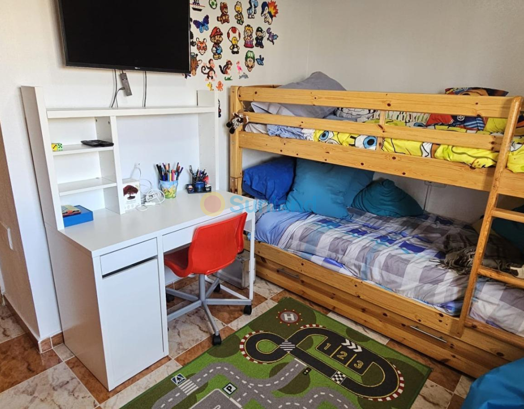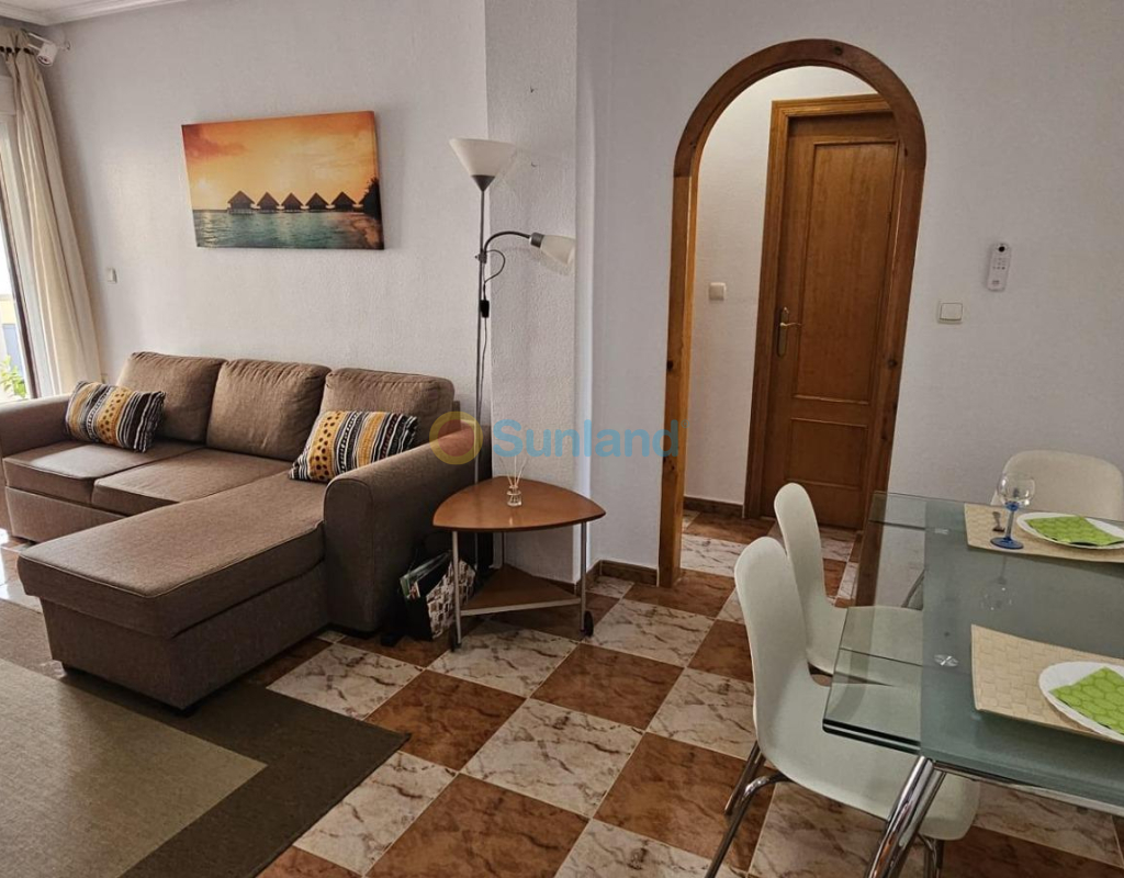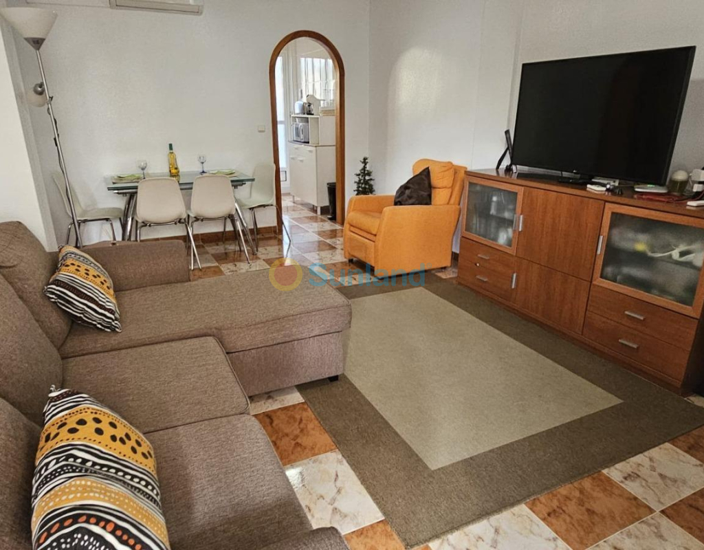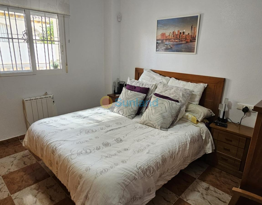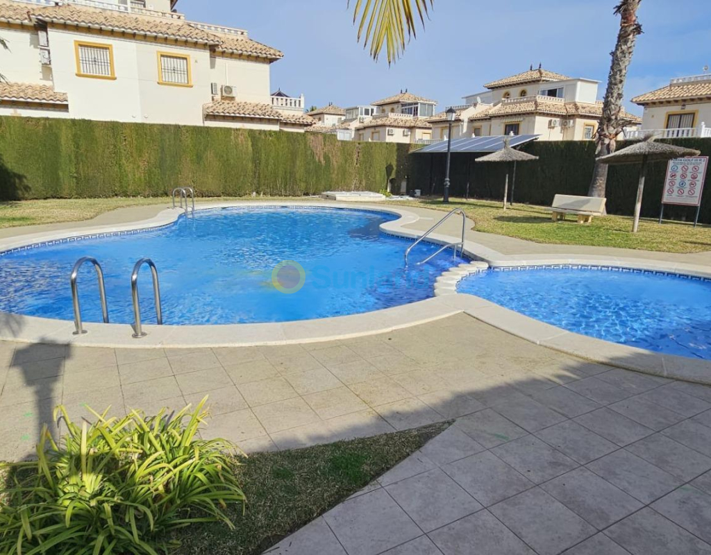 Lomas de Cabo Roig, Residencial Playa golf III, Ground floor corner flat with a 180 m2 plot with a barbecue area and storage room and a 71 m2 house with 2 bedrooms, bathroom, separate kitchen with gallery, living room and terrace of about 8 m2, the house is sold unfurnished, but the kitchen is sold equipped and the house has air conditioning, the residential has a beautiful communal pool.