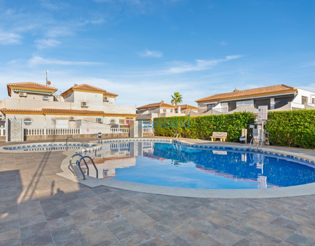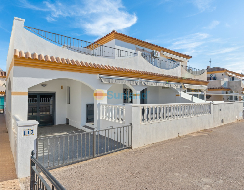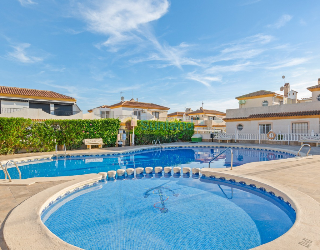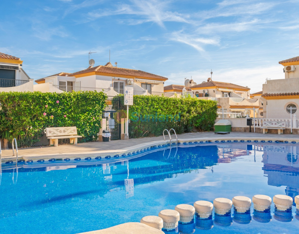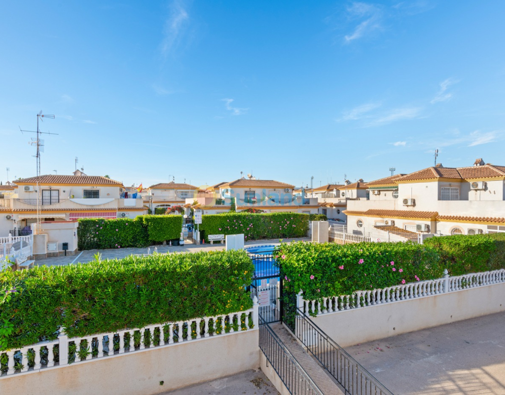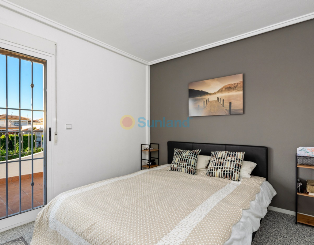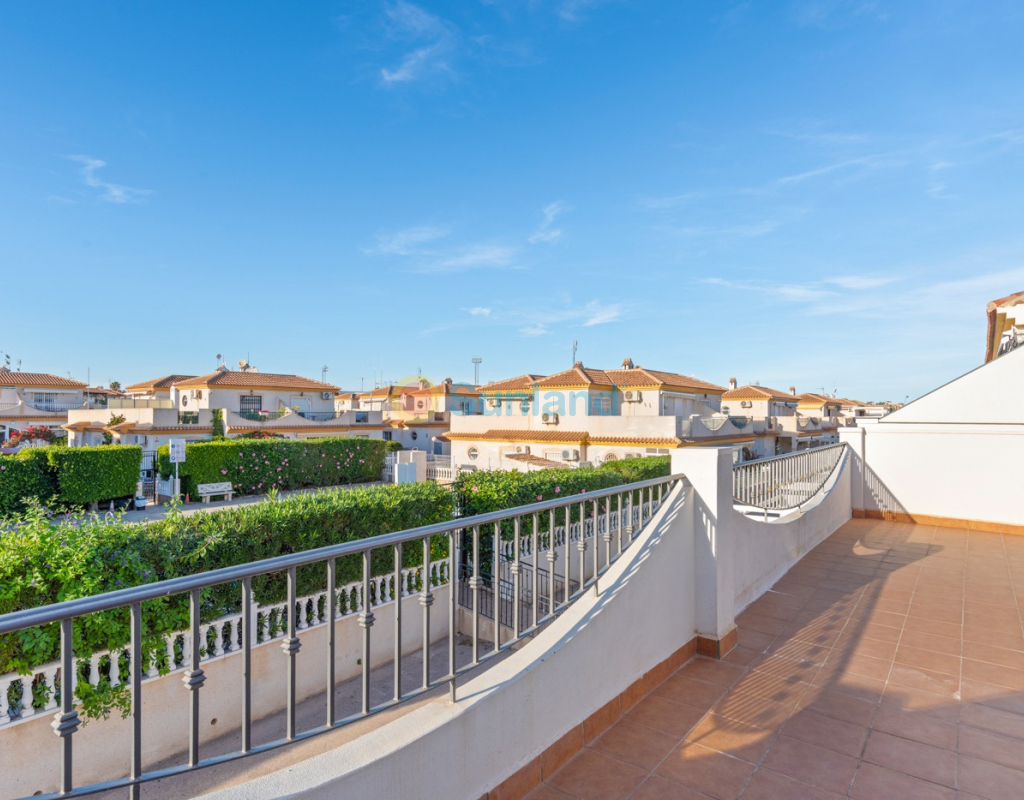 Beautiful property just 2.5 kilometres from the coast in Playa flamenca.This property has 2 full bedrooms, 2 bathrooms and an extra guest room with folding bed.The ground floor has an open plan fully equipped kitchen and a lounge with TV corner, another bedroom with bathroom and a storage room. The front door opens onto the spacious south-west facing terrace with adjacent car parking and access to the spacious garage. On the first floor we find the master bedroom with adjoining bathroom and through the hallway you enter a room where a bed can be folded open, through this room you also have access to the spacious roof terrace overlooking the beautiful communal swimming pool located directly opposite this sun-facing property.The house and terrace have recently been landscaped with new stone carpet which guarantees a clean look.Also just 200 metres away is an extensive sports park where you can play paddle, tennis, handball, basketball, athletics and football, among others, and there is also an indoor swimming pool. Details :- 3 bedrooms;- 2 bathrooms;- Communal swimming pool;- Terrace and roof terrace;- Private parking;- Garage. Distance to :- La Zenia Boulevard : 5 car minutes;- Beach : 5 car minutes;- Airport : 40 car minutes;- Golf : 10 car minutes;- Supermarket : 5 car minutes;- Café/restaurants : 8 walking minutes. Community fee; 300€ per yearIBI; 175€ per year