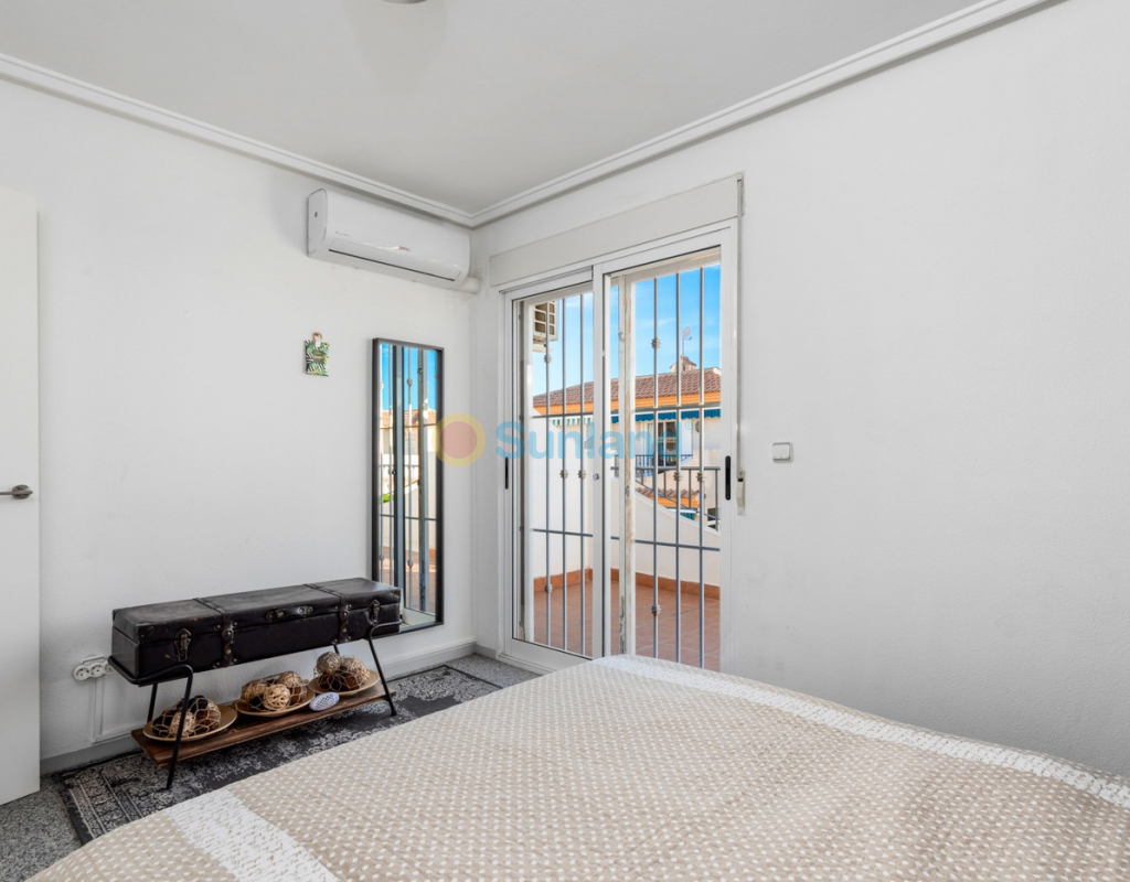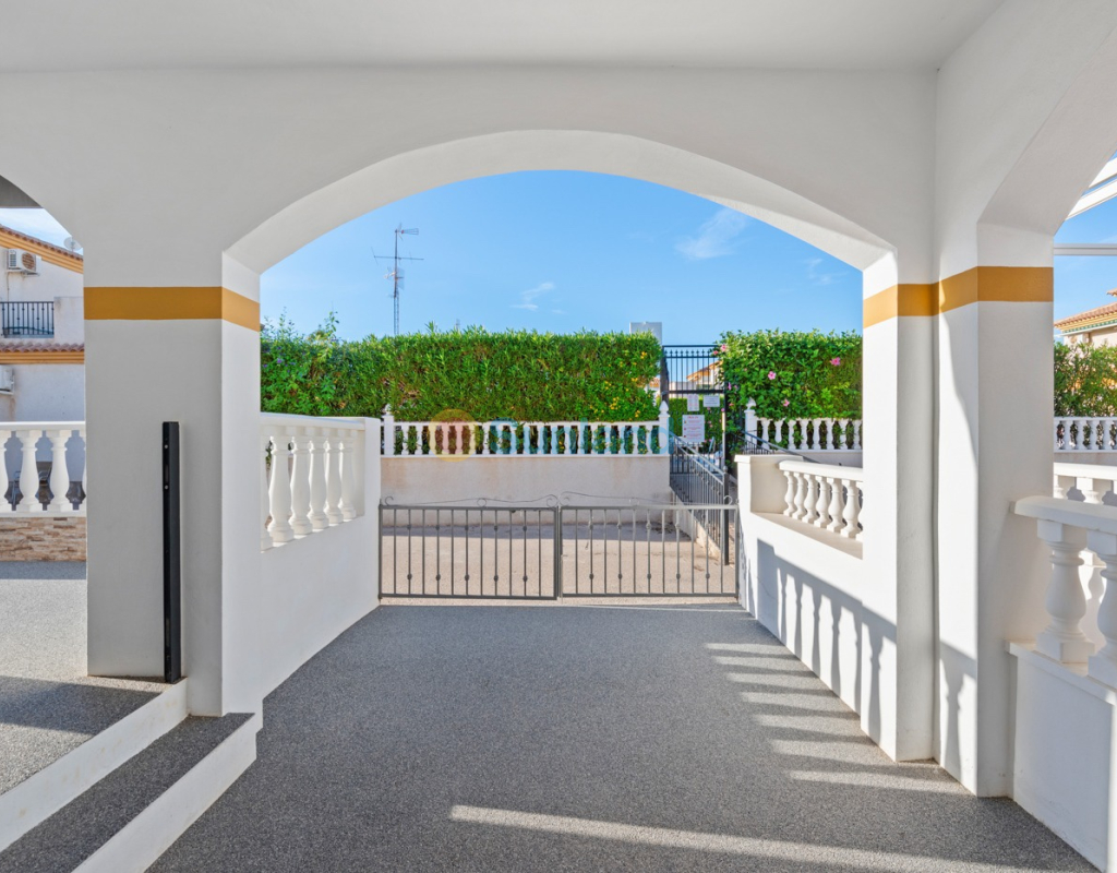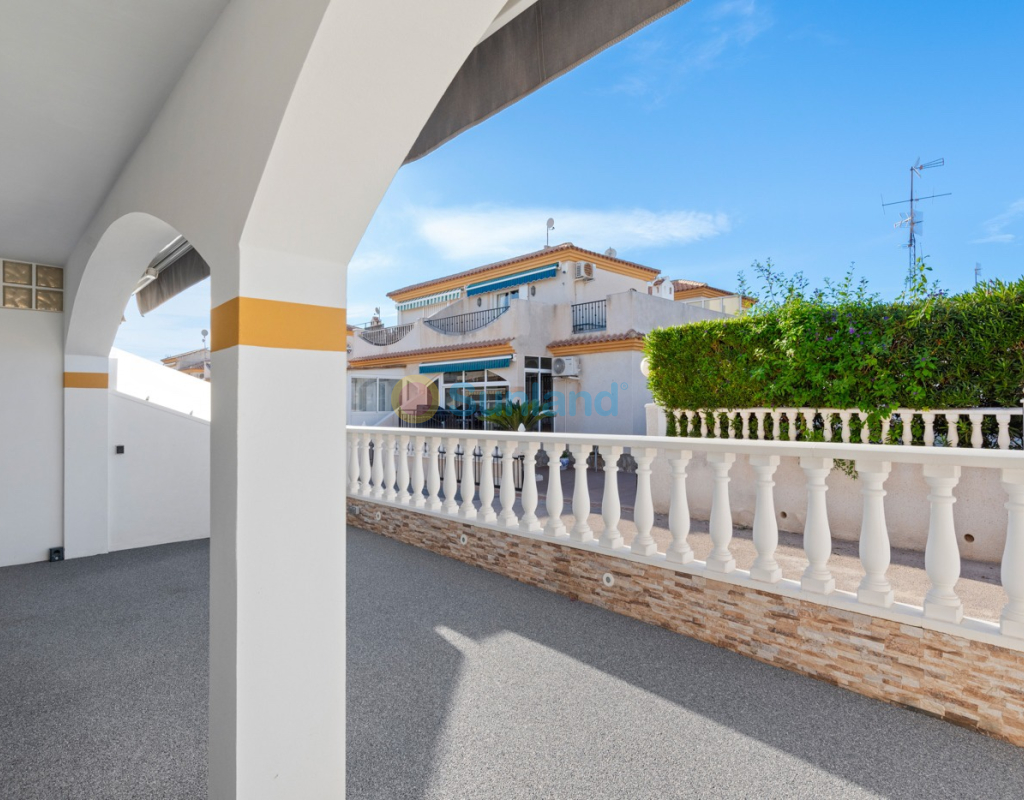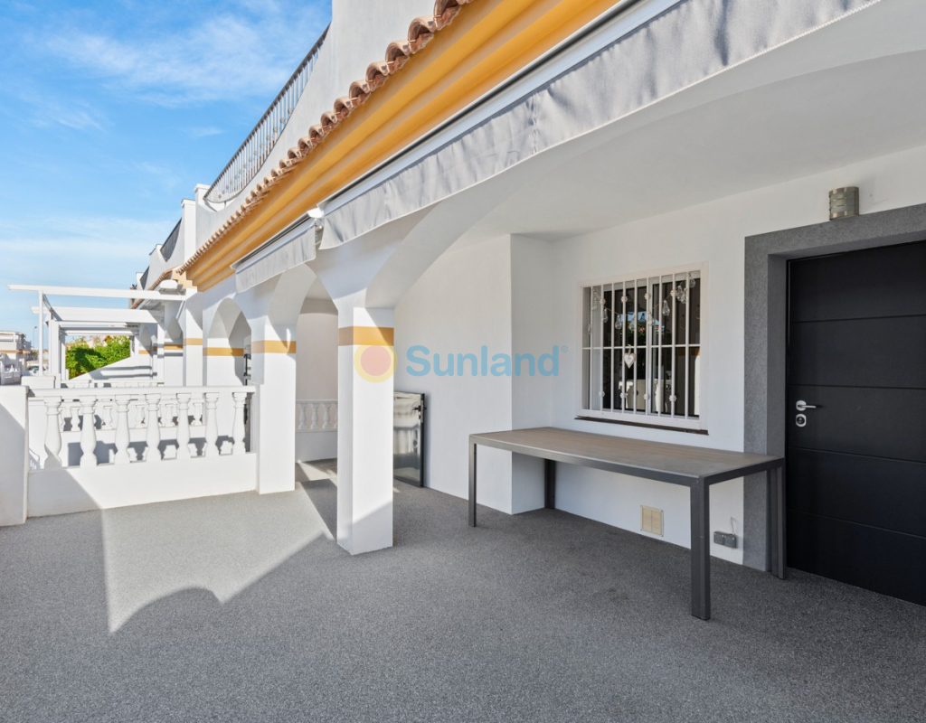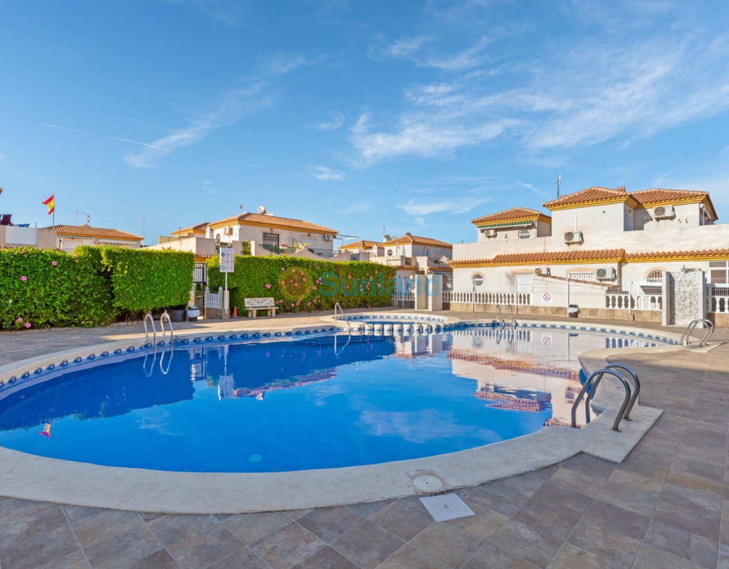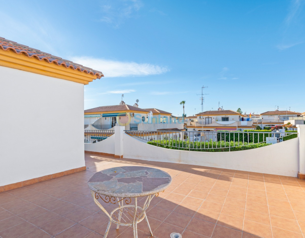 Beautiful property just 2.5 kilometres from the coast in Playa flamenca.This property has 2 full bedrooms, 2 bathrooms and an extra guest room with folding bed.The ground floor has an open plan fully equipped kitchen and a lounge with TV corner, another bedroom with bathroom and a storage room. The front door opens onto the spacious south-west facing terrace with adjacent car parking and access to the spacious garage. On the first floor we find the master bedroom with adjoining bathroom and through the hallway you enter a room where a bed can be folded open, through this room you also have access to the spacious roof terrace overlooking the beautiful communal swimming pool located directly opposite this sun-facing property.The house and terrace have recently been landscaped with new stone carpet which guarantees a clean look.Also just 200 metres away is an extensive sports park where you can play paddle, tennis, handball, basketball, athletics and football, among others, and there is also an indoor swimming pool. Details :- 3 bedrooms;- 2 bathrooms;- Communal swimming pool;- Terrace and roof terrace;- Private parking;- Garage. Distance to :- La Zenia Boulevard : 5 car minutes;- Beach : 5 car minutes;- Airport : 40 car minutes;- Golf : 10 car minutes;- Supermarket : 5 car minutes;- Café/restaurants : 8 walking minutes. Community fee; 300€ per yearIBI; 175€ per year