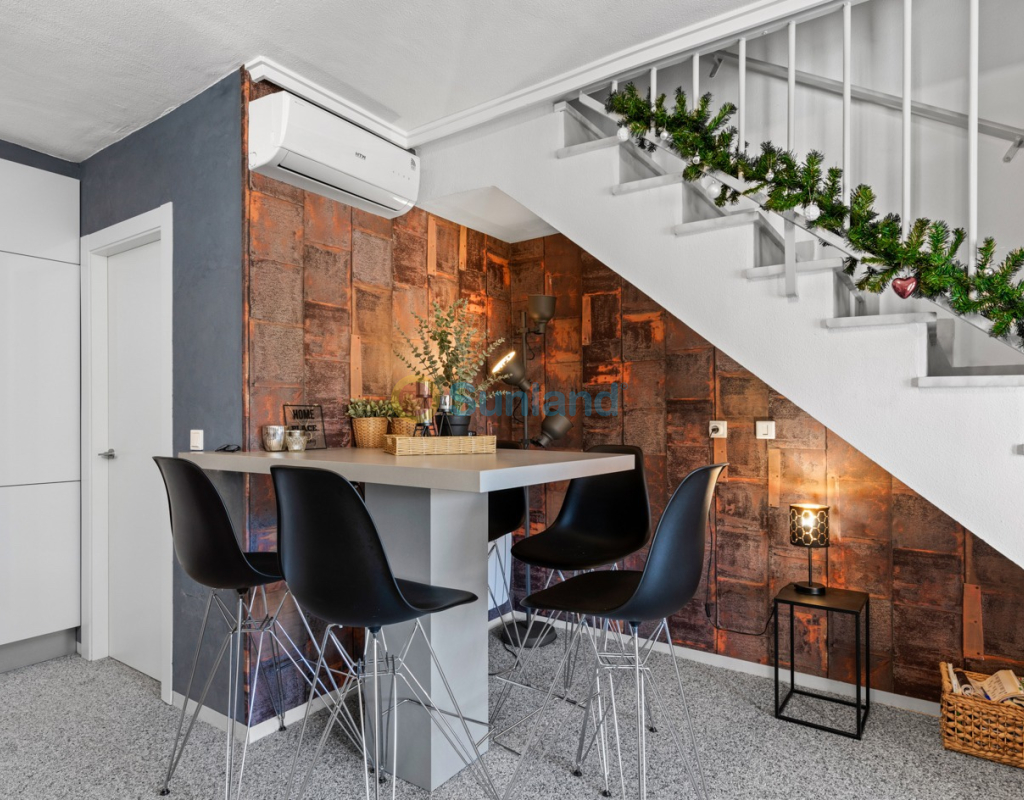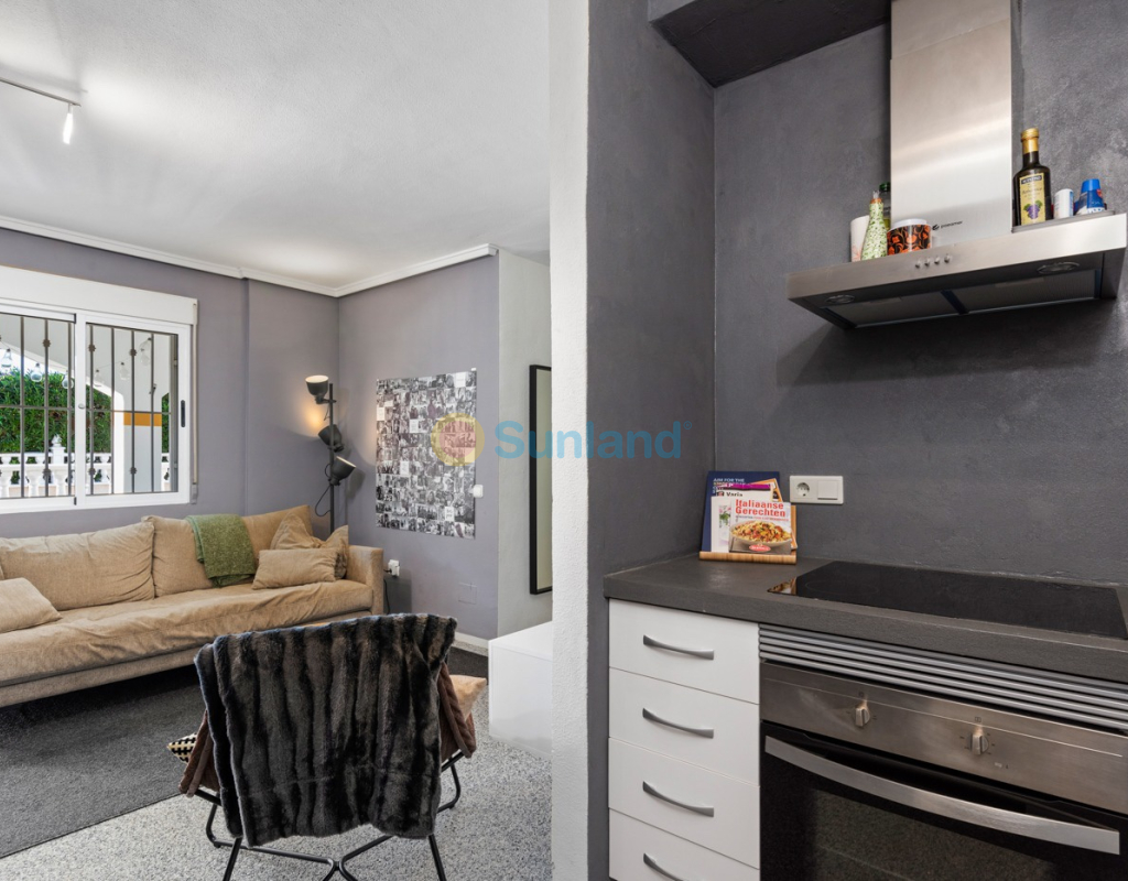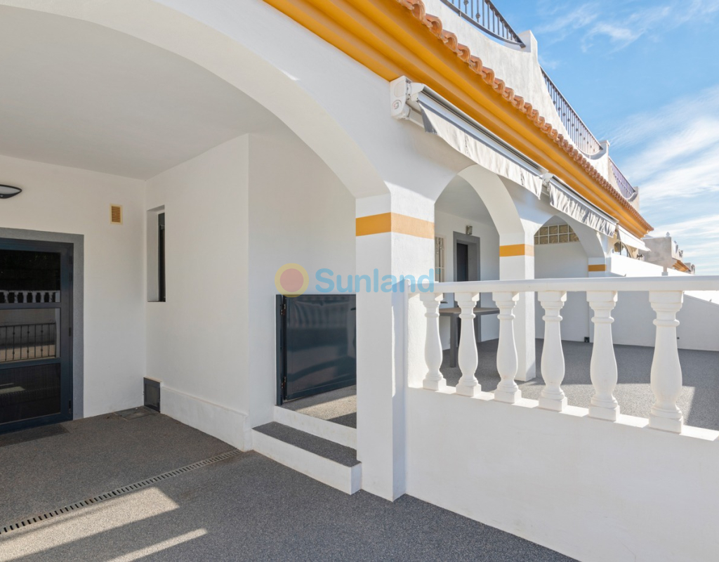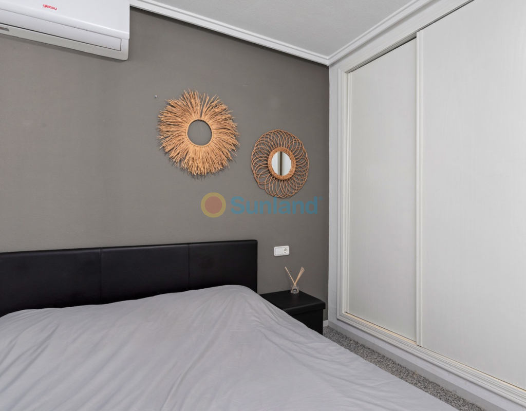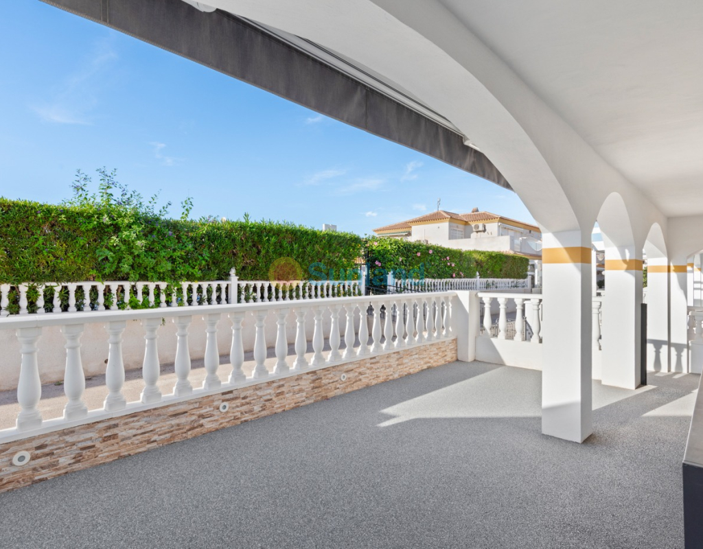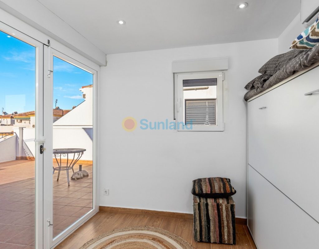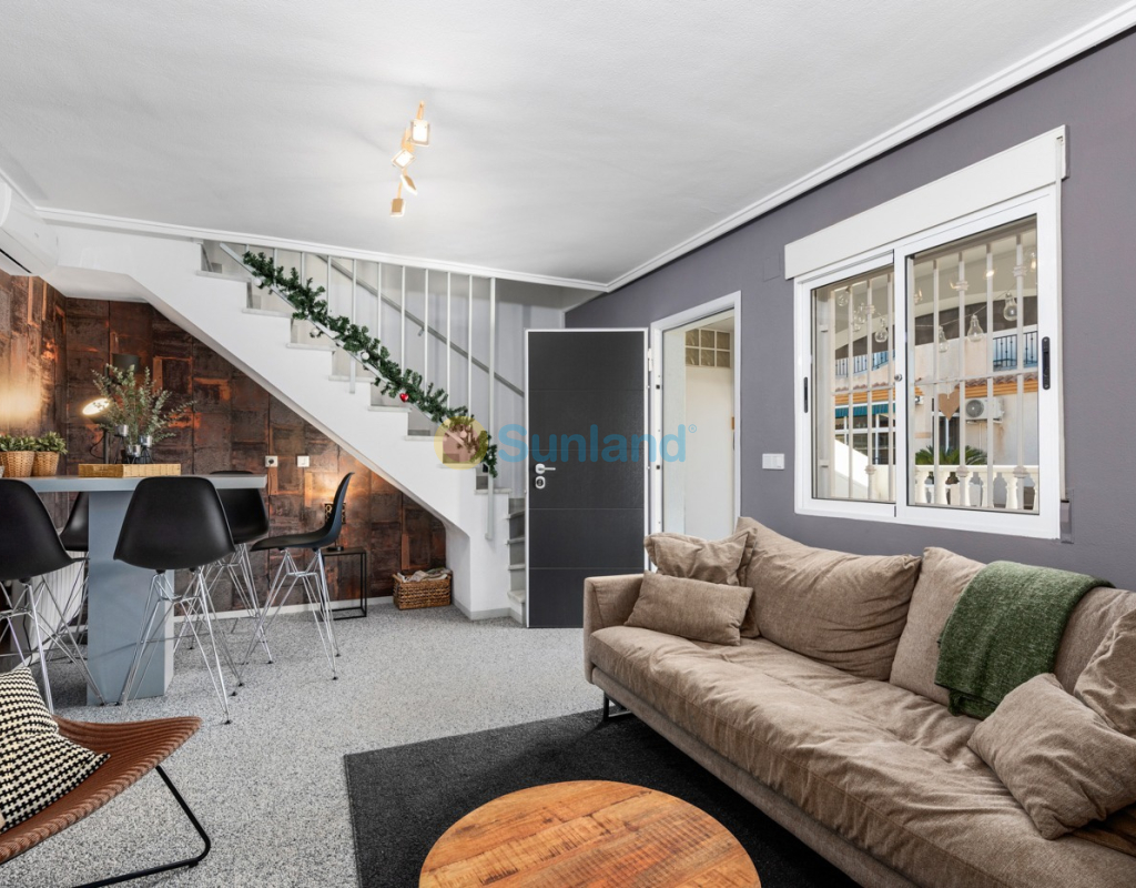 Beautiful property just 2.5 kilometres from the coast in Playa flamenca.This property has 2 full bedrooms, 2 bathrooms and an extra guest room with folding bed.The ground floor has an open plan fully equipped kitchen and a lounge with TV corner, another bedroom with bathroom and a storage room. The front door opens onto the spacious south-west facing terrace with adjacent car parking and access to the spacious garage. On the first floor we find the master bedroom with adjoining bathroom and through the hallway you enter a room where a bed can be folded open, through this room you also have access to the spacious roof terrace overlooking the beautiful communal swimming pool located directly opposite this sun-facing property.The house and terrace have recently been landscaped with new stone carpet which guarantees a clean look.Also just 200 metres away is an extensive sports park where you can play paddle, tennis, handball, basketball, athletics and football, among others, and there is also an indoor swimming pool. Details :- 3 bedrooms;- 2 bathrooms;- Communal swimming pool;- Terrace and roof terrace;- Private parking;- Garage. Distance to :- La Zenia Boulevard : 5 car minutes;- Beach : 5 car minutes;- Airport : 40 car minutes;- Golf : 10 car minutes;- Supermarket : 5 car minutes;- Café/restaurants : 8 walking minutes. Community fee; 300€ per yearIBI; 175€ per year