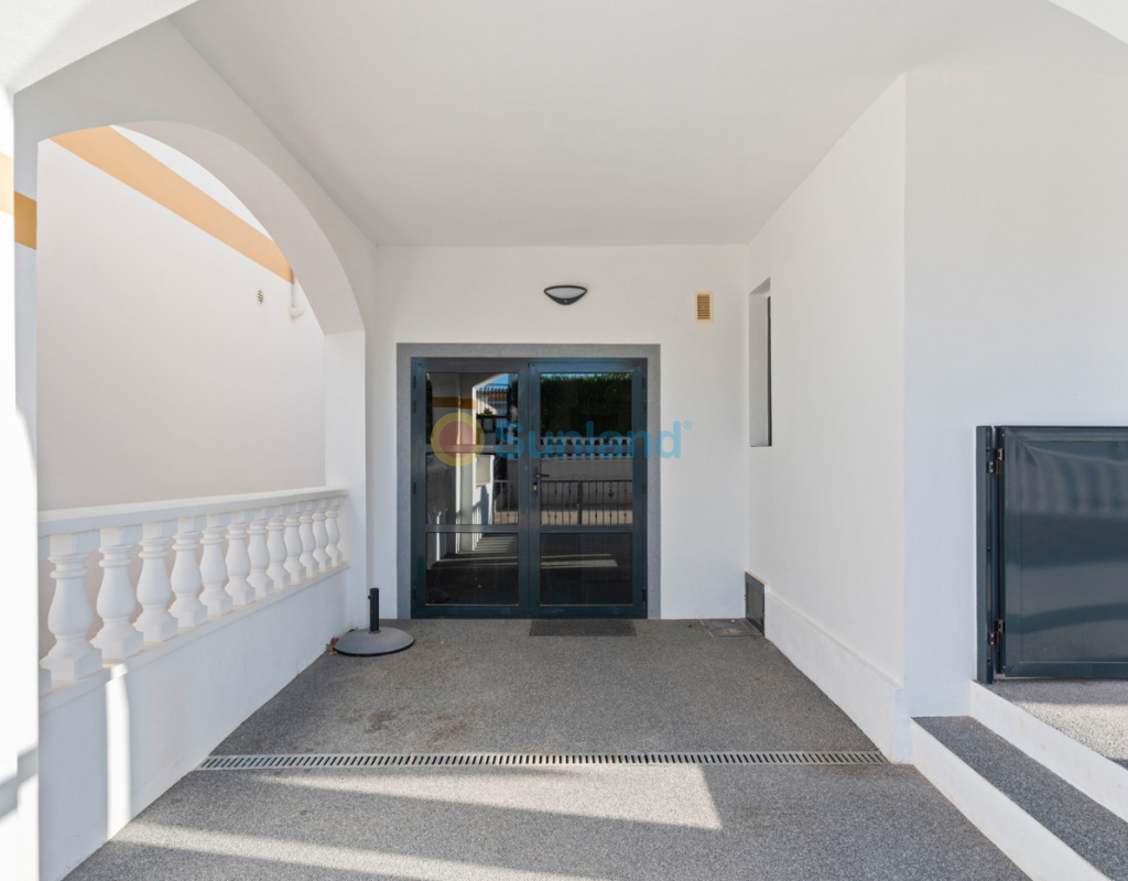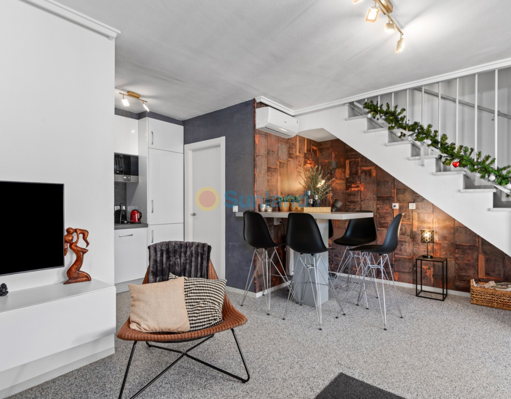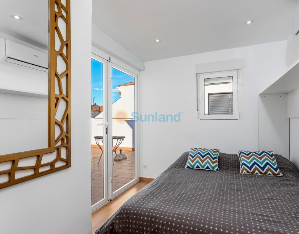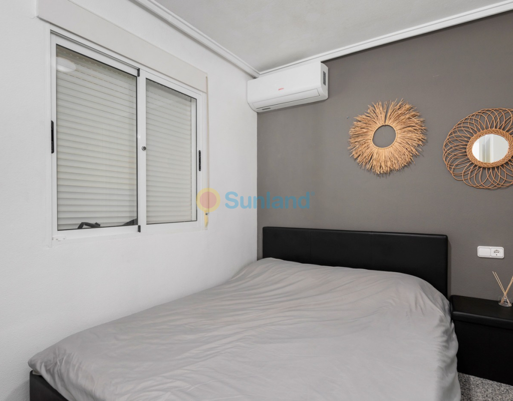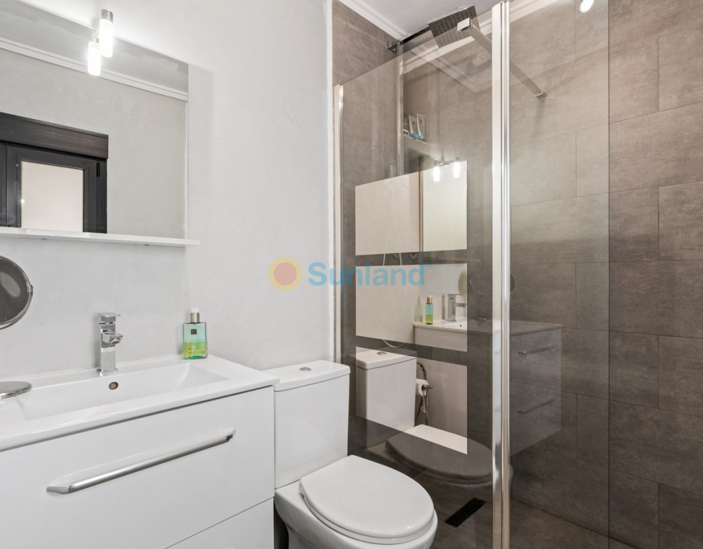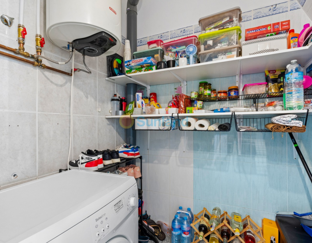 Beautiful property just 2.5 kilometres from the coast in Playa flamenca.This property has 2 full bedrooms, 2 bathrooms and an extra guest room with folding bed.The ground floor has an open plan fully equipped kitchen and a lounge with TV corner, another bedroom with bathroom and a storage room. The front door opens onto the spacious south-west facing terrace with adjacent car parking and access to the spacious garage. On the first floor we find the master bedroom with adjoining bathroom and through the hallway you enter a room where a bed can be folded open, through this room you also have access to the spacious roof terrace overlooking the beautiful communal swimming pool located directly opposite this sun-facing property.The house and terrace have recently been landscaped with new stone carpet which guarantees a clean look.Also just 200 metres away is an extensive sports park where you can play paddle, tennis, handball, basketball, athletics and football, among others, and there is also an indoor swimming pool. Details :- 3 bedrooms;- 2 bathrooms;- Communal swimming pool;- Terrace and roof terrace;- Private parking;- Garage. Distance to :- La Zenia Boulevard : 5 car minutes;- Beach : 5 car minutes;- Airport : 40 car minutes;- Golf : 10 car minutes;- Supermarket : 5 car minutes;- Café/restaurants : 8 walking minutes. Community fee; 300€ per yearIBI; 175€ per year