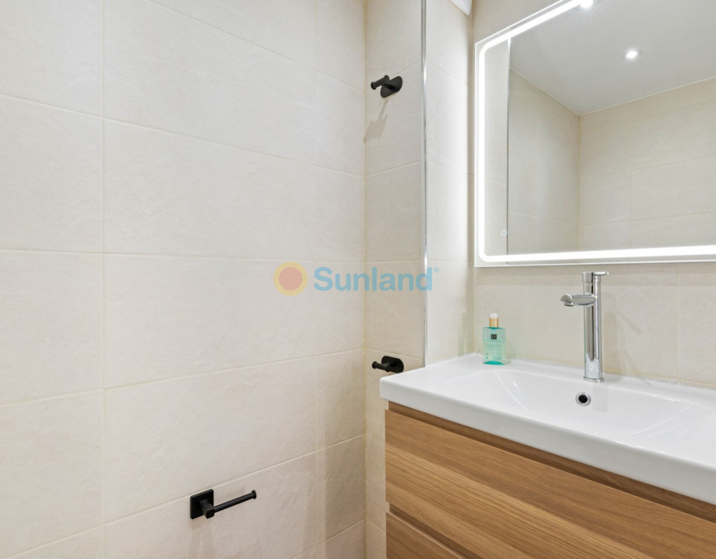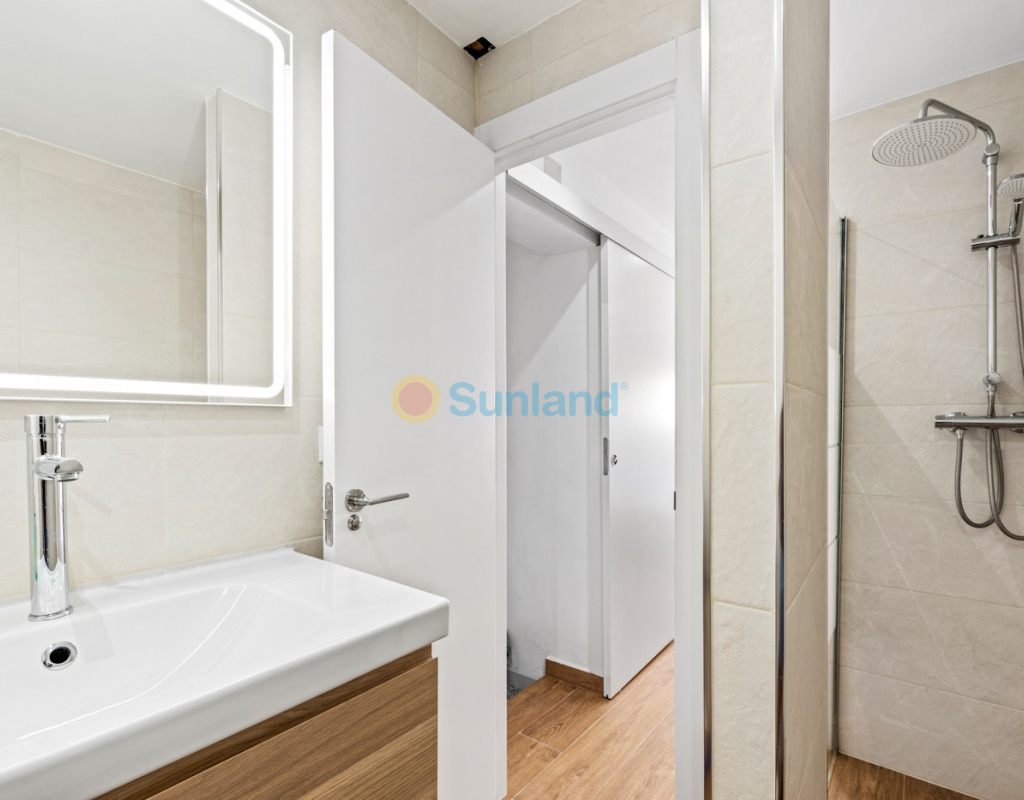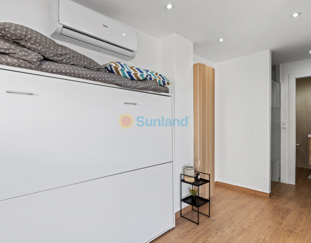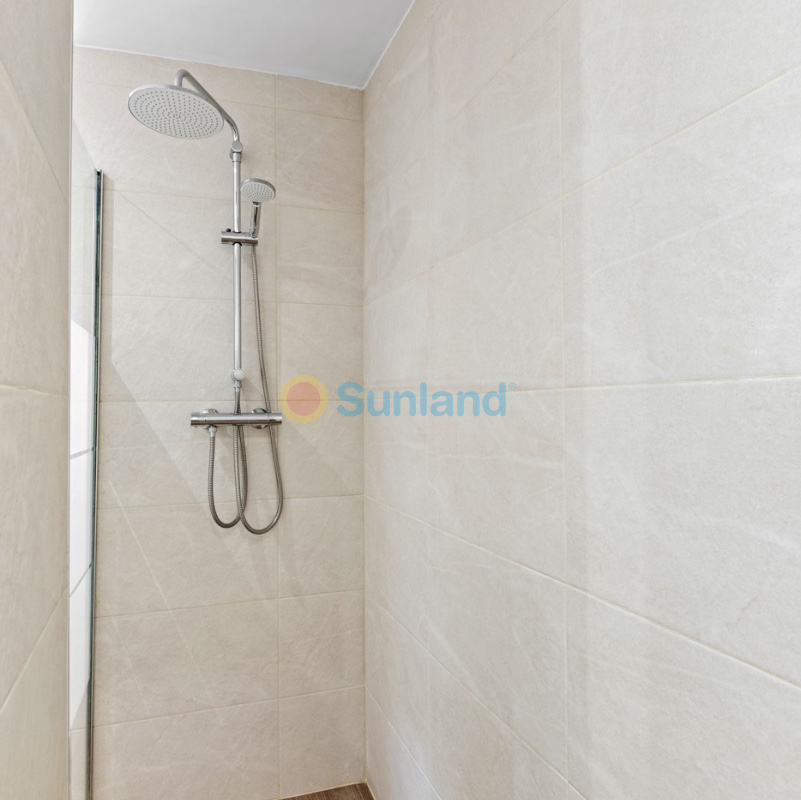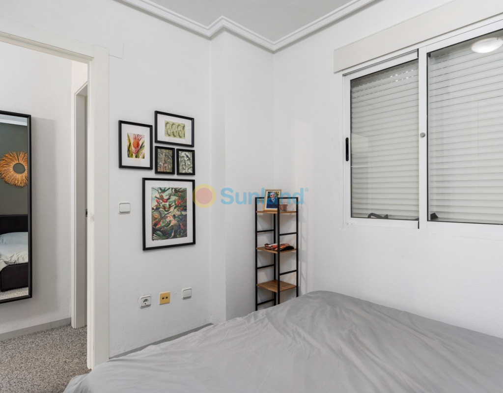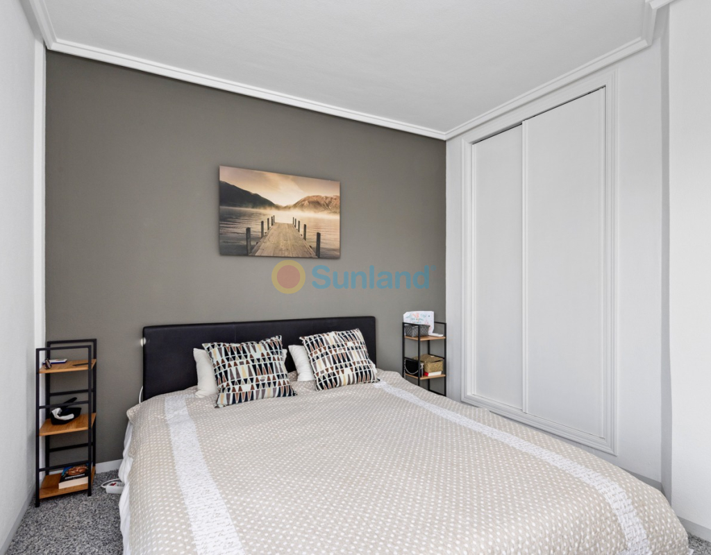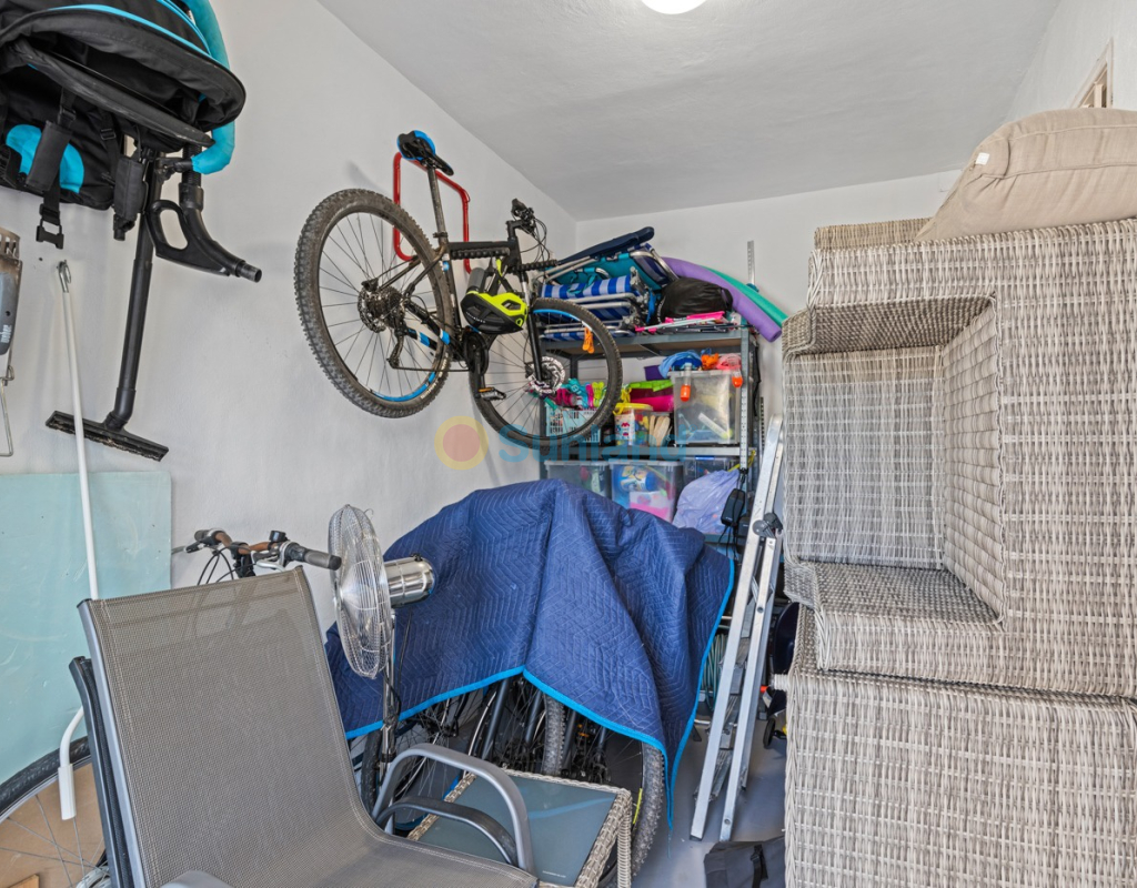 Beautiful property just 2.5 kilometres from the coast in Playa flamenca.This property has 2 full bedrooms, 2 bathrooms and an extra guest room with folding bed.The ground floor has an open plan fully equipped kitchen and a lounge with TV corner, another bedroom with bathroom and a storage room. The front door opens onto the spacious south-west facing terrace with adjacent car parking and access to the spacious garage. On the first floor we find the master bedroom with adjoining bathroom and through the hallway you enter a room where a bed can be folded open, through this room you also have access to the spacious roof terrace overlooking the beautiful communal swimming pool located directly opposite this sun-facing property.The house and terrace have recently been landscaped with new stone carpet which guarantees a clean look.Also just 200 metres away is an extensive sports park where you can play paddle, tennis, handball, basketball, athletics and football, among others, and there is also an indoor swimming pool. Details :- 3 bedrooms;- 2 bathrooms;- Communal swimming pool;- Terrace and roof terrace;- Private parking;- Garage. Distance to :- La Zenia Boulevard : 5 car minutes;- Beach : 5 car minutes;- Airport : 40 car minutes;- Golf : 10 car minutes;- Supermarket : 5 car minutes;- Café/restaurants : 8 walking minutes. Community fee; 300€ per yearIBI; 175€ per year
