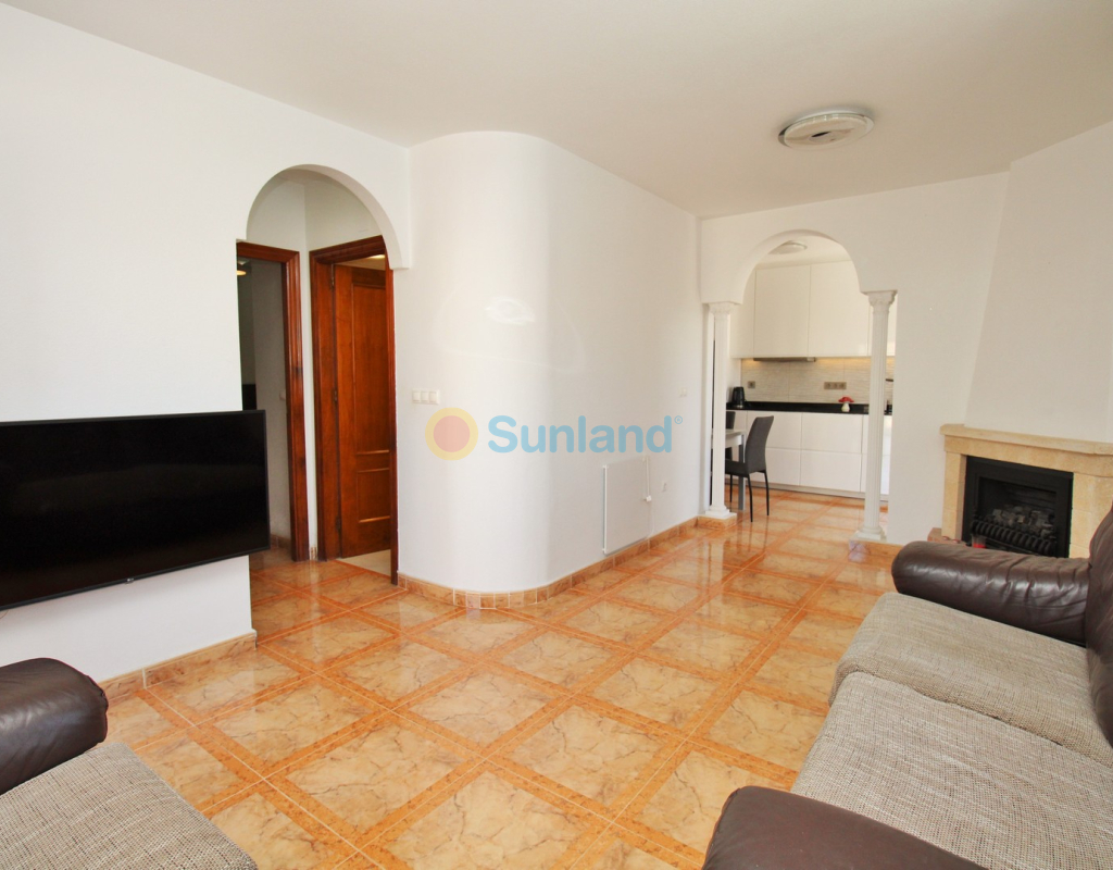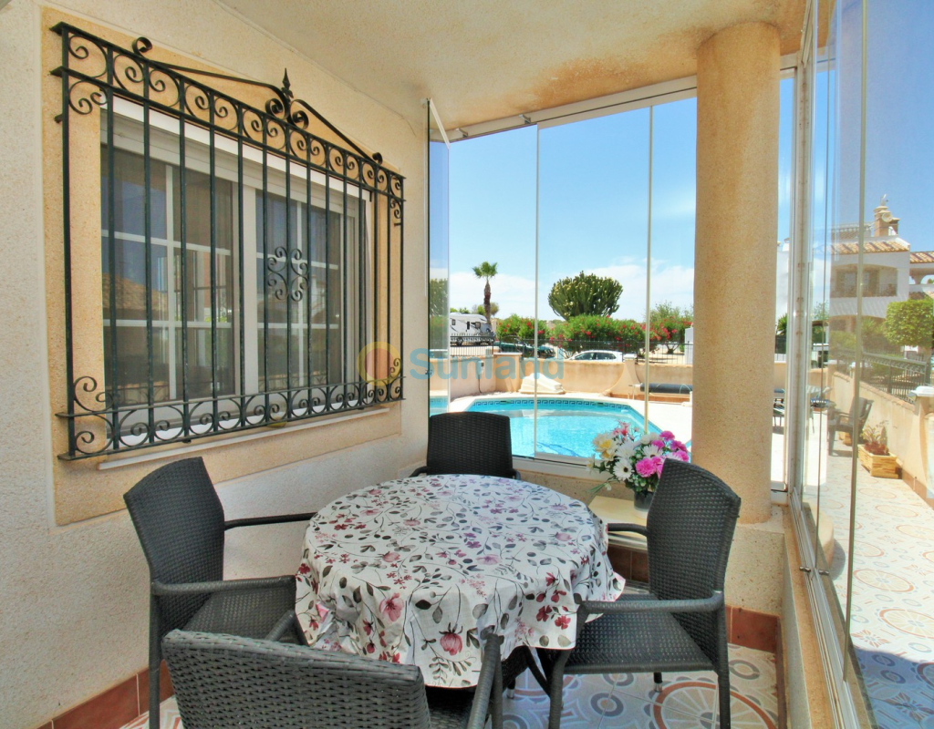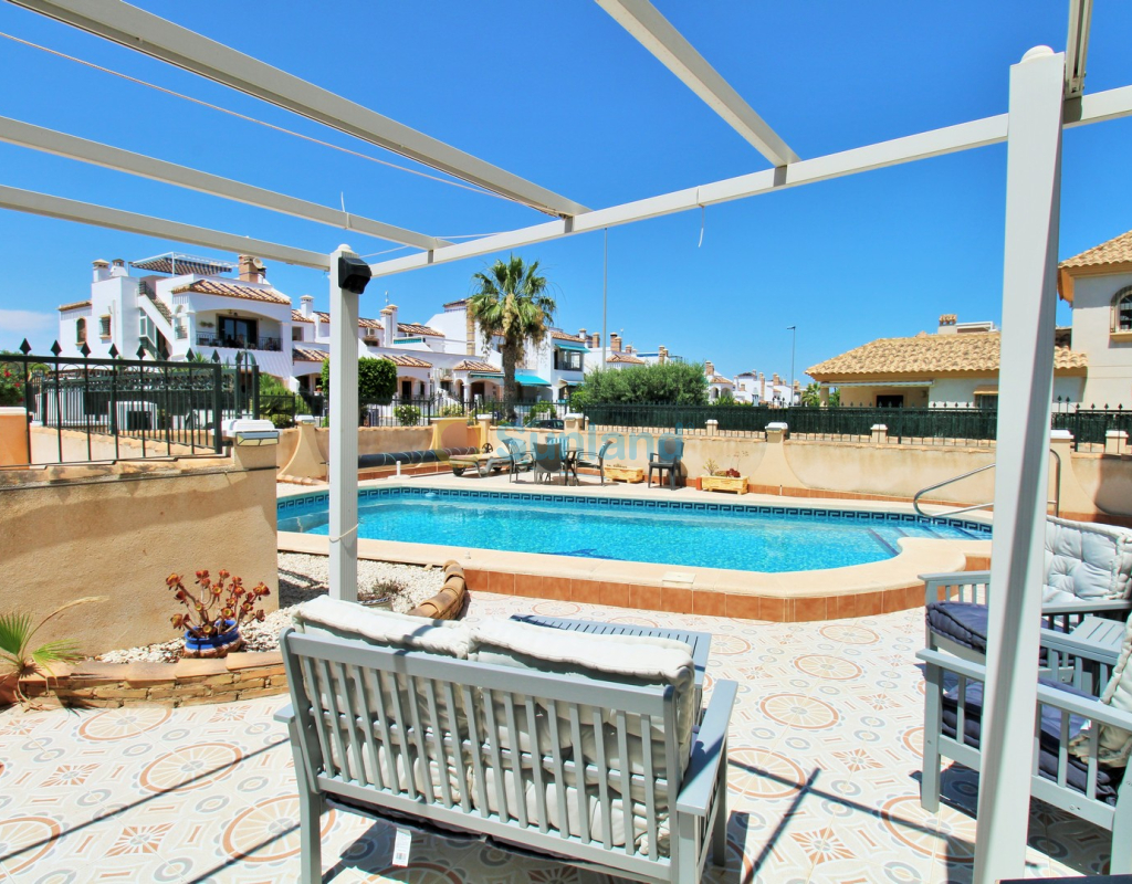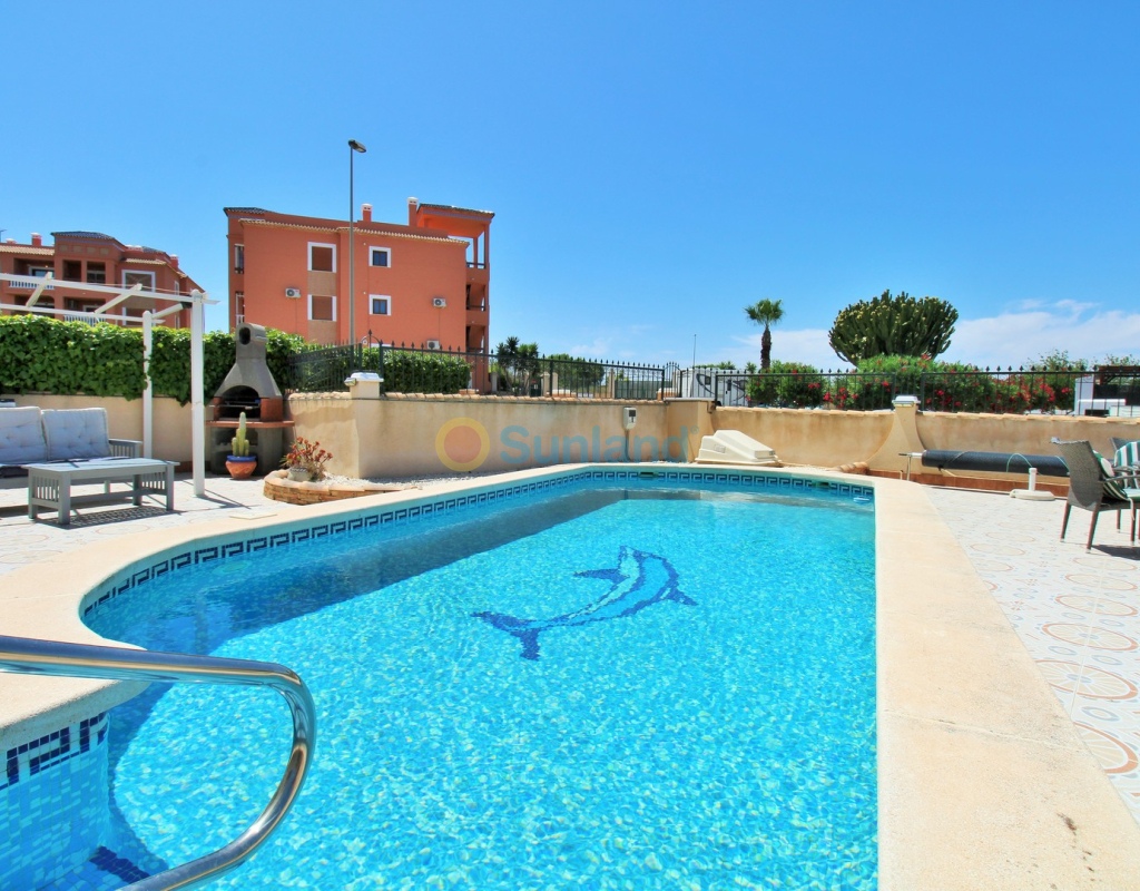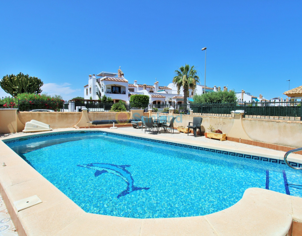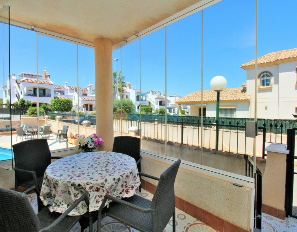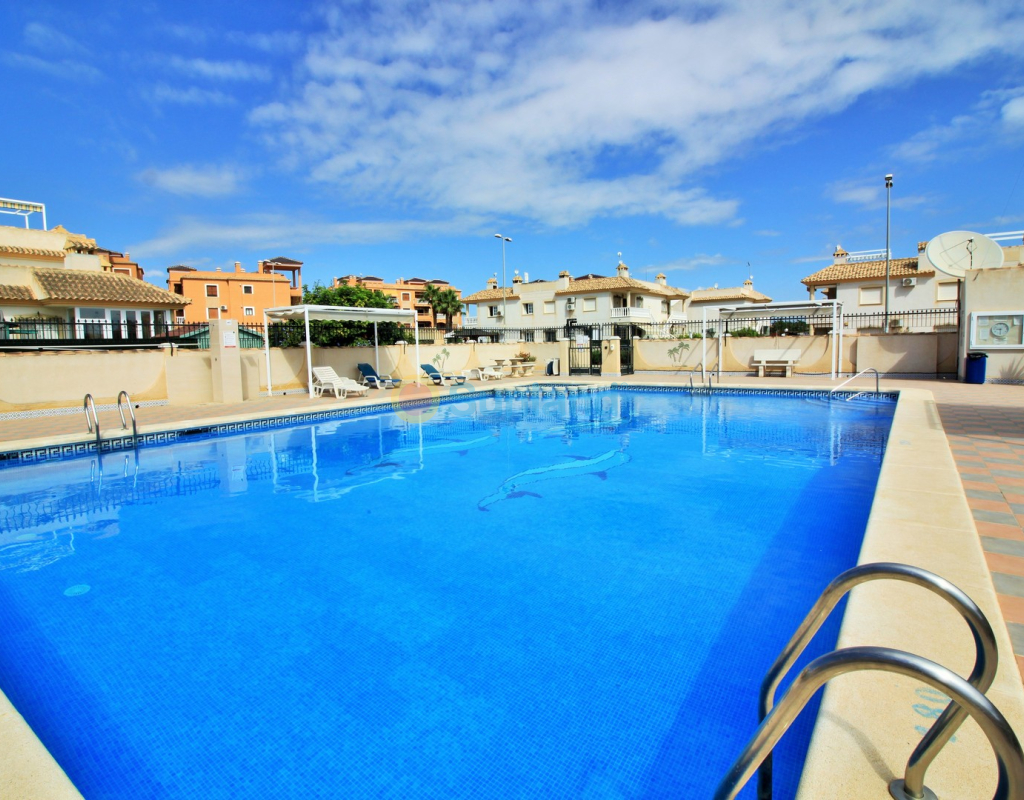 A beautifully maintained two-bedroom ground floor apartment with a generous private garden and swimming pool, located in the sought-after Sol Golf I community in Pau 8, Villamartin. Just a short 10-minute stroll brings you to the renowned Villamartin Plaza and golf course, home to a wide selection of restaurants, bars, and a supermarket. The apartment features a spacious tiled garden with a private 10x5m swimming pool and a covered terrace with glass curtains, offering an ideal space for year-round outdoor living. Inside, the property offers a bright and inviting lounge with feature fireplace, leading through to a modernised kitchen and separate utility room. There is also a convenient shower room adjacent to the kitchen, along with direct access to the garden and an electric blind for added comfort. A small hallway leads to two double bedrooms, both with fitted wardrobes, and a contemporary family bathroom with walk-in shower. The apartment is presented in excellent condition, having been carefully looked after by the current owners. Additional features include air conditioning, high-speed fibre optic internet (FTTH) – ideal for remote working – and is being sold furnished, including white goods. Sol Golf I enjoys a prime location at the entrance of Pau 8, offering a communal swimming pool, and one of the shortest walks to the Plaza and golf course. Public transport is easily accessible, with a bus stop and taxi rank nearby. The beaches of the Orihuela Costa and Zenia Boulevard shopping centre are just a five-minute drive away. Viewings available in person or remotely – get in touch to arrange yours today.