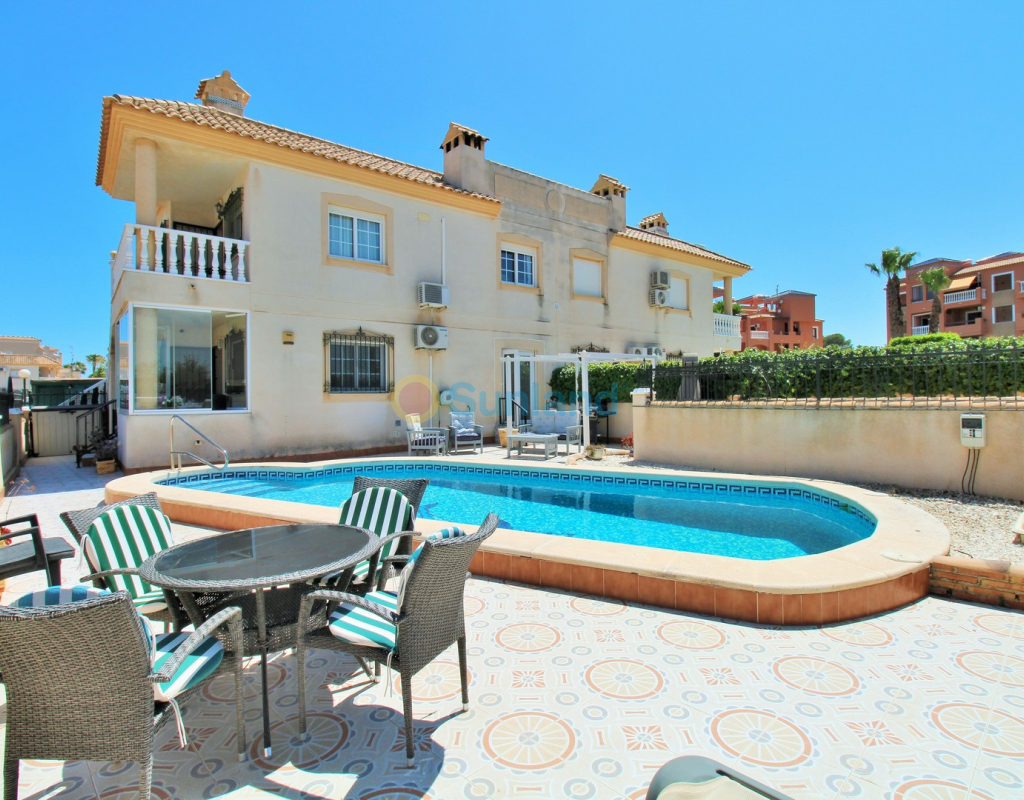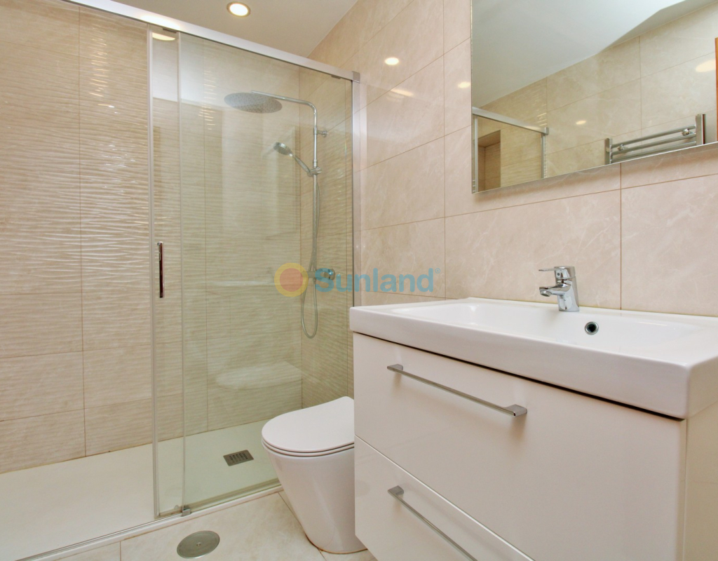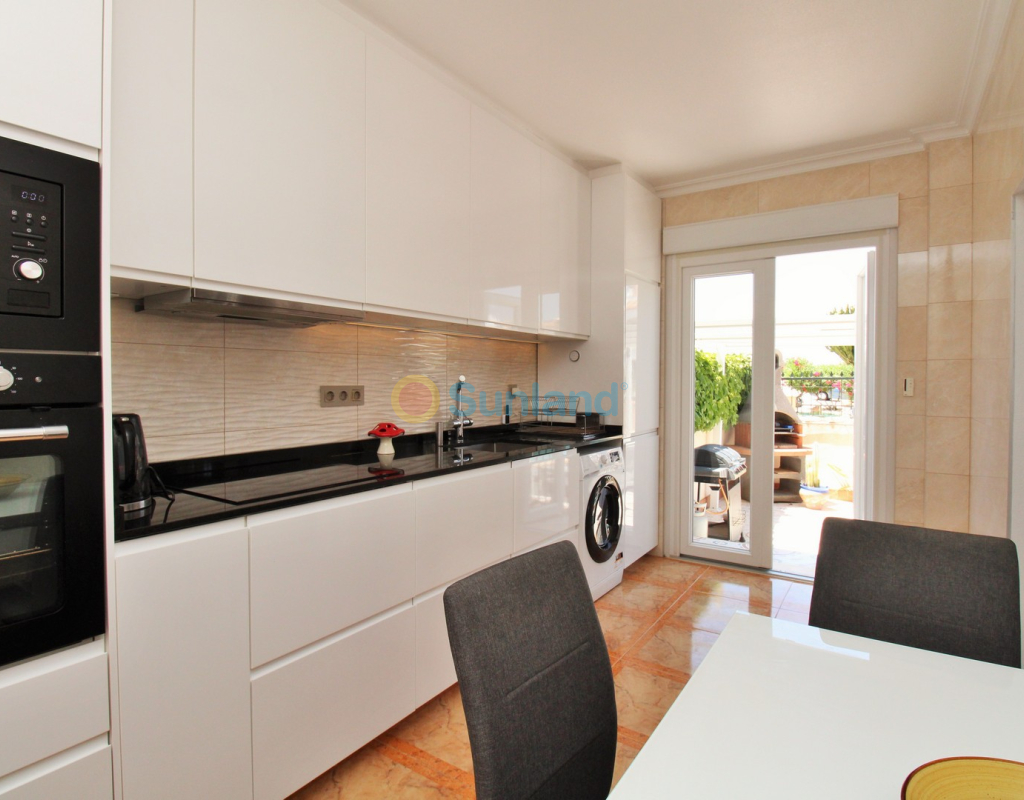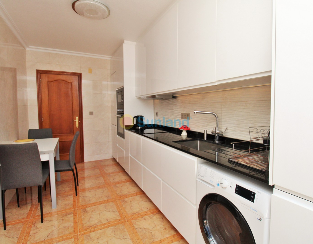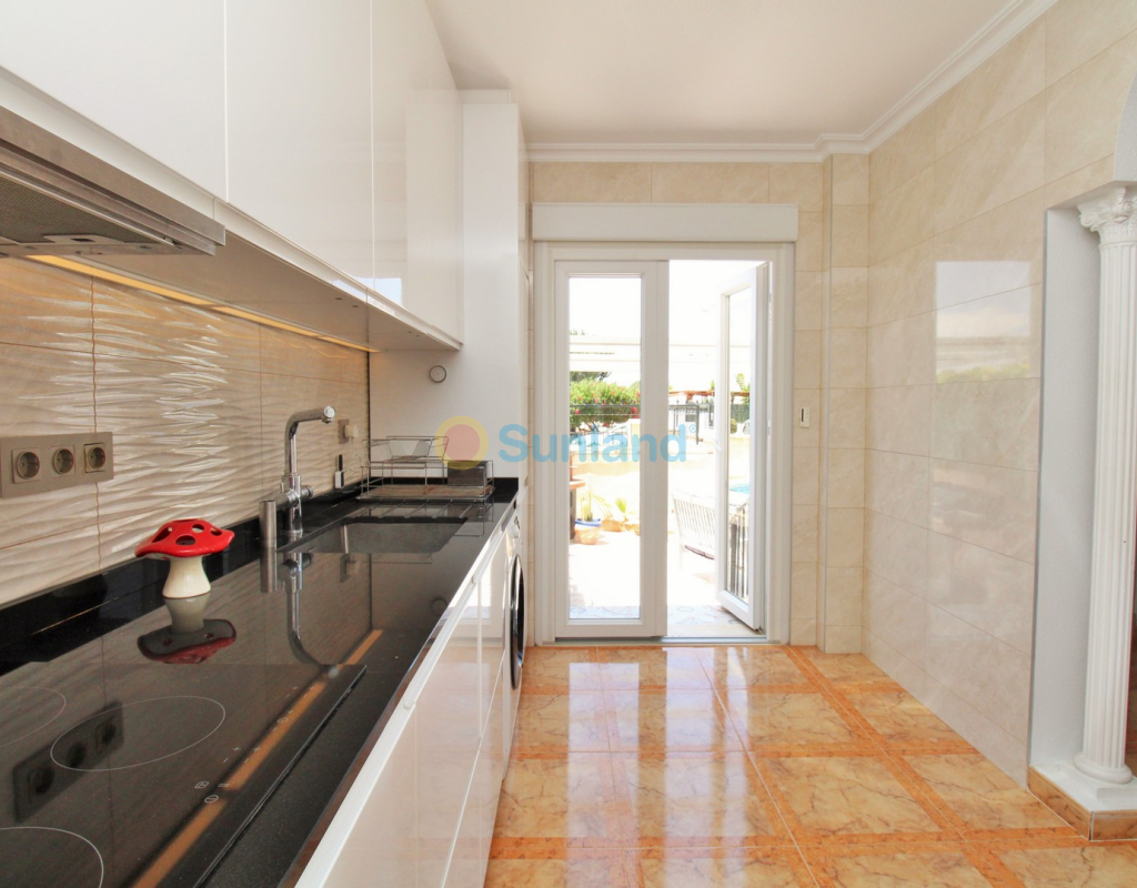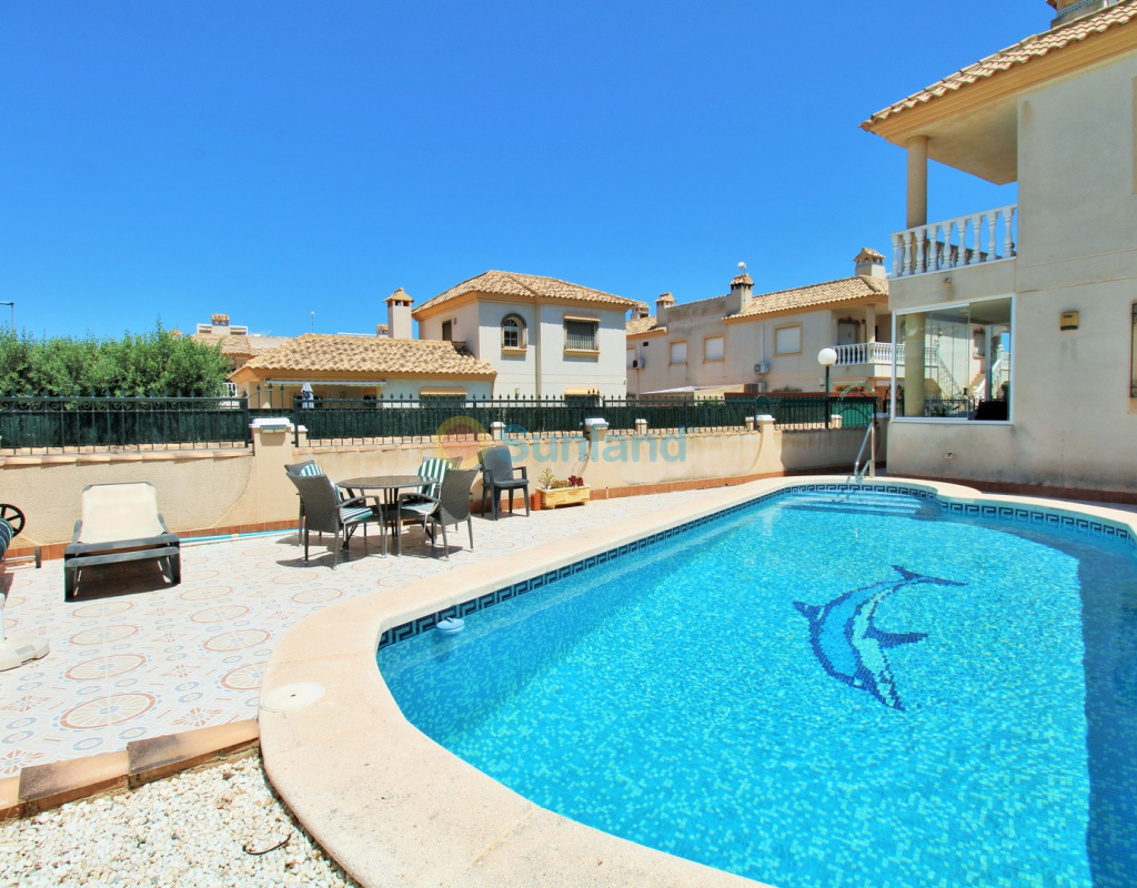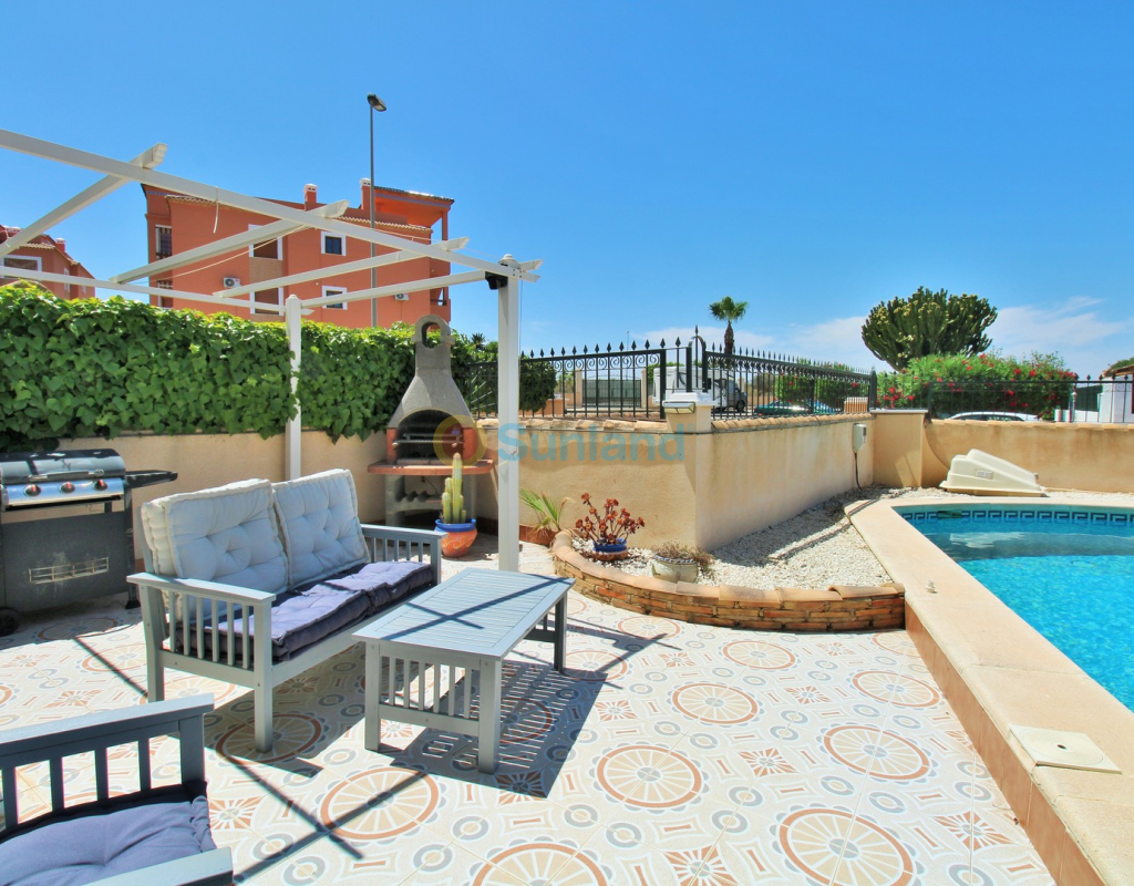 A beautifully maintained two-bedroom ground floor apartment with a generous private garden and swimming pool, located in the sought-after Sol Golf I community in Pau 8, Villamartin. Just a short 10-minute stroll brings you to the renowned Villamartin Plaza and golf course, home to a wide selection of restaurants, bars, and a supermarket. The apartment features a spacious tiled garden with a private 10x5m swimming pool and a covered terrace with glass curtains, offering an ideal space for year-round outdoor living. Inside, the property offers a bright and inviting lounge with feature fireplace, leading through to a modernised kitchen and separate utility room. There is also a convenient shower room adjacent to the kitchen, along with direct access to the garden and an electric blind for added comfort. A small hallway leads to two double bedrooms, both with fitted wardrobes, and a contemporary family bathroom with walk-in shower. The apartment is presented in excellent condition, having been carefully looked after by the current owners. Additional features include air conditioning, high-speed fibre optic internet (FTTH) – ideal for remote working – and is being sold furnished, including white goods. Sol Golf I enjoys a prime location at the entrance of Pau 8, offering a communal swimming pool, and one of the shortest walks to the Plaza and golf course. Public transport is easily accessible, with a bus stop and taxi rank nearby. The beaches of the Orihuela Costa and Zenia Boulevard shopping centre are just a five-minute drive away. Viewings available in person or remotely – get in touch to arrange yours today.