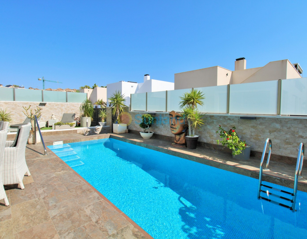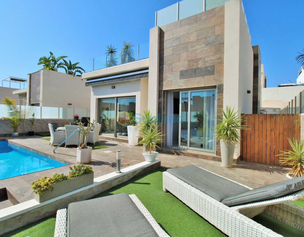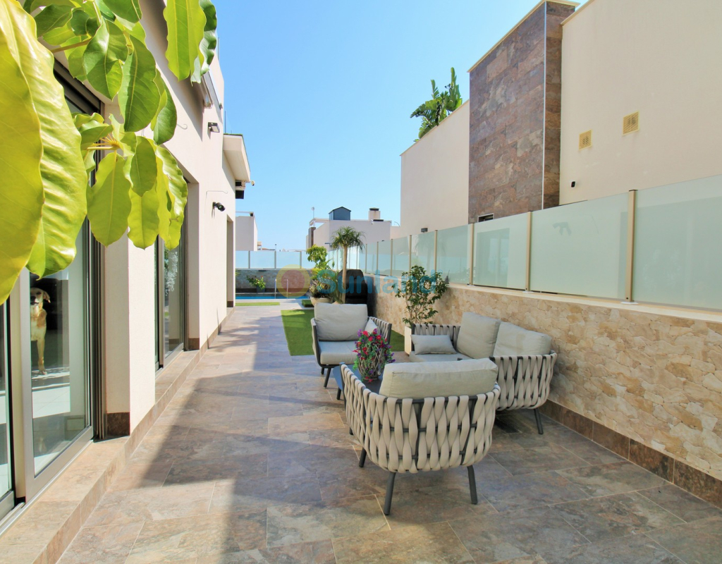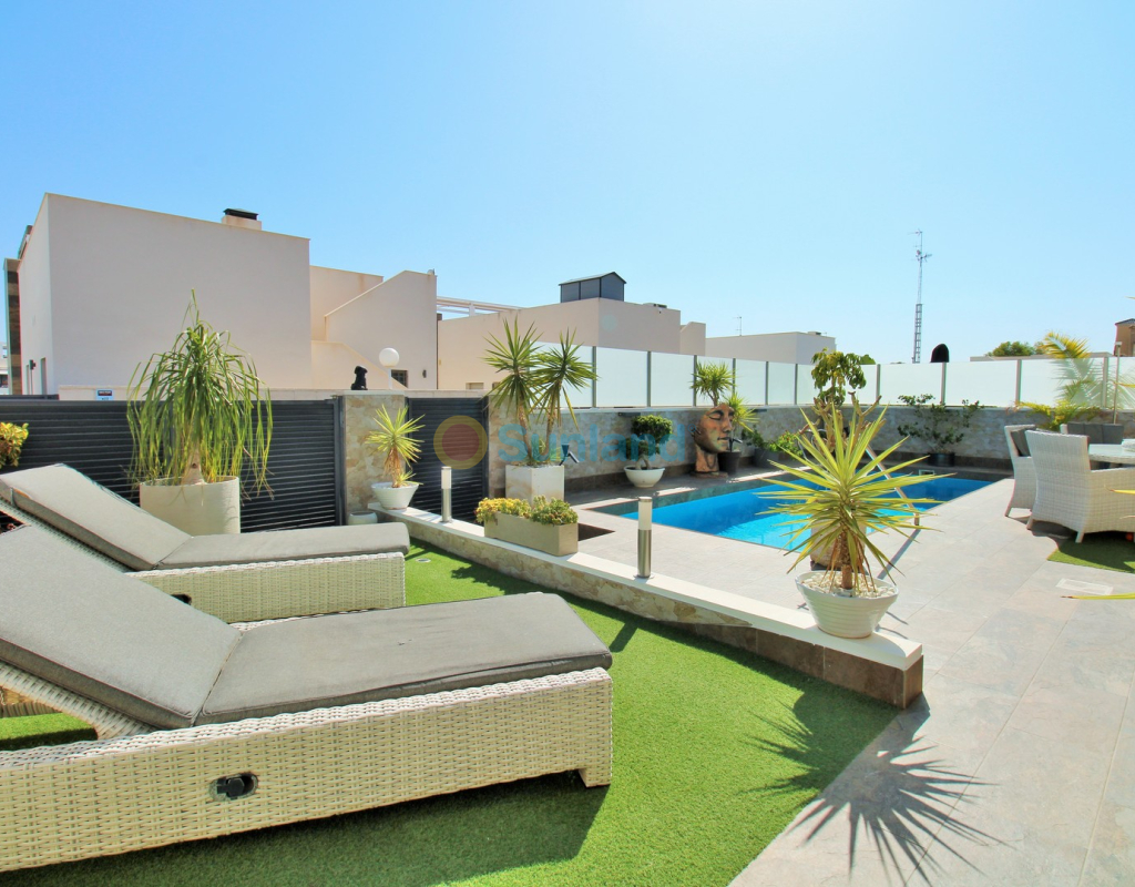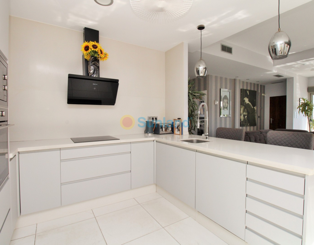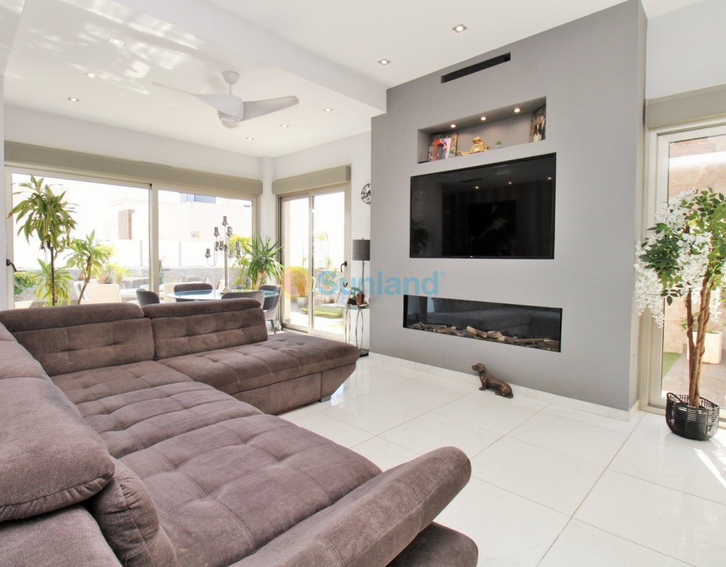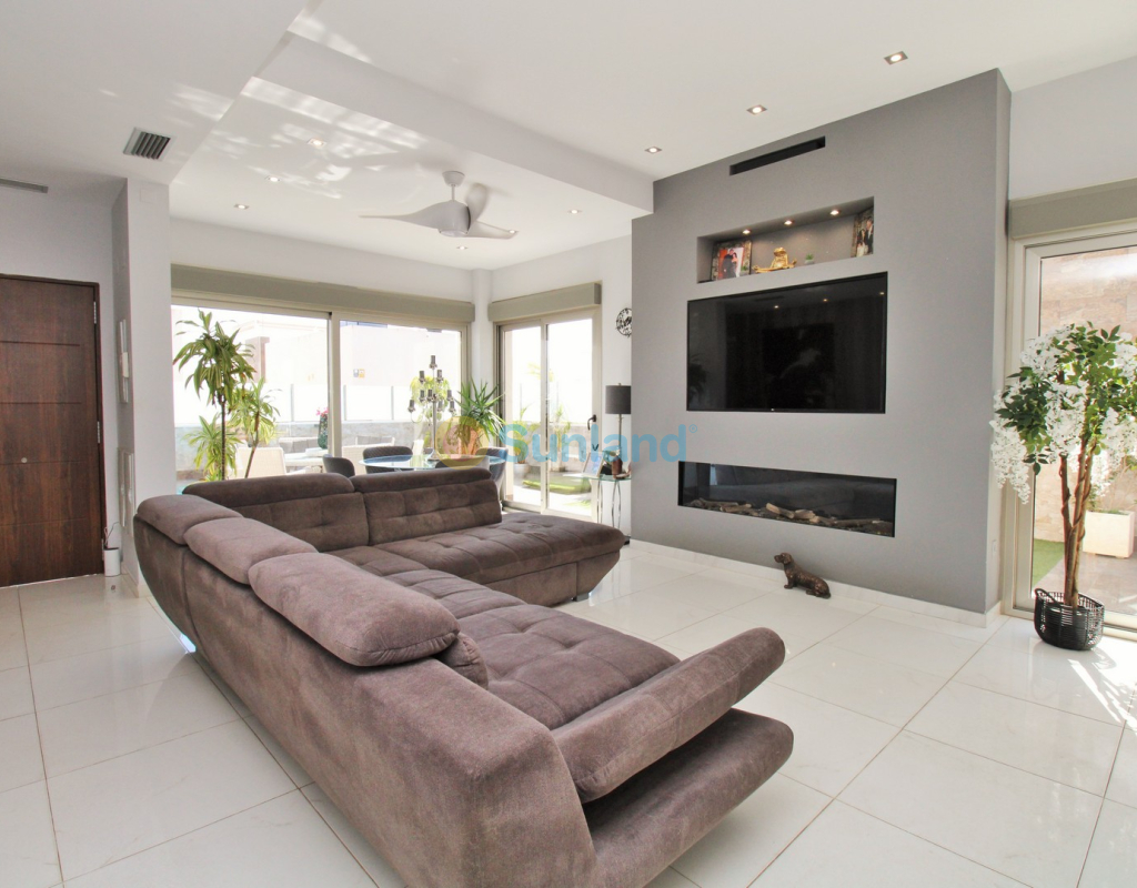 This beautifully presented 4-bedroom Innova villa is located in a sought-after area of Villamartin, just a short drive from local amenities. Designed for comfortable single-level living, the property boasts a private swimming pool, off-road parking, and a spacious L-shaped garden—ideal for relaxing or entertaining guests. The interior features a large, bright open-plan living and dining area, seamlessly connected to a modern American-style kitchen with sleek built-in appliances. A separate utility room provides added practicality. The villa offers 4 well-sized bedrooms and 2.5 bathrooms, with the potential to easily convert the guest WC into a full third bathroom, as pre-installation for a walk-in shower is already in place. This home is filled with natural light thanks to large windows and high ceilings, and includes ducted hot and cold air-conditioning for year-round comfort. Electric blinds throughout allow for easy control of light and privacy. One of the standout features of this property is the expansive roof solarium, covering the full footprint of the house. It includes a stylish bar area, electric awnings with built-in wind sensors that automatically retract, and modern glass balustrades offering both safety and privacy—making it the perfect spot to enjoy the sun or entertain in total seclusion. Situated just 1km from an ALDI supermarket and the Via Park commercial centre, with a wide range of bars and restaurants close by, the villa is also only a short drive to the popular Villamartin Plaza and golf course. Thoughtfully designed and exceptionally well-located, this villa offers a blend of modern comfort, low-maintenance living, and Mediterranean charm.