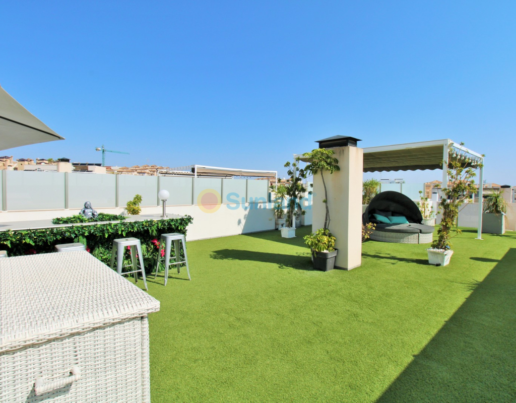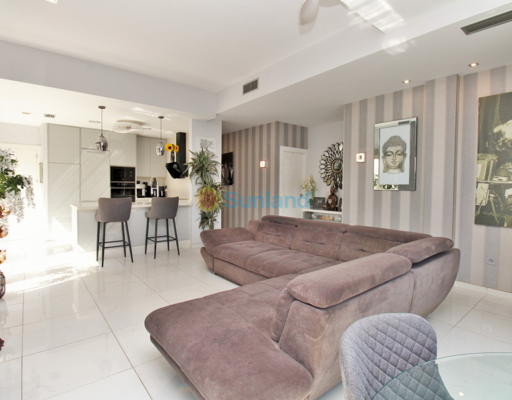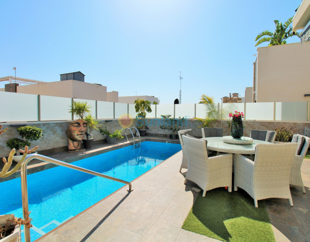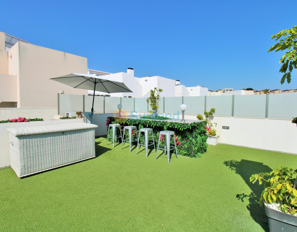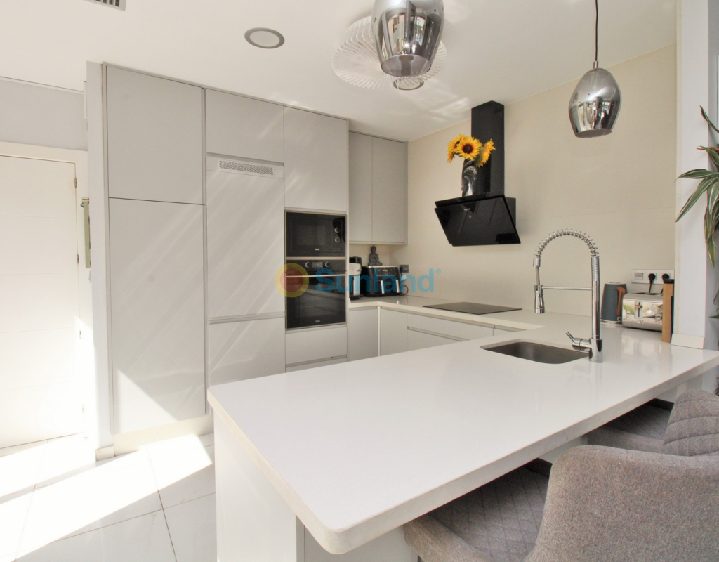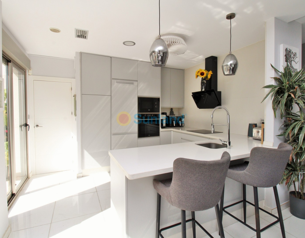 This beautifully presented 4-bedroom Innova villa is located in a sought-after area of Villamartin, just a short drive from local amenities. Designed for comfortable single-level living, the property boasts a private swimming pool, off-road parking, and a spacious L-shaped garden—ideal for relaxing or entertaining guests. The interior features a large, bright open-plan living and dining area, seamlessly connected to a modern American-style kitchen with sleek built-in appliances. A separate utility room provides added practicality. The villa offers 4 well-sized bedrooms and 2.5 bathrooms, with the potential to easily convert the guest WC into a full third bathroom, as pre-installation for a walk-in shower is already in place. This home is filled with natural light thanks to large windows and high ceilings, and includes ducted hot and cold air-conditioning for year-round comfort. Electric blinds throughout allow for easy control of light and privacy. One of the standout features of this property is the expansive roof solarium, covering the full footprint of the house. It includes a stylish bar area, electric awnings with built-in wind sensors that automatically retract, and modern glass balustrades offering both safety and privacy—making it the perfect spot to enjoy the sun or entertain in total seclusion. Situated just 1km from an ALDI supermarket and the Via Park commercial centre, with a wide range of bars and restaurants close by, the villa is also only a short drive to the popular Villamartin Plaza and golf course. Thoughtfully designed and exceptionally well-located, this villa offers a blend of modern comfort, low-maintenance living, and Mediterranean charm.