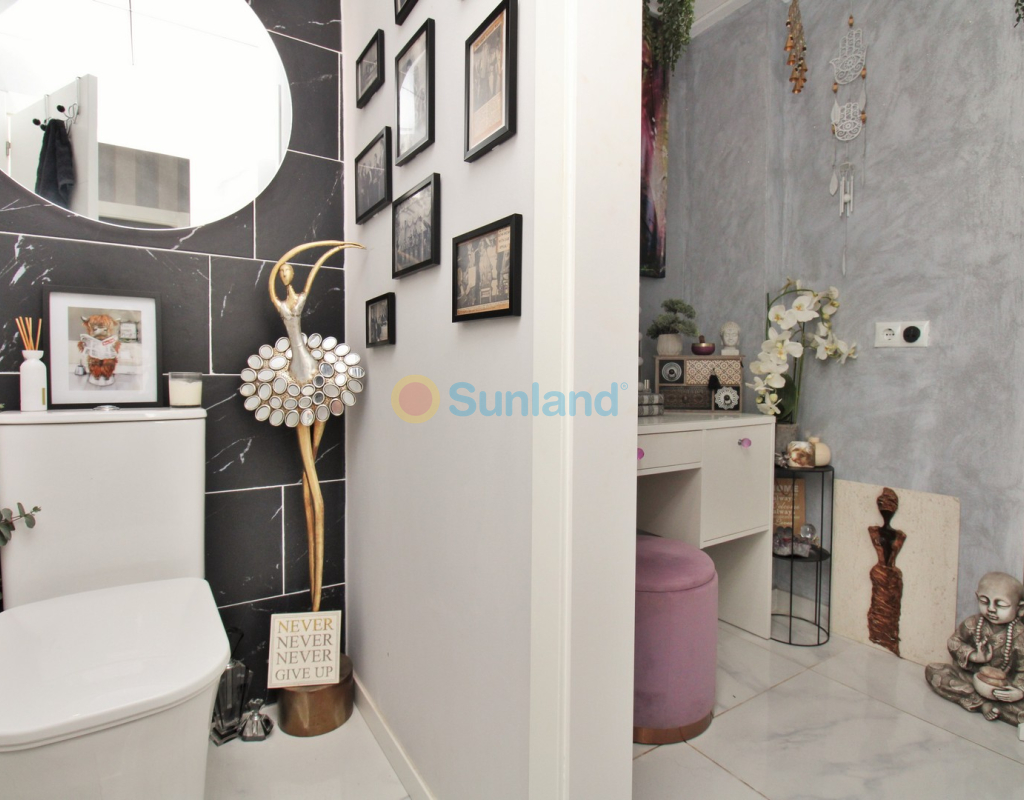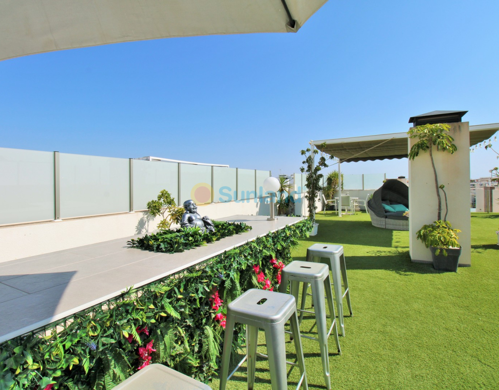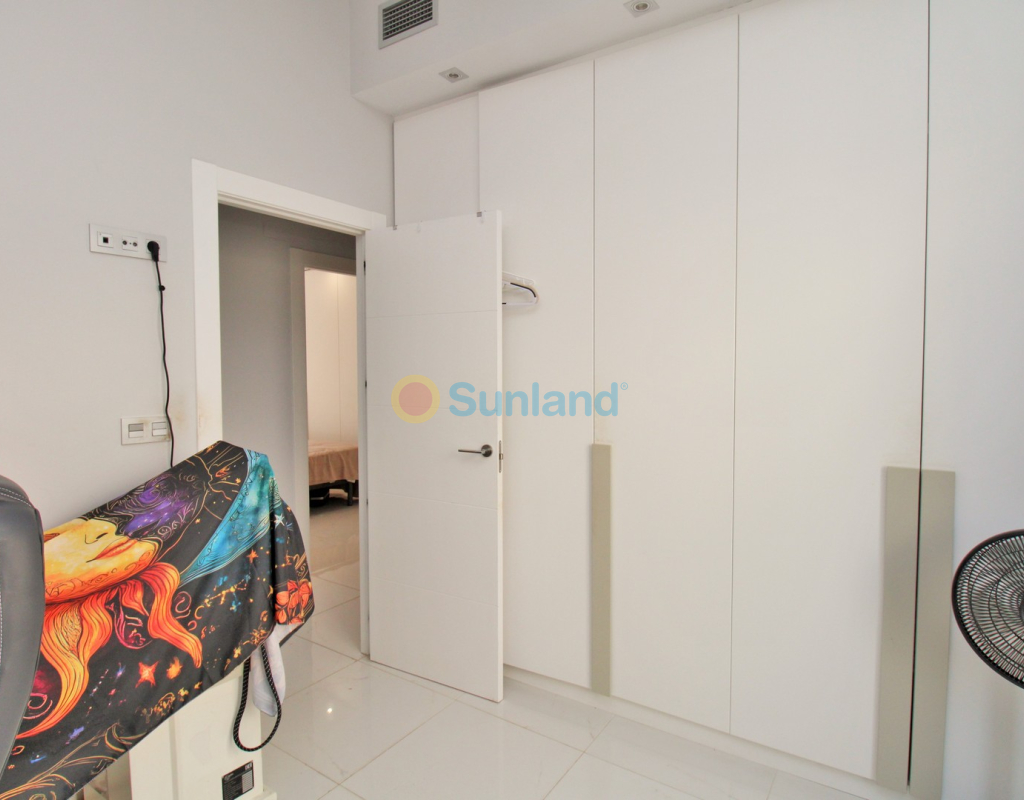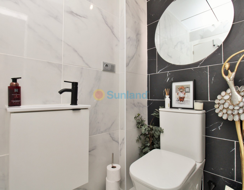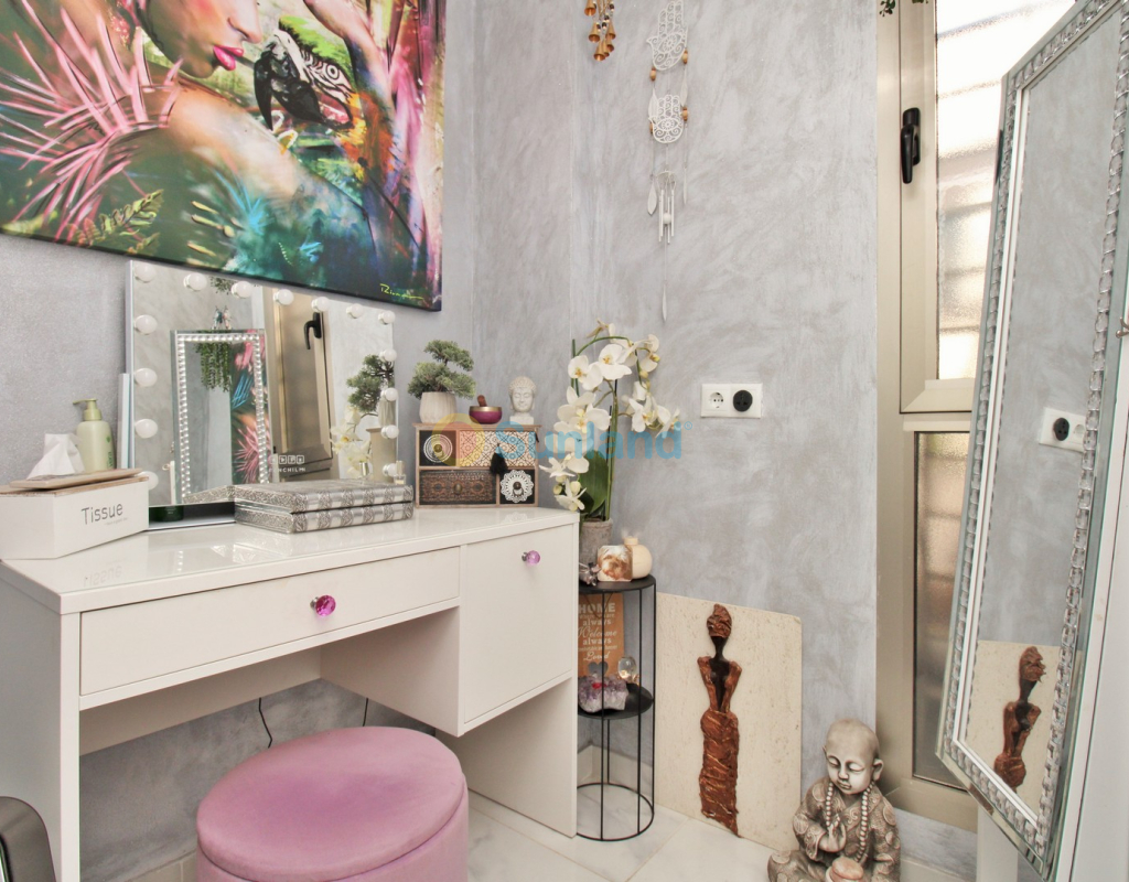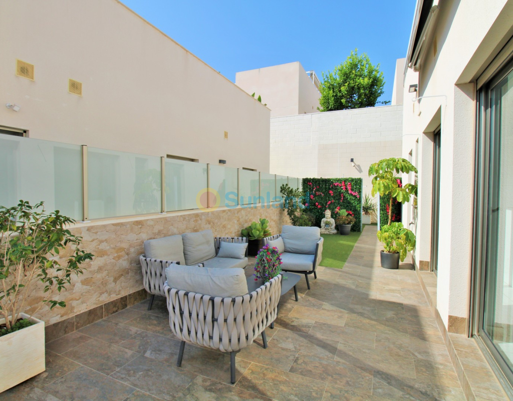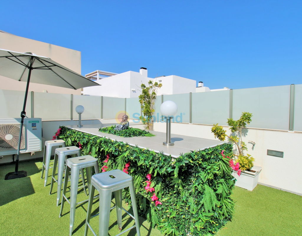 This beautifully presented 4-bedroom Innova villa is located in a sought-after area of Villamartin, just a short drive from local amenities. Designed for comfortable single-level living, the property boasts a private swimming pool, off-road parking, and a spacious L-shaped garden—ideal for relaxing or entertaining guests. The interior features a large, bright open-plan living and dining area, seamlessly connected to a modern American-style kitchen with sleek built-in appliances. A separate utility room provides added practicality. The villa offers 4 well-sized bedrooms and 2.5 bathrooms, with the potential to easily convert the guest WC into a full third bathroom, as pre-installation for a walk-in shower is already in place. This home is filled with natural light thanks to large windows and high ceilings, and includes ducted hot and cold air-conditioning for year-round comfort. Electric blinds throughout allow for easy control of light and privacy. One of the standout features of this property is the expansive roof solarium, covering the full footprint of the house. It includes a stylish bar area, electric awnings with built-in wind sensors that automatically retract, and modern glass balustrades offering both safety and privacy—making it the perfect spot to enjoy the sun or entertain in total seclusion. Situated just 1km from an ALDI supermarket and the Via Park commercial centre, with a wide range of bars and restaurants close by, the villa is also only a short drive to the popular Villamartin Plaza and golf course. Thoughtfully designed and exceptionally well-located, this villa offers a blend of modern comfort, low-maintenance living, and Mediterranean charm.