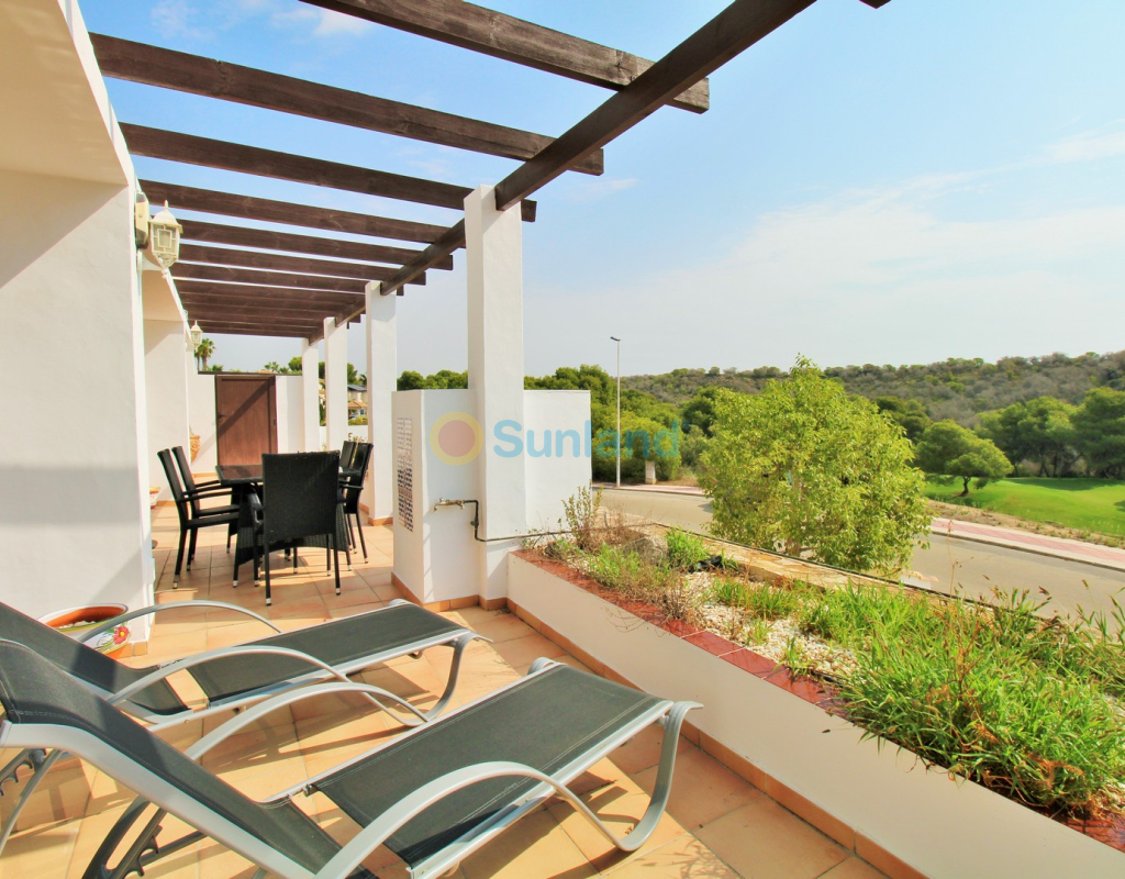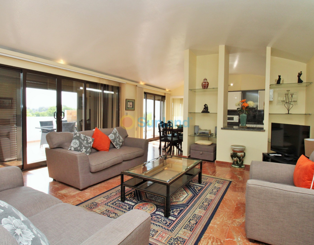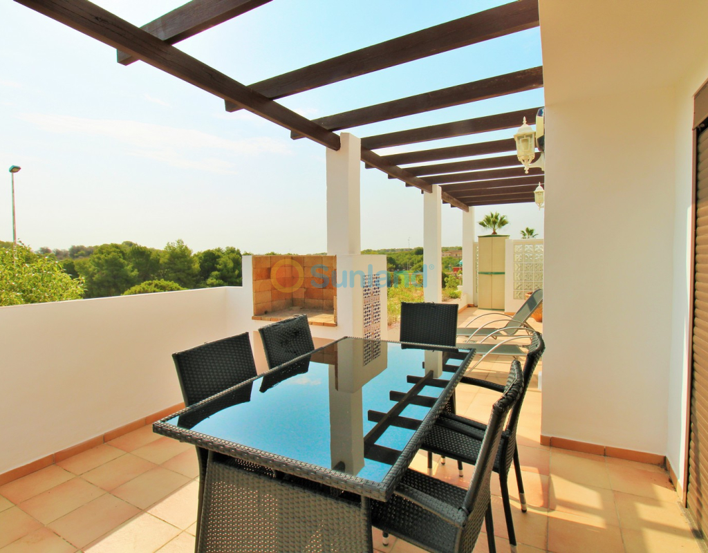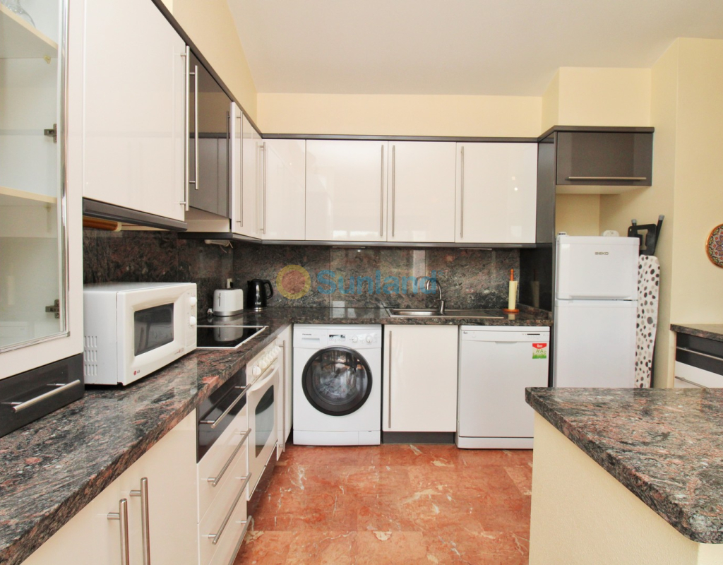 A rare opportunity to purchase a spectacular 2-bedroom apartment for sale in the prestigious Los Claveles complex within the Las Ramblas Golf Resort, just a short stroll from the popular La Fuente commercial centre. This impressive property offers generous living space and wonderful panoramic views over the golf course. The large front terrace spans the entire width of the apartment — perfect for outdoor dining or relaxing in the sun. Apartments of this quality and position rarely come to market, making early viewing essential. The interior comprises a bright and spacious lounge-dining area with an open-plan American-style kitchen, two double bedrooms with fitted wardrobes, and a family bathroom. The master bedroom benefits from an en-suite with a walk-in shower and direct access to the terrace. At street level, the property includes a private garage with an additional bedroom and en-suite bathroom — ideal for guests or as a hobby room. Residents enjoy access to a beautifully maintained communal pool and garden areas. The property is sold fully furnished with white goods and air-conditioning, ready to move into. An exceptional home in one of Las Ramblas’ most sought-after locations — equally suited as a permanent residence, holiday retreat, or investment.