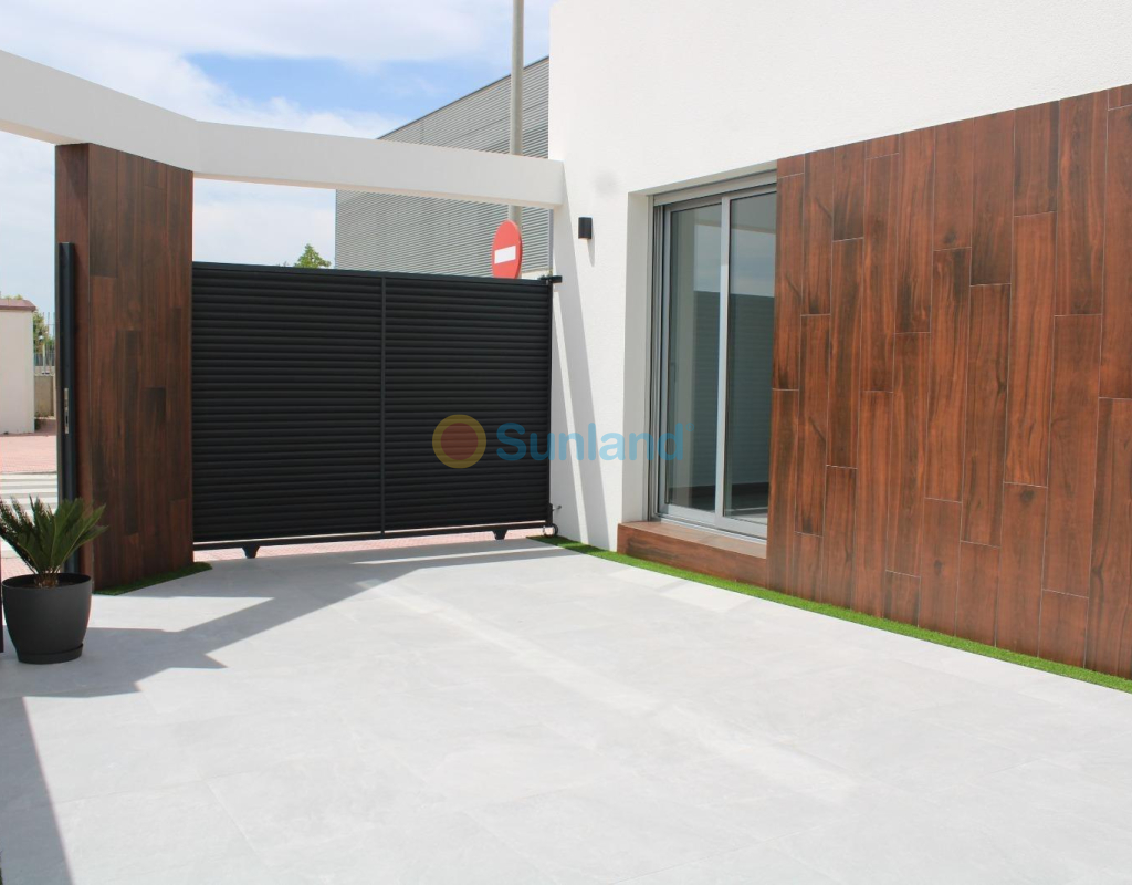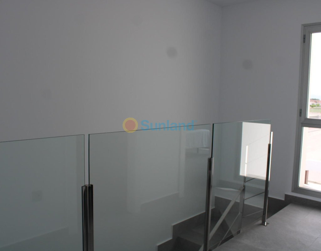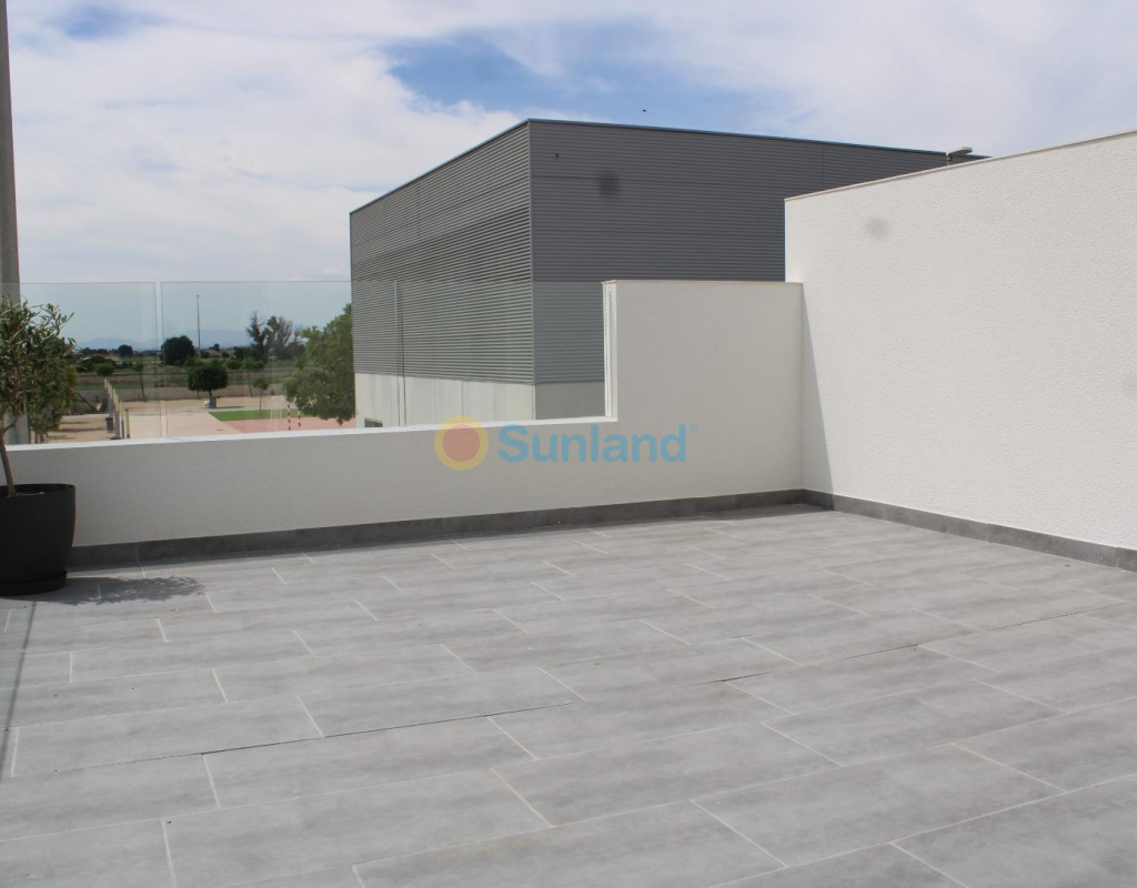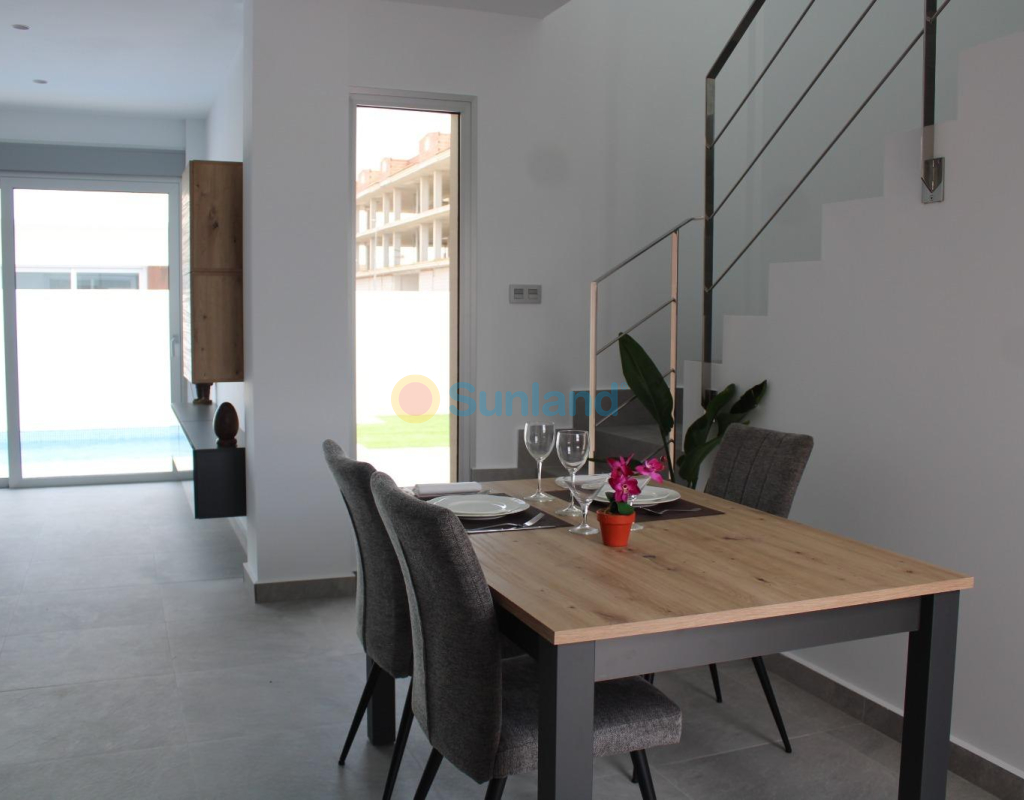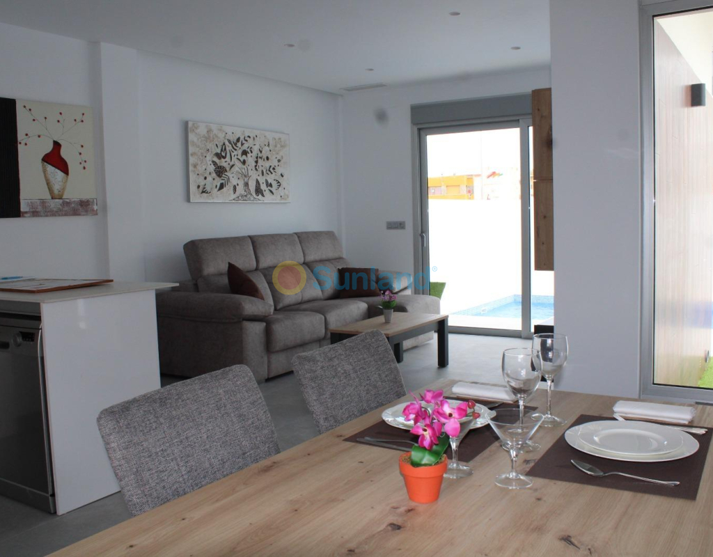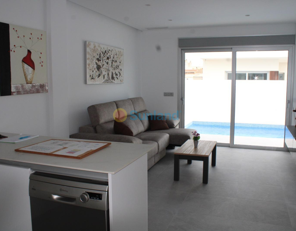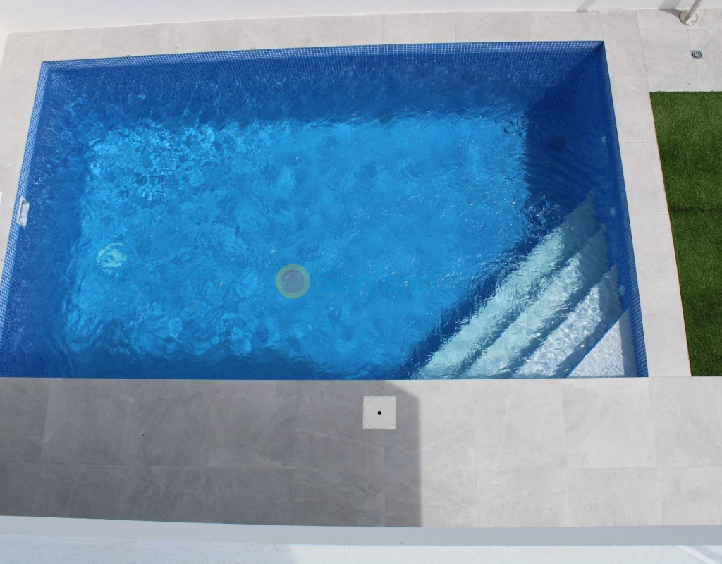 VILLAS DE OBRA NUEVA EN SAN FULGENCIO Villas independientes de nueva construcción situados en la localidad de San Fulgencio. Villas de 130 m2 construidos en parcelas de 180 m2, dispone de 3 dormitorios, 3 baños completos, 1 aseo, cocina americana con el salón-comedor, armarios empotrados, terrazas, solarium privado, jardín con piscina privada y plaza de parking. Se encuentra a 300 metros del centro del pueblo con todos los servicios, tiendas, restaurantes, ayuntamiento, banco. El pueblo de San Fulgencio está situado a unos 30 minutos del aeropuerto de Alicante-Elche, a 6km del campo de golf más cercano y a sólo 7km de la playa más cercana.