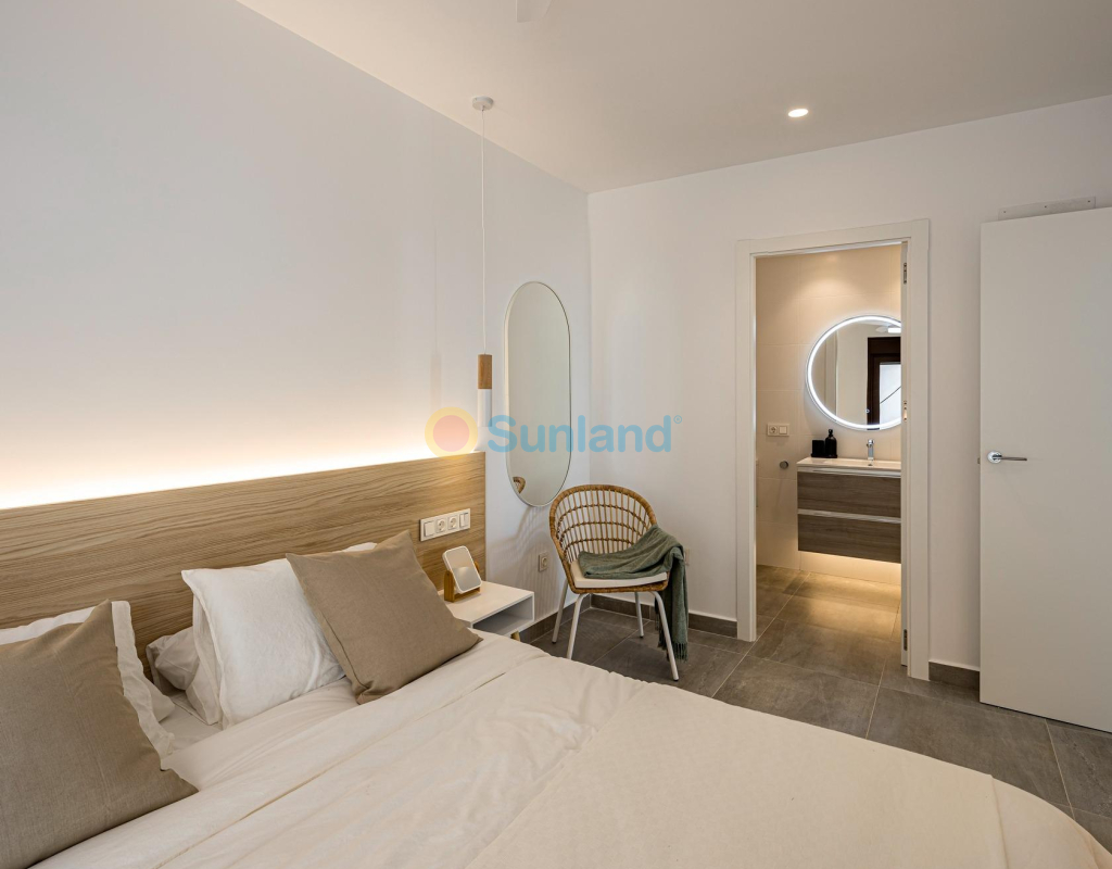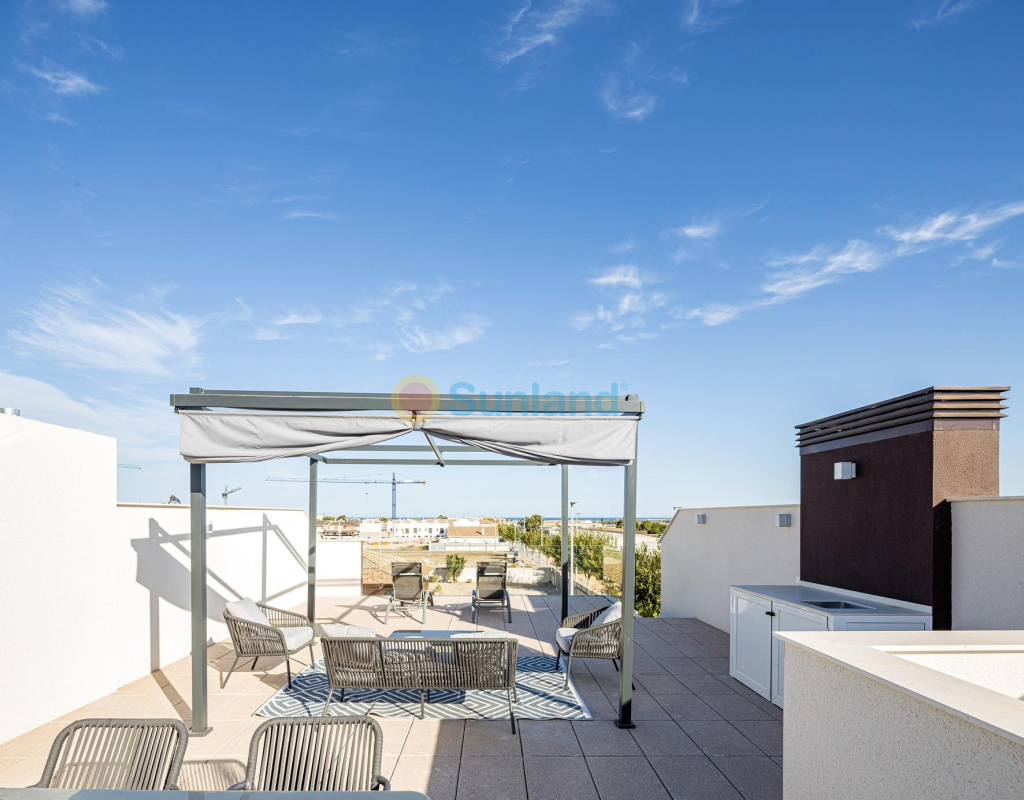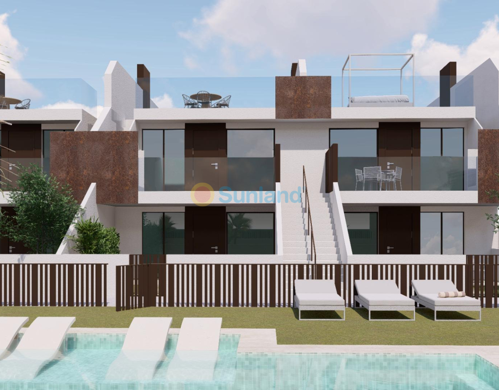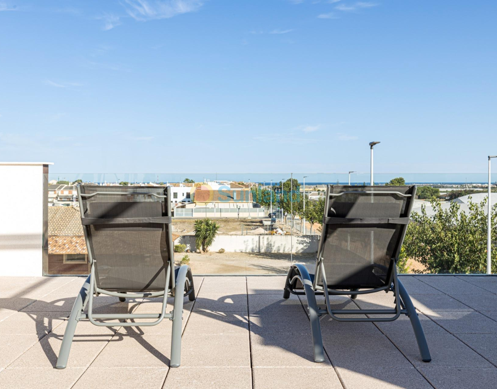RESIDENCIAL DE OBRA NUEVA DE APARTAMENTOS BUNGALOW EN PILAR DE LA HORADADA Obra Nueva un exclusivo residencial compuesto por 22 apartamentos bungalow de primera calidad con acabados PORCELANOSA en Pilar de la Horadada. Modernos bungalows de 2 dormitorios, 2 baños, cocina americana con salón, armarios empotrados. Las viviendas de planta baja disponen de un amplio jardín acabado en césped artificial y en la planta superior disfrutará del sol todo el año en la terraza y solarium, así como de la zona comunitaria con piscina y una cómoda plaza de aparcamiento. Pilar de la Horadada es un típico pueblo español en la parte más meridional de la Costa Blanca. La gran calle principal tiene supermercados, muchas tiendas, restaurantes y bares y algunas plazas encantadoras. Las hermosas playas de Torre de la Horadada y Mil Palmeras con paseo marítimo de arena fina está a sólo 5 minutos. Los aeropuertos de Corvera (Murcia) y Alicante están respectivamente a 40 y 55 minutos.