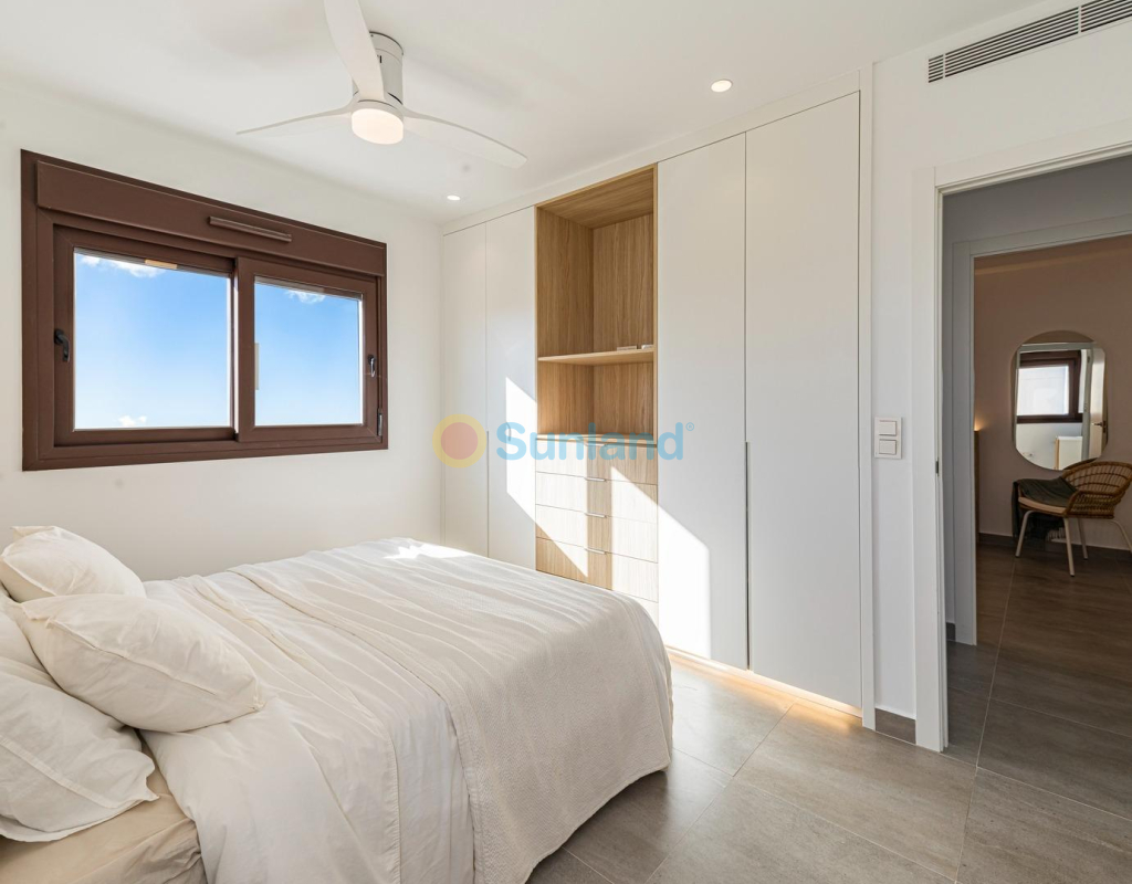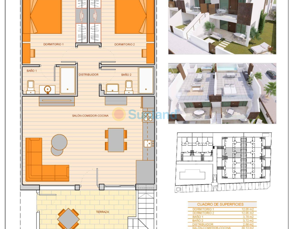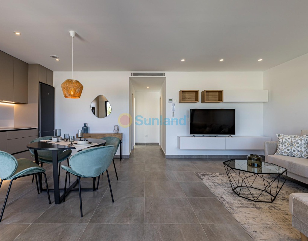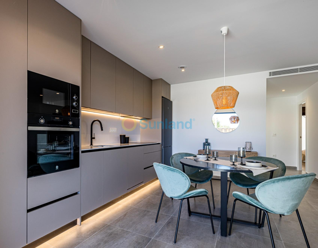 RESIDENCIAL DE OBRA NUEVA DE APARTAMENTOS BUNGALOW EN PILAR DE LA HORADADA Obra Nueva un exclusivo residencial compuesto por 22 apartamentos bungalow de primera calidad con acabados PORCELANOSA en Pilar de la Horadada. Modernos bungalows de 2 dormitorios, 2 baños, cocina americana con salón, armarios empotrados. Las viviendas de planta baja disponen de un amplio jardín acabado en césped artificial y en la planta superior disfrutará del sol todo el año en la terraza y solarium, así como de la zona comunitaria con piscina y una cómoda plaza de aparcamiento. Pilar de la Horadada es un típico pueblo español en la parte más meridional de la Costa Blanca. La gran calle principal tiene supermercados, muchas tiendas, restaurantes y bares y algunas plazas encantadoras. Las hermosas playas de Torre de la Horadada y Mil Palmeras con paseo marítimo de arena fina está a sólo 5 minutos. Los aeropuertos de Corvera (Murcia) y Alicante están respectivamente a 40 y 55 minutos.