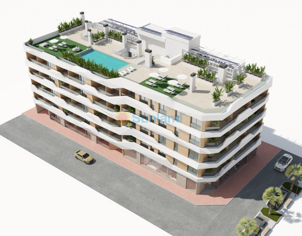 RESIDENCIAL DE OBRA NUEVA EN GUARDAMAR DEL SEGURA Residencial de obra nueva de apartamentos y áticos en Guardamar del Segura. Este destacado edificio es la elección perfecta gracias a su proximidad a la playa y a una amplia gama de servicios. Sus instalaciones incluirán una piscina y un solarium en la azotea, proporcionando un espacio para que los residentes se relajen y disfruten. Modernas viviendas de 2 y 3 dormitorios, 2 baños, un luminoso salón-comedor con cocina integrada y una acogedora terraza. Todas las viviendas estarán equipadas con aire acondicionado y domótica, lo que permitirá a los residentes controlar y automatizar diversos aspectos de la vivienda, proporcionando confort y eficiencia energética. La cocina contará con electrodomésticos de alta calidad, incluyendo horno, lavavajillas, frigorífico-congelador, campana extractora y placa de inducción, garantizando un espacio funcional y moderno para cocinar y disfrutar de las comidas en compañía. Además, existe la opción de adquirir una plaza de garaje y un trastero en el mismo edificio, proporcionando mayor comodidad y espacio de almacenamiento a los residentes. El residencial se encuentra en una ubicación privilegiada, cerca de la playa y rodeado de una gran variedad de servicios y comodidades, como restaurantes, tiendas, supermercados y zonas de ocio. Guardamar del Segura, conocida por sus hermosas playas de arena fina y su entorno natural, ofrece un estilo de vida tranquilo y relajado, sin renunciar a los servicios necesarios al alcance de la mano.