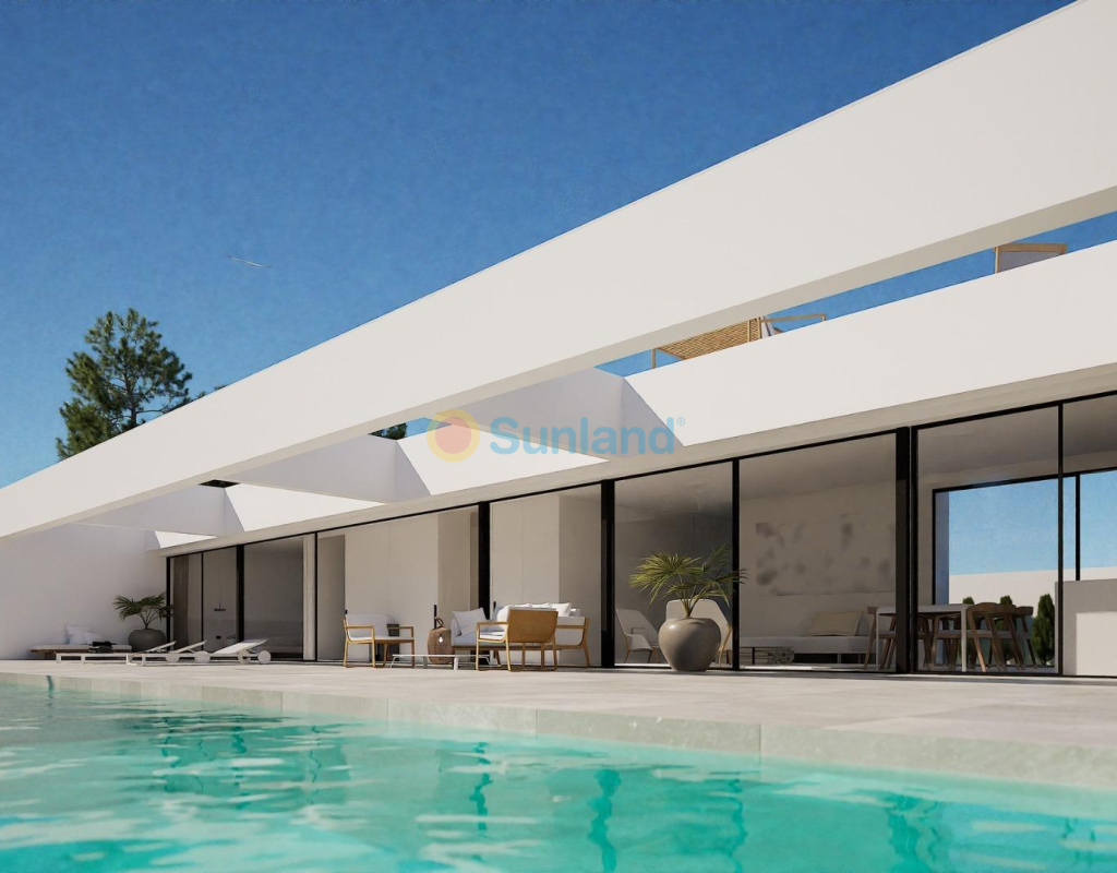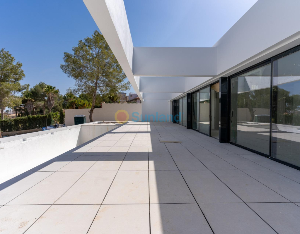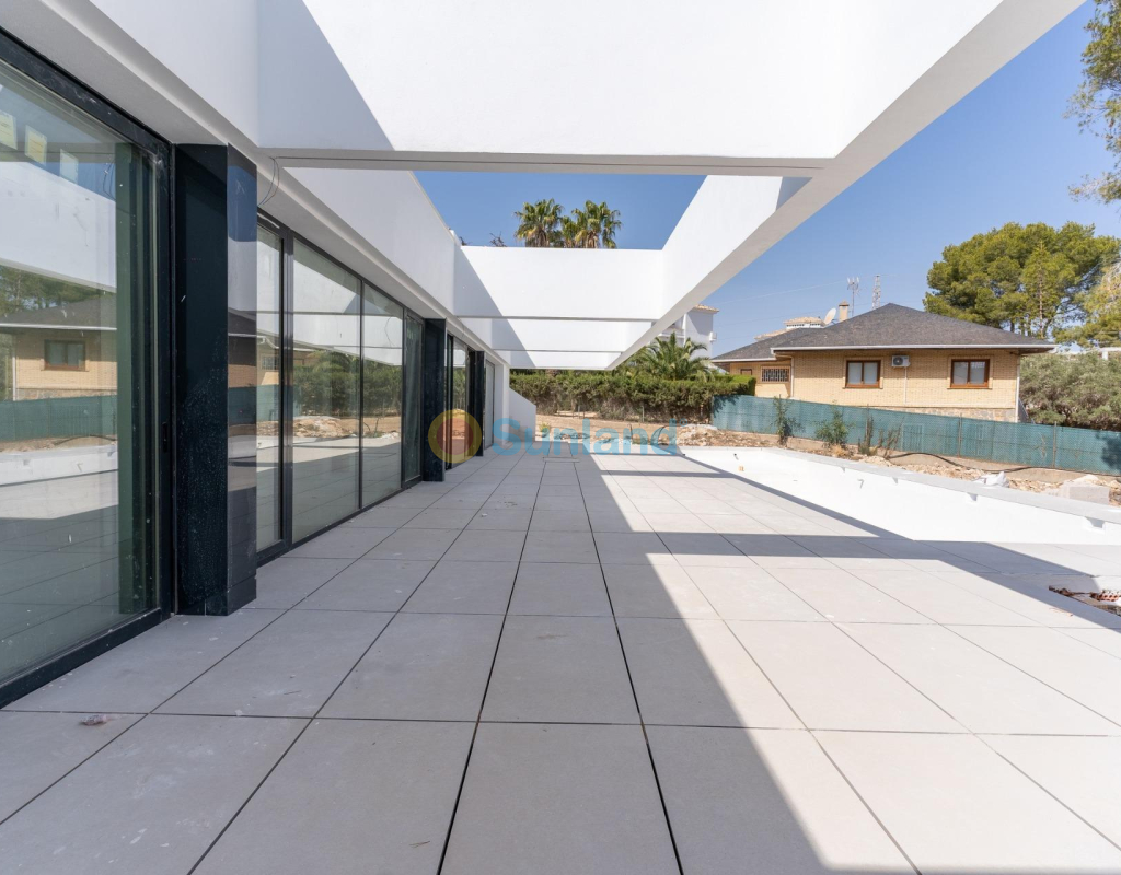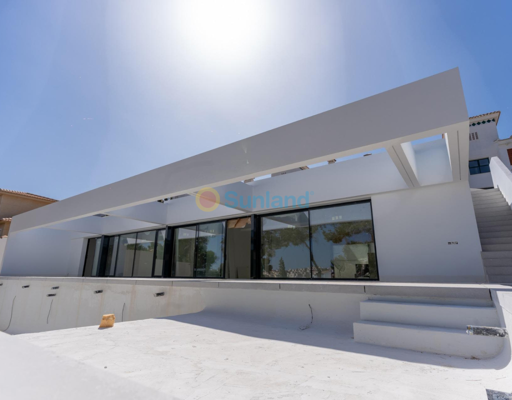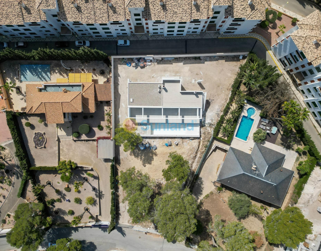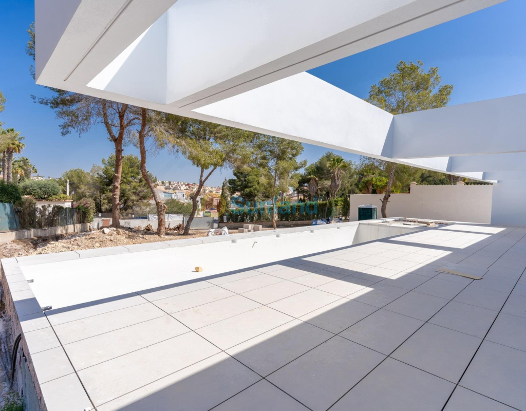 VILLA DE OBRA NUEVA EN LAS FILIPINAS Espectacular villa de lujo de obra nueva construido en una sola planta sobre una parcela de 1765m2, dispone de terraza, solarium privado, gran jardín con la piscina y plaza de parking exterior. La parcela tiene una inclinación que permite situar la casa en la parte superior para proporcionar una sensación de amplitud espectacular y unas vistas despejadas desde todas sus estancias. Esta villa dispone de 3 dormitorios dobles, uno de ellos con baño en suite y los otros 2 con terraza trasera cubierta. En las zonas comunes encontramos un baño completo, un aseo, una zona de lavandería y un amplio salón-comedor con cocina abierta. Todas las estancias están orientadas hacia la terraza delantera (85m2) que cuenta con una gran piscina desbordante de 56m2 con dos zonas, una zona de baño estándar con una profundidad máxima de 1,29m2 y una zona de aguas para los más pequeños de la familia. Adicionalmente, la casa ha sido dotada de un solarium de 70m2 en el que disfrutar de unas vistas más elevadas sobre la parcela y poder colocar una zona Chill Out en la que disfrutar de las cálidas noches de verano en un espacio más privado. Por último, en la parte trasera encontramos una segunda terraza cubierta ideal para un comedor más recogido. En esta zona también dispondremos de una zona de aparcamiento con capacidad para 5 coches. El diseño de esta villa se basa en un concepto mediterráneo y minimalista, dando especial importancia a la luz gracias a sus grandes ventanales y a sus estancias exteriores que conectan perfectamente la casa con su gran jardín a través de la extensa terraza y su piscina infinita. En cuanto a la tipología de la vivienda, cabe destacar que se ha construido en una sola planta baja para dotar de mayor confort y mayor armonía a sus estancias. Es una vivienda pensada para una familia que prioriza la comunidad y el disfrute de los espacios. Exterior ya que toda la fachada del chalet cuenta con grandes ventanales. La ubicación estratégica destaca en primer lugar por la orientación norte de la parcela que le permite tener luz durante gran parte del día. En cuanto a la ubicación, se encuentra en la urbanización Filipinas en Orihuela Costa y cuenta con todos los servicios necesarios a escasos metros como farmacias, tiendas, restaurantes, además se encuentra a menos de 20 minutos del Hospital Universitario de Torrvieja, a 45 min. Del Aeropuerto de Alicante y a menos de 1 hora del centro de la ciudad de Alicante. También hay que destacar que la playa de Torrevieja se encuentra a 15 minutos en coche y que en los alrededores de la villa se encuentran los 4 mejores campos de golf de toda la provincia de Alicante, como son Villamartín Golf, Campoamor Golf, Las Ramblas Golf y el prestigioso Campo de Golf Las Colinas, considerado uno de los mejores campos de golf de España. En definitiva, esta propiedad reúne todas las características ideales para ser considerada una propiedad exclusiva, cómoda y funcional, además de estar ubicada en un lugar estratégico.