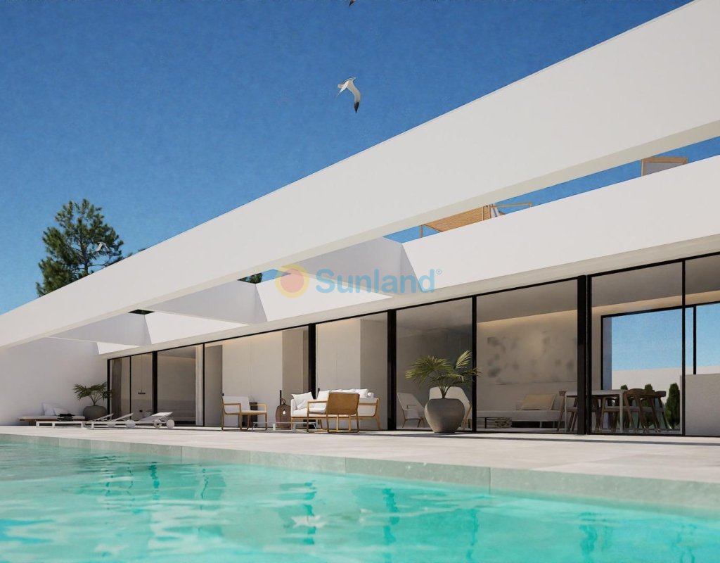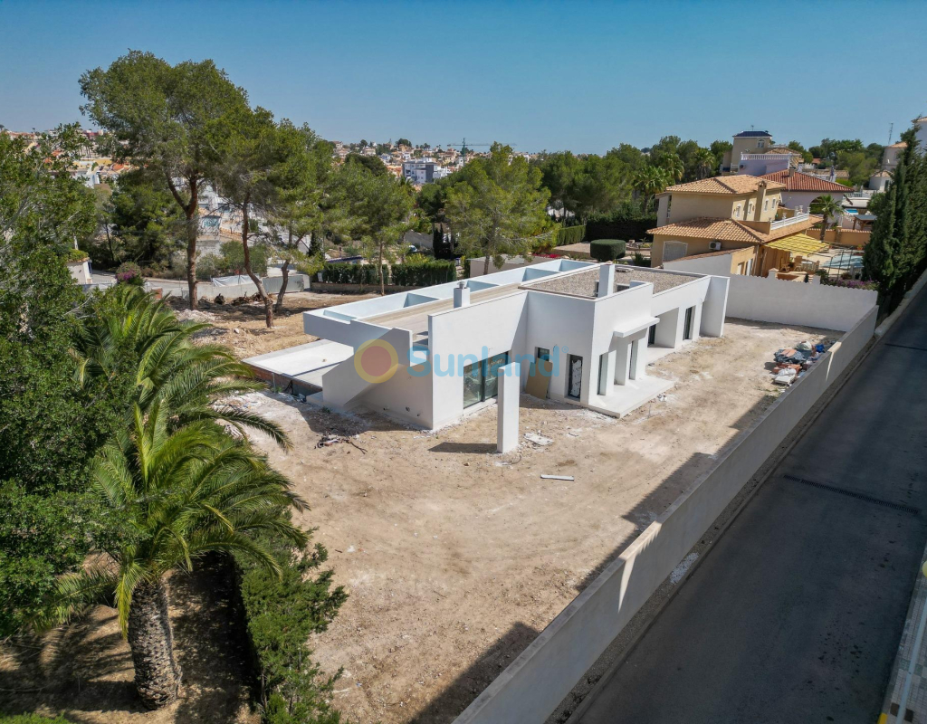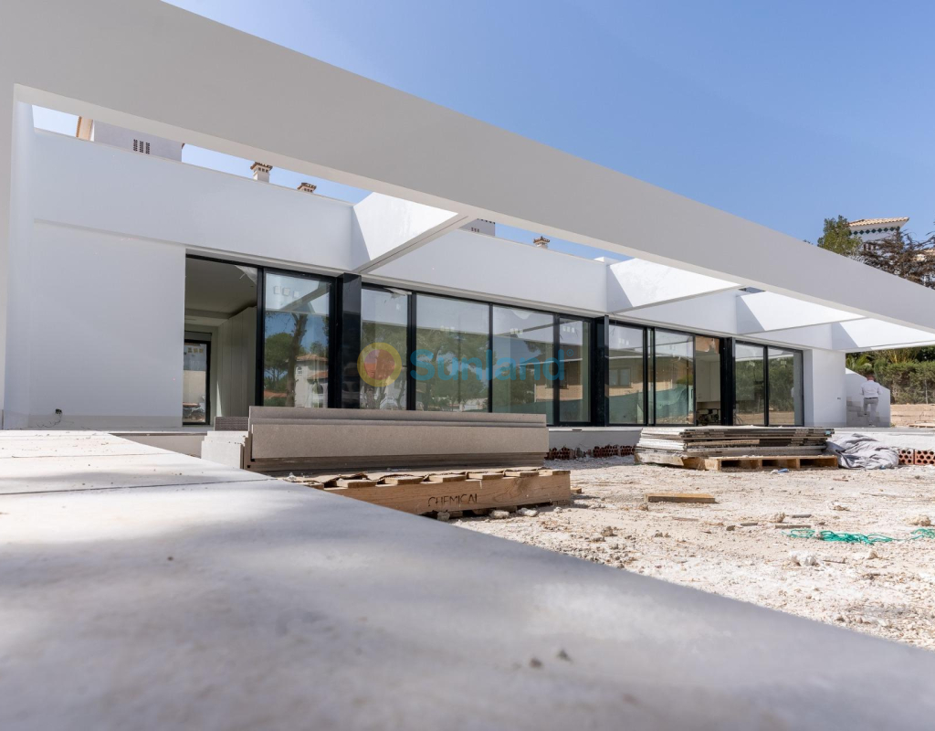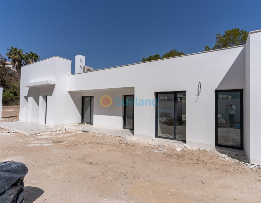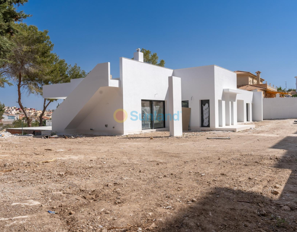 VILLA DE OBRA NUEVA EN LAS FILIPINAS Espectacular villa de lujo de obra nueva construido en una sola planta sobre una parcela de 1765m2, dispone de terraza, solarium privado, gran jardín con la piscina y plaza de parking exterior. La parcela tiene una inclinación que permite situar la casa en la parte superior para proporcionar una sensación de amplitud espectacular y unas vistas despejadas desde todas sus estancias. Esta villa dispone de 3 dormitorios dobles, uno de ellos con baño en suite y los otros 2 con terraza trasera cubierta. En las zonas comunes encontramos un baño completo, un aseo, una zona de lavandería y un amplio salón-comedor con cocina abierta. Todas las estancias están orientadas hacia la terraza delantera (85m2) que cuenta con una gran piscina desbordante de 56m2 con dos zonas, una zona de baño estándar con una profundidad máxima de 1,29m2 y una zona de aguas para los más pequeños de la familia. Adicionalmente, la casa ha sido dotada de un solarium de 70m2 en el que disfrutar de unas vistas más elevadas sobre la parcela y poder colocar una zona Chill Out en la que disfrutar de las cálidas noches de verano en un espacio más privado. Por último, en la parte trasera encontramos una segunda terraza cubierta ideal para un comedor más recogido. En esta zona también dispondremos de una zona de aparcamiento con capacidad para 5 coches. El diseño de esta villa se basa en un concepto mediterráneo y minimalista, dando especial importancia a la luz gracias a sus grandes ventanales y a sus estancias exteriores que conectan perfectamente la casa con su gran jardín a través de la extensa terraza y su piscina infinita. En cuanto a la tipología de la vivienda, cabe destacar que se ha construido en una sola planta baja para dotar de mayor confort y mayor armonía a sus estancias. Es una vivienda pensada para una familia que prioriza la comunidad y el disfrute de los espacios. Exterior ya que toda la fachada del chalet cuenta con grandes ventanales. La ubicación estratégica destaca en primer lugar por la orientación norte de la parcela que le permite tener luz durante gran parte del día. En cuanto a la ubicación, se encuentra en la urbanización Filipinas en Orihuela Costa y cuenta con todos los servicios necesarios a escasos metros como farmacias, tiendas, restaurantes, además se encuentra a menos de 20 minutos del Hospital Universitario de Torrvieja, a 45 min. Del Aeropuerto de Alicante y a menos de 1 hora del centro de la ciudad de Alicante. También hay que destacar que la playa de Torrevieja se encuentra a 15 minutos en coche y que en los alrededores de la villa se encuentran los 4 mejores campos de golf de toda la provincia de Alicante, como son Villamartín Golf, Campoamor Golf, Las Ramblas Golf y el prestigioso Campo de Golf Las Colinas, considerado uno de los mejores campos de golf de España. En definitiva, esta propiedad reúne todas las características ideales para ser considerada una propiedad exclusiva, cómoda y funcional, además de estar ubicada en un lugar estratégico.