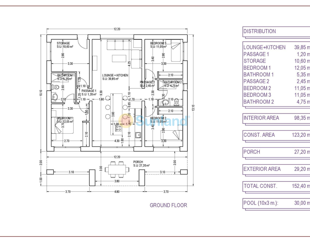 VILLAS DE OBRA NUEVA EN PINOSO Obra Nueva Villas independientes modernas que se pueden construir en parcelas rústicas o urbanas tenemos una amplia gama disponible en la zona de Pinoso: - 3 dormitorios, 2 baños - Piscina privada - Instalación completa de aire acondicionado - Cocina totalmente equipada - Gran selección de materiales de calidad - Luz y agua de red - 4 paneles solares incluidos - Etiqueta energética AA - Parcela desde 10.000 m2 en varias ubicaciones a elegir. - Parcela vallada de 3.000 m² de fácil mantenimiento - Puerta corredera motorizada En las parcelas rústicas se vallarán unos 3.000 m2 del total de la parcela y las casas se entregarán con unos 1.000 m2 de grava alrededor de la casa. La casa dispone de piscina privada y placas solares fotovoltaicas para el suministro eléctrico. Hay varias parcelas rústicas a elegir en diferentes ubicaciones, cada una con un precio diferente (en los precios publicados en este anuncio se ha considerado una parcela con un valor de 40.000 eur, si el comprador elige otra parcela, el precio final se recalculará en consecuencia). El plazo de entrega es de 8 meses desde la concesión de la licencia de obras. Se adquiere en régimen de autopromoción: el comprador realiza pagos a cuenta del precio a medida que el constructor ejecuta la obra.