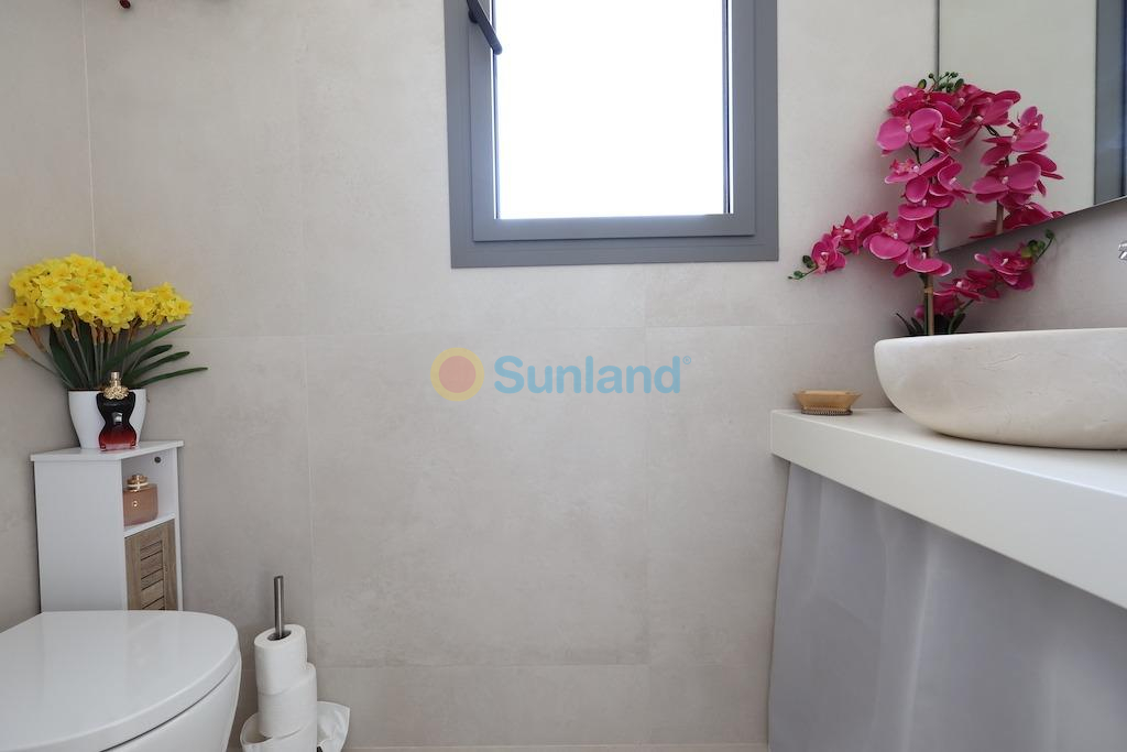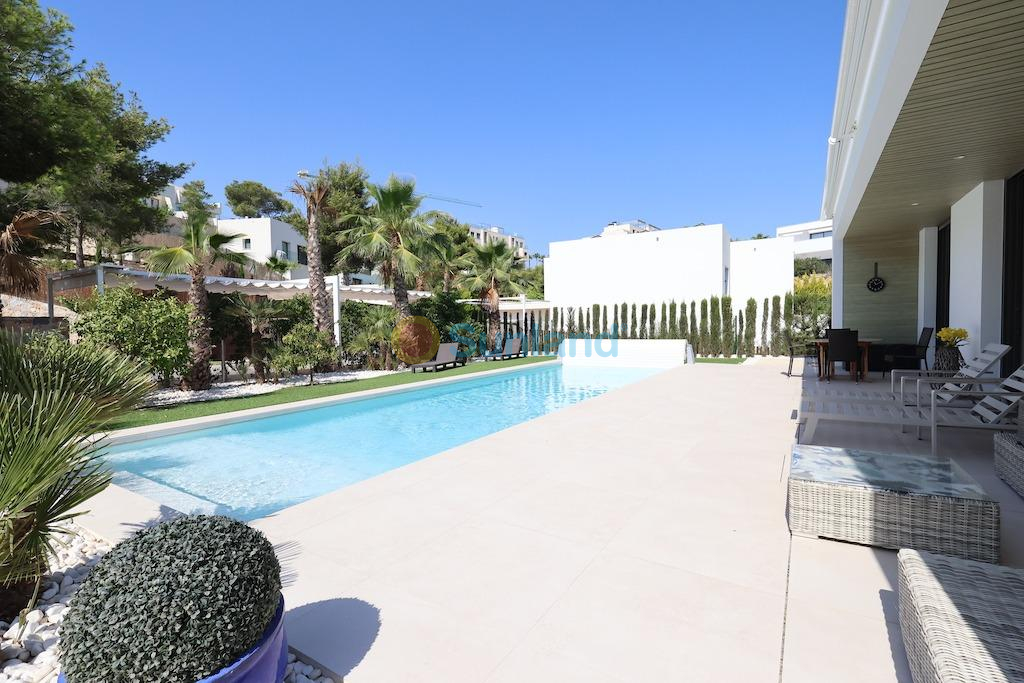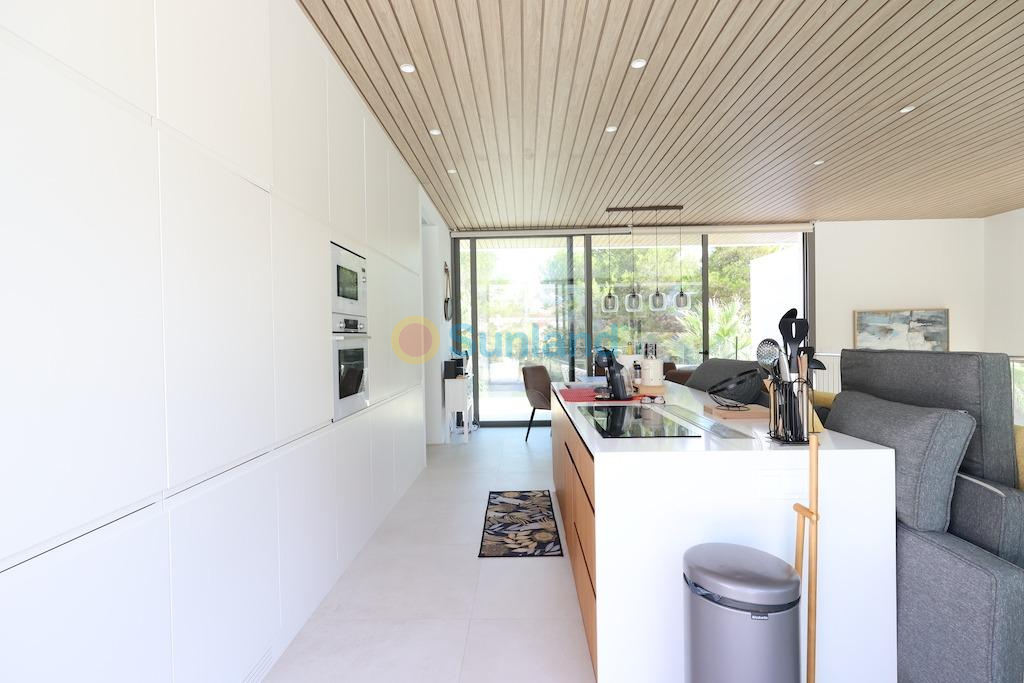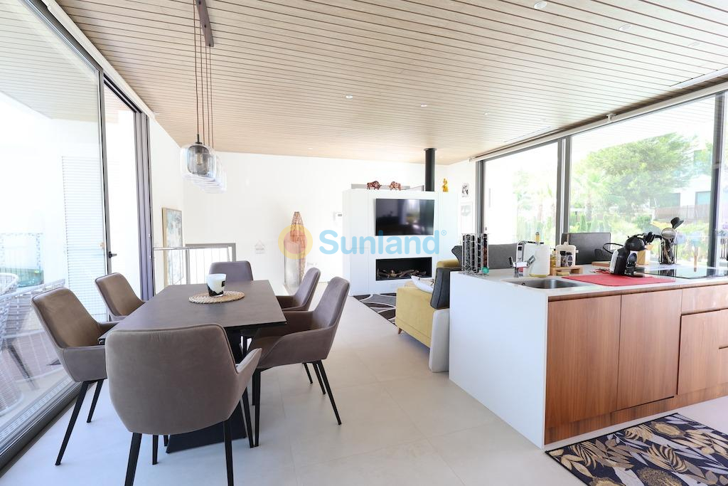 Las Colinas Golf & Countryclub, Villa Granado II de lujo 272 m2 alta gama en 2 plantas, con una parcela de 1000m2, la vivienda cuenta con 2 salones (uno en cada planta), 4 dormitorios, 3 baños, 1 aseo, cocina americana, equipada, con isla, sótano, trastero, casa inteligente con domótica, aire acondicionado por conductos, calefacción por suelo en cuartos de baño, cocina y lounge exterior, piscina climatizada con lona enrollable automatica, vistas a la piscina y a la pinada, parking para 2 coches, la vivienda se vende amuebladda y le pertenece acceso al Beach Club en primera linea de la playa de Campoamor. Fecha de construcción 2021.