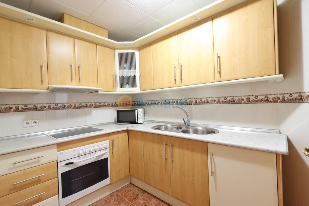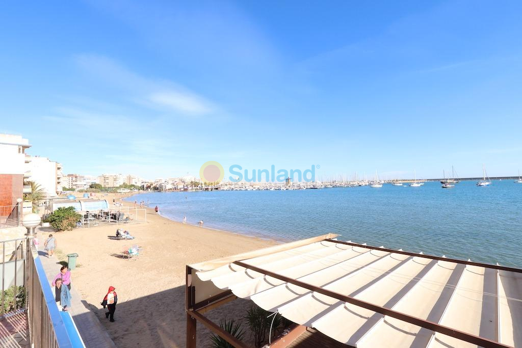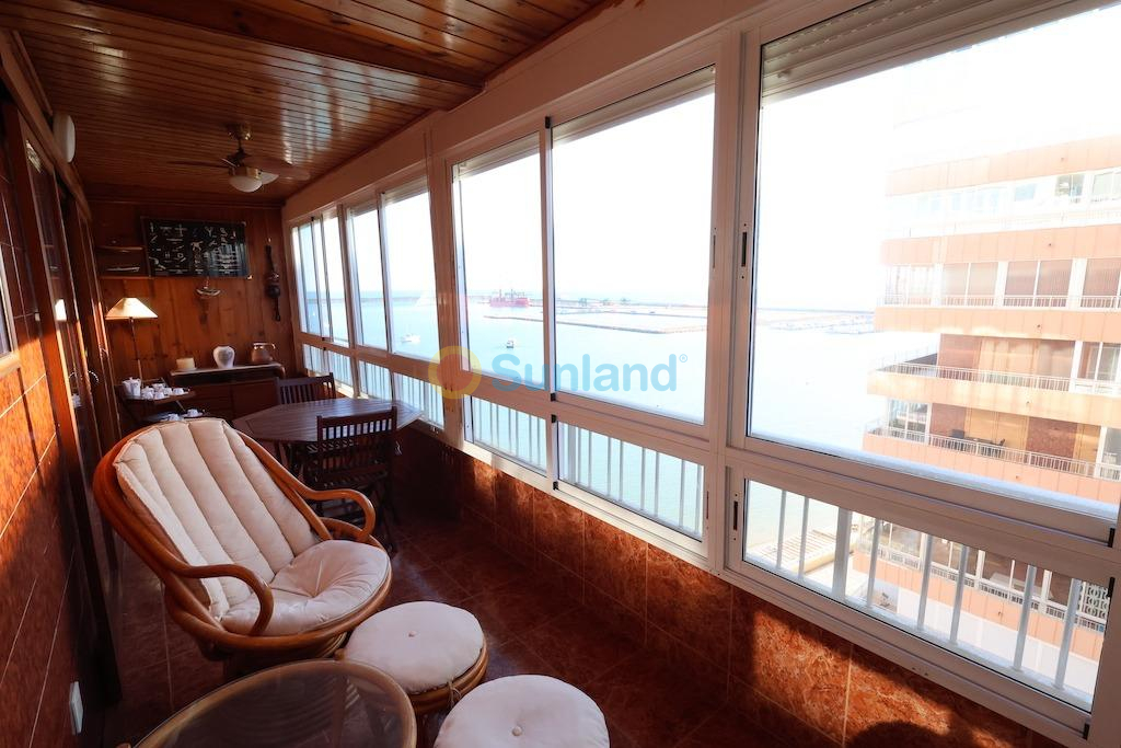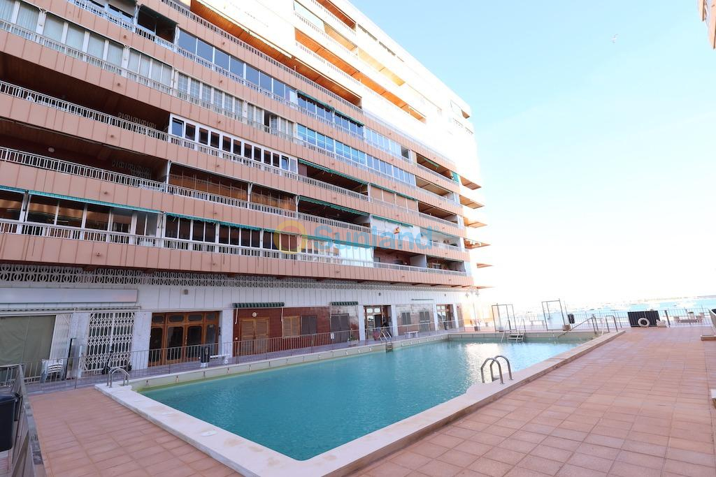 Torrevieja, Residencial Navamares residencial en primera linea de la playa, apartamento en planta 6ª con vistas panorámicas al mar y orientación sur, vivienda de 89 m2 con 3 dormitorios, baño, aseo, cocina independiente con galeria y un gran salón comedor, dispone de una terraza acristalada de 19 m2, la vivienda se vende amueblada y el residencial cuenta con piscina comunitaria.