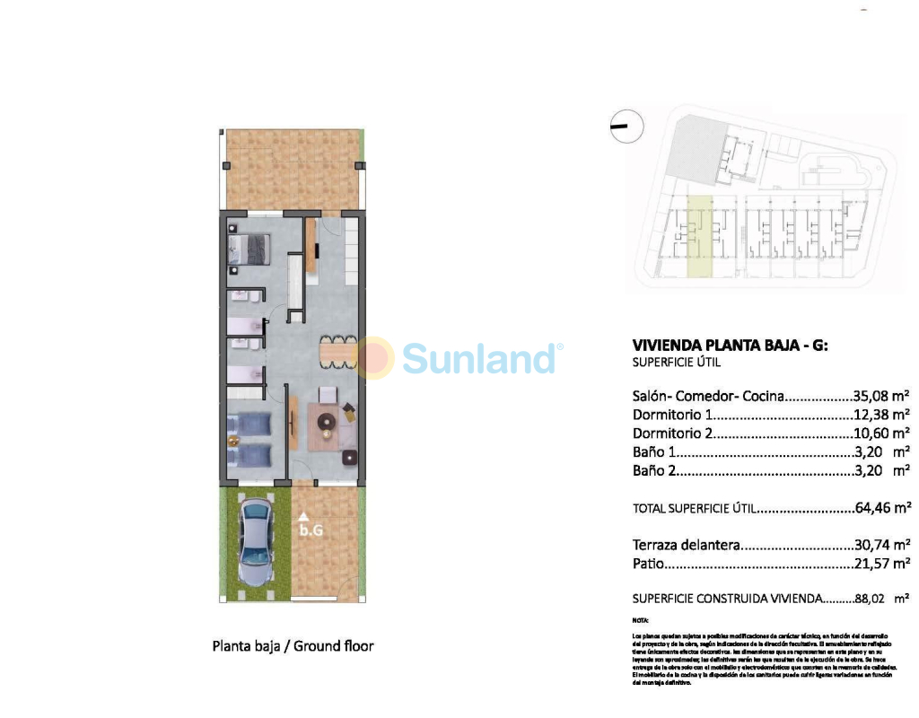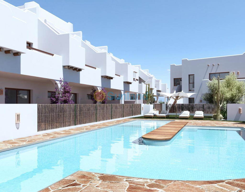 Exclusivos Bungalows de Obra Nueva en Pilar de la Horadada – Ubicación Privilegiada Un Residencial Único para Disfrutar del Mediterráneo Bienvenido a este exclusivo residencial de 16 bungalows y un adosado en esquina de 2 y 3 dormitorios, diseñados para quienes buscan calidad de vida y confort en la Costa Blanca. Ubicado a solo unos pasos del centro de Pilar de la Horadada, este moderno complejo ofrece un entorno tranquilo, con todas las comodidades al alcance. Las viviendas están diseñadas para maximizar el bienestar de sus propietarios: Plantas bajas con jardín delantero y patio trasero. Plantas altas con terraza privada y solárium con vistas espectaculares. Un adosado en esquina, con más amplitud y privacidad. El residencial cuenta con una amplia piscina comunitaria rodeada de zonas verdes, ideales para relajarse bajo el sol mediterráneo. Diseño Moderno y Acabados de Alta Calidad Cada vivienda ha sido cuidadosamente diseñada para ofrecer luminosidad, funcionalidad y estilo contemporáneo. Puerta de entrada acorazada para mayor seguridad. Cocina de concepto abierto, integrada en el salón para mayor comodidad. Baños modernos con platos de ducha e instalación de mamparas de vidrio templado. Preinstalación de aire acondicionado en salón y dormitorios. Producción de agua caliente mediante aerotermo individual para mayor eficiencia energética. Plantas altas con preinstalación de cocina exterior en los soláriums. Además, la urbanización dispone de zona de aparcamiento para bicicletas y una plaza de parking privada por vivienda. Pilar de la Horadada – Un Lugar para Vivir Todo el Año Situado en la provincia de Alicante, Pilar de la Horadada es un destino ideal para quienes buscan combinar tranquilidad, naturaleza y servicios de primer nivel. Sus hermosas playas, como la Playa de las Higuericas, se encuentran a pocos minutos, ofreciendo arena dorada y aguas cristalinas del Mediterráneo. Este residencial goza de una ubicación inmejorable, con acceso a supermercados, tiendas, restaurantes y espacios de ocio, todo a poca distancia a pie. La zona también cuenta con rutas de senderismo, carriles bici y una gran oferta deportiva. Distancias Claves a los Principales Puntos de Interés Playa de Torre de la Horadada – 3 km (5 min en coche). Campo de Golf Lo Romero – 5 km (10 min en coche). Centro Comercial La Zenia Boulevard – 15 km (15 min en coche). Aeropuerto de Corvera (Murcia) – 40 km (40 min en coche). Aeropuerto de Alicante – 55 km (55 min en coche). Reserve Hoy su Vivienda en la Costa Blanca No pierda la oportunidad de adquirir una vivienda de obra nueva en una ubicación inmejorable. Contáctenos hoy mismo para más información y para programar una visita.
