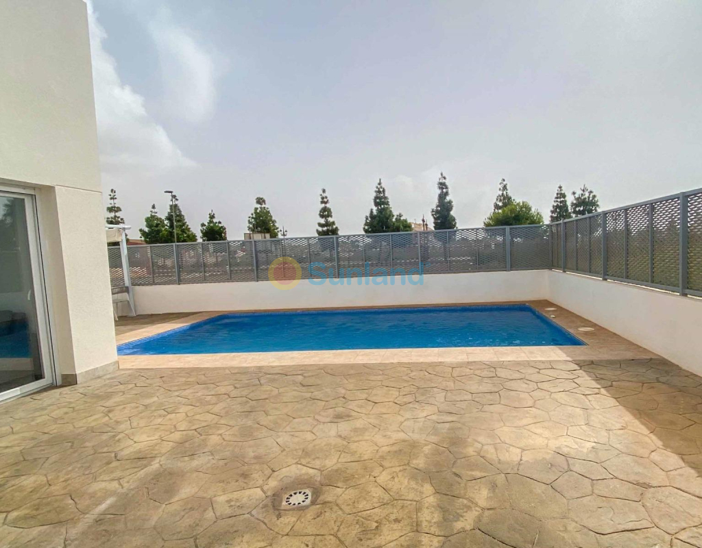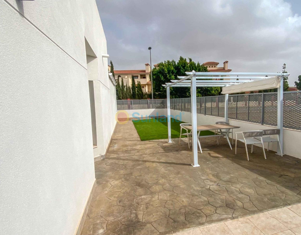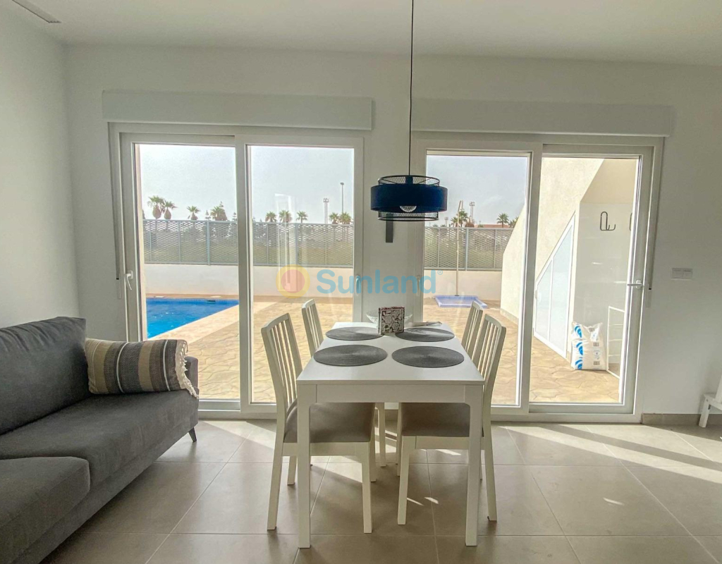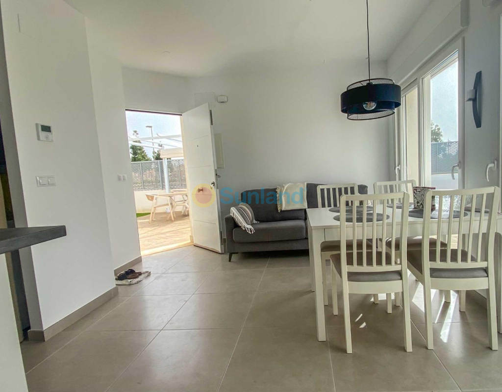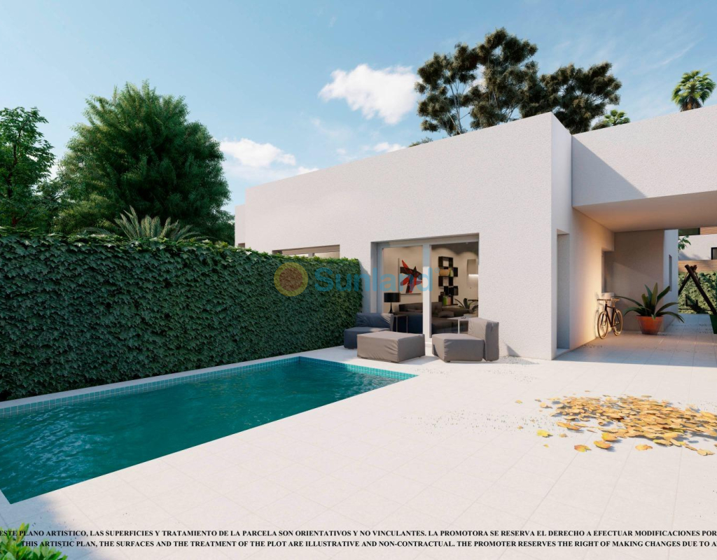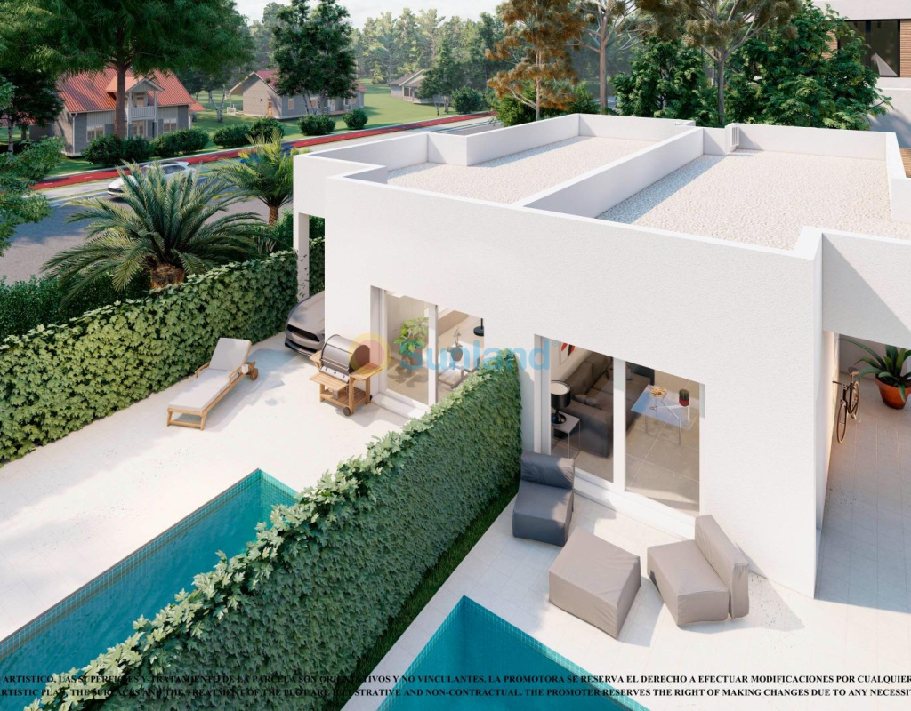 VILLAS PAREADAS DE OBRA NUEVA EN LOS ALCAZARES Estas villas espaciosas y bien diseñadas están construidas en pares. Cada villa tiene su propia parcela privada de 175m2 con amplias terrazas, zona de piscina y jardín en tres lados de la villa. Creemos que estas villas ofrecen la mejor relación calidad-precio en España: ofrecemos una villa adosada con más de 100 m2 de terraza (se puede agregar solarium a un costo adicional), área de piscina o jardín por el precio de un apartamento. Las villas han sido diseñadas pensando en la vida al aire libre. El salón tiene dos grandes puertas dobles que dan a la terraza y al área de la piscina, ideal para cenar al aire libre. Amplias terrazas en la parte delantera y trasera aseguran que los propietarios puedan tomar el sol durante todo el día. Las villas tienen cocinas modernas equipadas con una selección de colores para muebles de cocina y revestimientos cerámicos tanto en cocinas y baños como también en pisos y terrazas. Los dos cómodos dormitorios dobles tienen armarios empotrados. Un dormitorio tiene un baño con ducha en suite y hay un segundo baño con ducha para invitados para el dormitorio 2. Los jardines están rodeados por un muro de 40 cm con cobertura para privacidad en el frente con puertas. Los compradores pueden decidir aumentar la altura de la pared alrededor del jardín trasero hasta una altura de 180 cm (5 pies y 10 pulgadas) o agregar cercas o setos para mayor privacidad. Hay un gran solárium en la azotea con una escalera de caracol disponible por un suplemento. Cada villa tiene un garaje de buen tamaño que también podría usarse como sala de pasatiempos o estudio. Se pueden agregar piscinas o jacuzzis a un costo adicional. Tenemos planos disponibles para construir un tercer dormitorio en el techo de las villas. Residencial de villas situado a 1 km de la playa y del pueblo de Los Alcázares, donde poder practicar diversos deportes acuáticos, rodeado de varios campos de golf. Ciudad de Cartagena a menos de 15 minutos en coche ya 30 minutos del aeropuerto de Murcia Corvera.