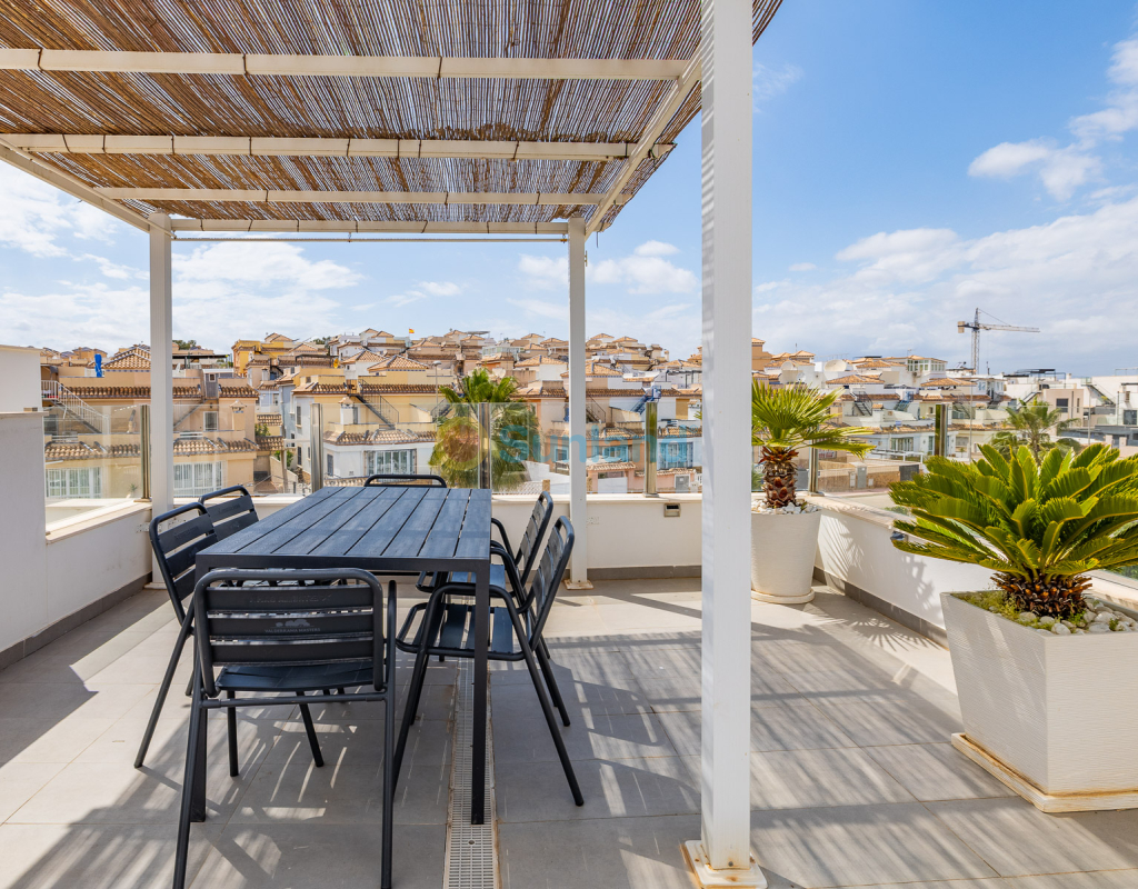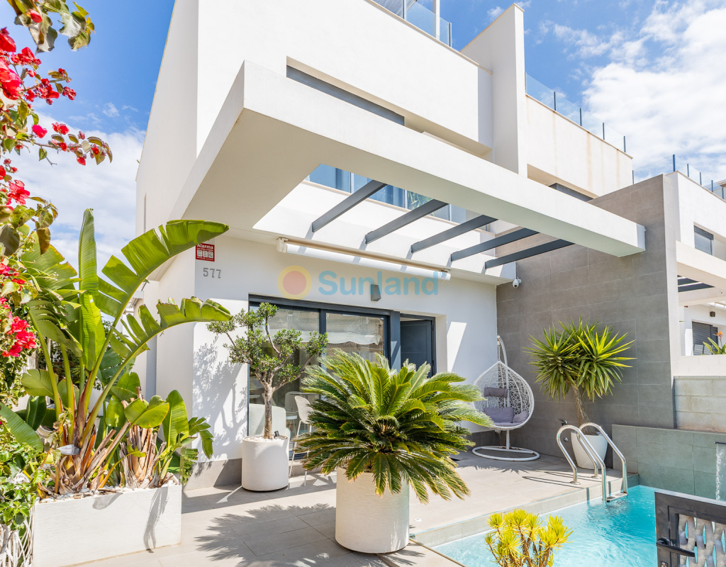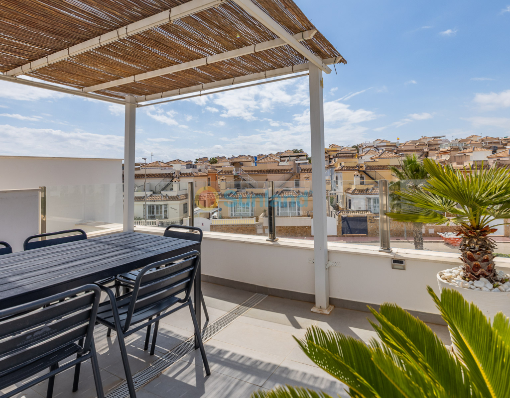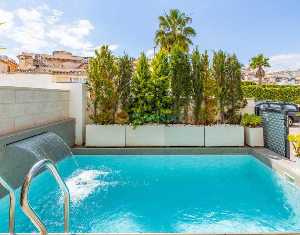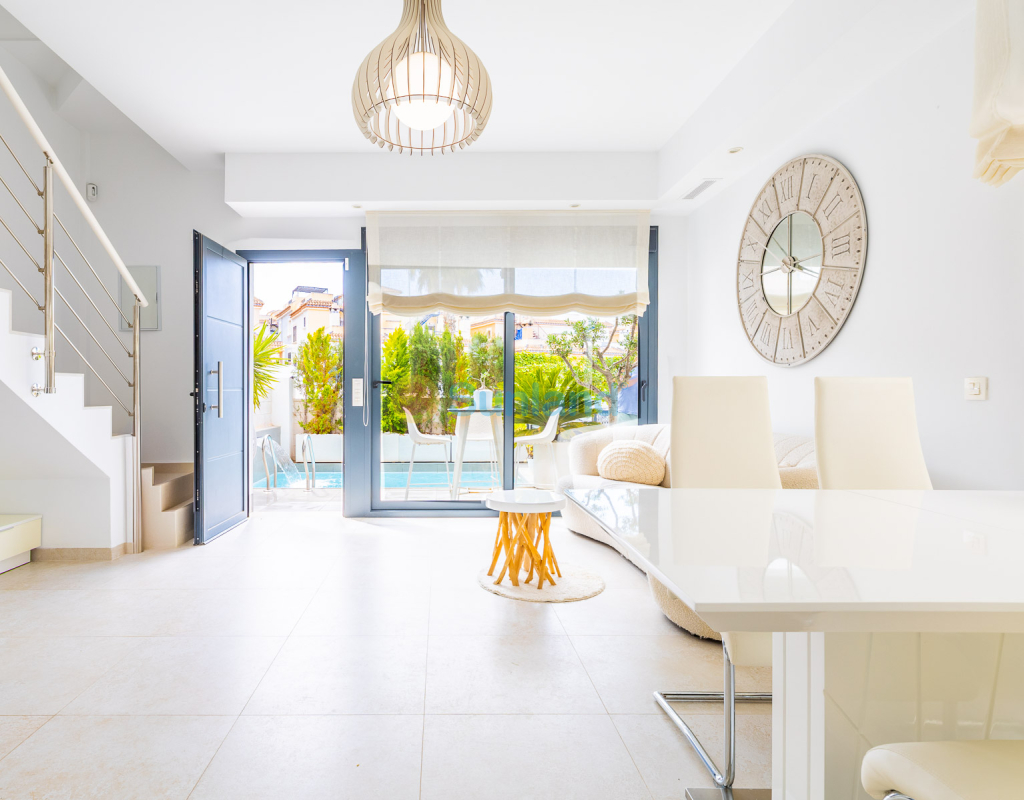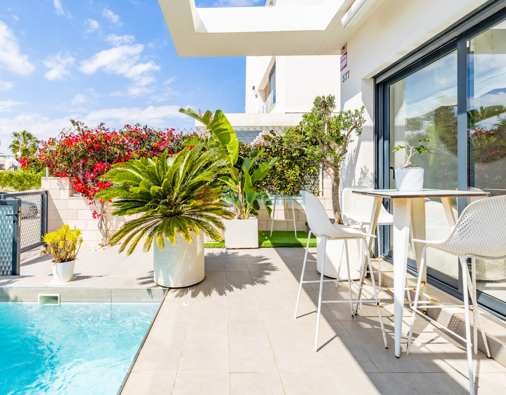 Adosado moderno con piscina privada y solárium en Pau 26, Orihuela Costa Ubicado en una zona residencial tranquila, este adosado de estilo contemporáneo ofrece comodidad, privacidad y excelentes espacios exteriores. Construido en 2020, cuenta con 76 m² distribuidos en varias plantas. Características: 3 dormitorios 2 baños completos + 1 aseo Cocina abierta Terraza privada Solárium con cocina exterior y barbacoa Piscina privada Plaza de aparcamiento Aire acondicionado Totalmente amueblado Orientación oeste Excelente oportunidad para quienes buscan una vivienda lista para entrar a vivir