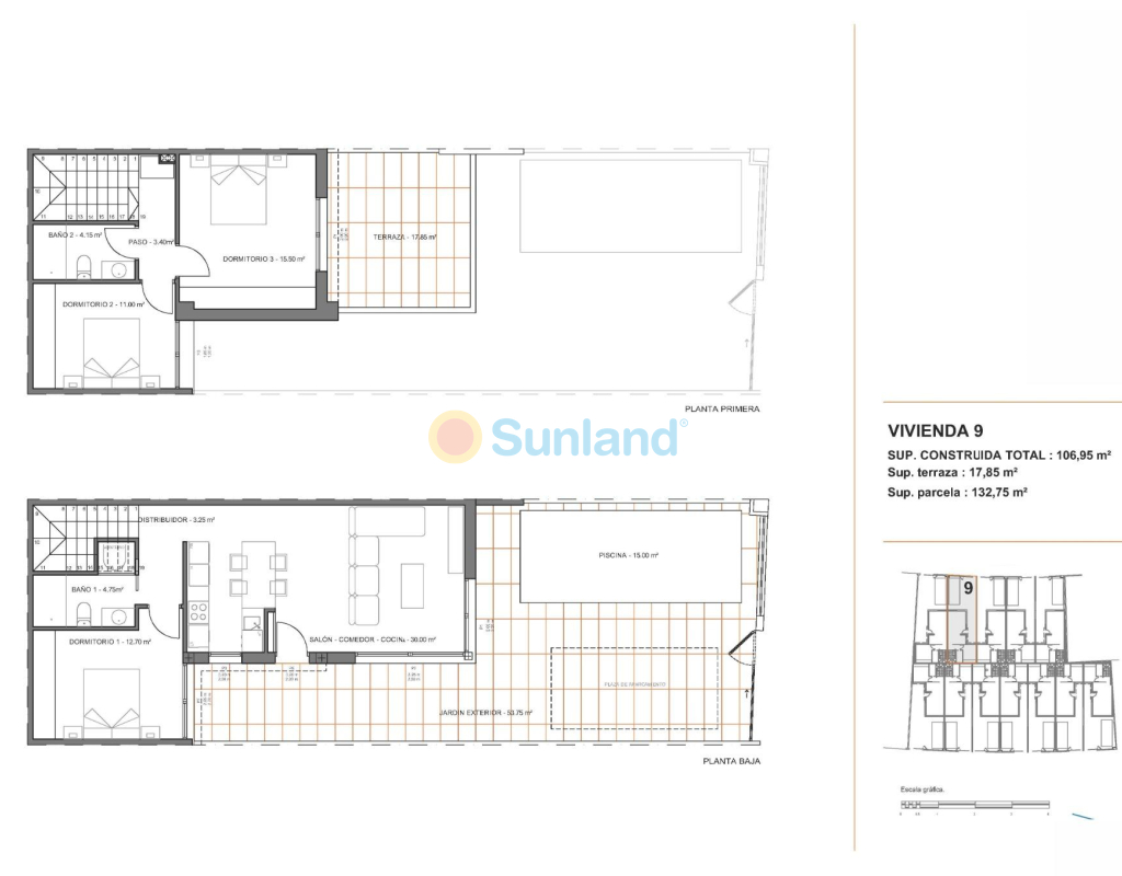 Modernas villas adosadas con piscina privada cerca del mar en Santiago de la Ribera Ubicada en la zona de San Blas en Santiago de la Ribera, Murcia, una de las zonas más atractivas del Mar Menor. Esta promoción está diseñada con 12 villas de 3 dormitorios y 2/3 baños, incluyendo piscina privada, terraza y solárium con cocina de verano en viviendas seleccionadas. Las villas cuentan con interiores elegantes y funcionales, cocinas totalmente equipadas con todos los electrodomésticos, y además, incluyen preinstalación de climatización por conductos. Esta promoción ofrece una oportunidad única para disfrutar de diseño, comodidad y estilo a solo unos minutos del mar. Exclusiva promoción de obra nueva a solo 1 km de la playa Descubra esta promoción de edición limitada de villas adosadas situadas en Santiago de la Ribera, una encantadora localidad costera de la costa murciana, conocida por su estilo de vida relajado, sus playas limpias y su excelente clima durante todo el año. Estas nuevas viviendas están situadas a solo 1 km de la costa del Mar Menor, ofreciendo la combinación perfecta de privacidad, comodidad y proximidad a los servicios esenciales y a las opciones de ocio. Diseño contemporáneo con distribución funcional Cada villa está distribuida cuidadosamente en dos plantas y algunas unidades disfrutan de un solárium en la azotea, lo que proporciona un amplio espacio para la vida moderna. Las propiedades cuentan con: 3 amplios dormitorios, incluyendo uno en la planta baja 2 o 3 baños completos. Jardín privado y piscina. Terraza en la primera planta y algunas unidades con solárium en la azotea, ideal para tomar el sol o recibir invitados. Aparcamiento privado dentro de la parcela. Además, dos de las viviendas disponen de instalación de placas fotovoltaicas para el ahorro de energía. Acabados y prestaciones de alta calidad Construidas con atención al detalle y según los estándares modernos, las viviendas incluyen: Puerta de entrada a vivienda acorazada Persianas de aluminio motorizadas Cocina amueblada con electrodomésticos Muebles de baño con espejo y luz Plato de ducha en porcelánico a medida del baño con mamparas instaladas Preinstalación de Aire Acondicionado por conductos Estas viviendas están diseñadas para disfrutar de todo el año, ya sea como residencia principal, segunda vivienda o inversión para alquiler vacacional. Ubicación privilegiada en la Costa Cálida Santiago de la Ribera ofrece un estilo de vida mediterráneo y dinámico con todo a mano: Playa (Mar Menor) – 1 km Centro comercial La Ribera – 2 km Roda Golf – 5 km Aeropuerto de San Javier – 6 km Puerto deportivo de Lo Pagán – 4 km Centro comercial Dos Mares – 3 km Excelente acceso por carretera a Murcia (40 km) y Cartagena (30 km) Con su rica cultura local, mercados semanales, paseos marítimos y opciones para practicar deportes acuáticos, Santiago de la Ribera es un lugar ideal para disfrutar de lo mejor de la Costa Cálida. Haga realidad su sueño de vivir en la costa No pierda esta oportunidad única de adquirir una elegante villa de nueva construcción en una de las zonas más codiciadas de la costa murciana. Póngase en contacto con nosotros ahora para obtener más información o concertar una visita.