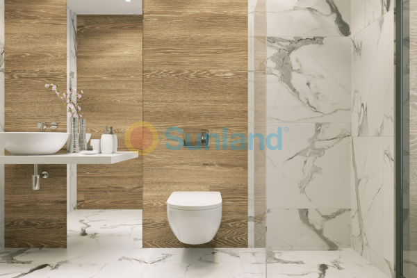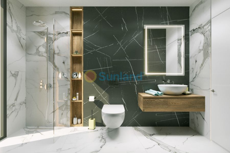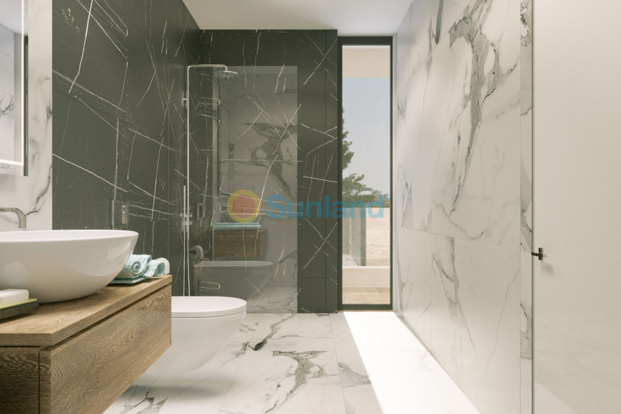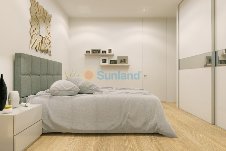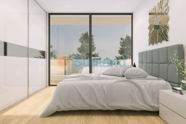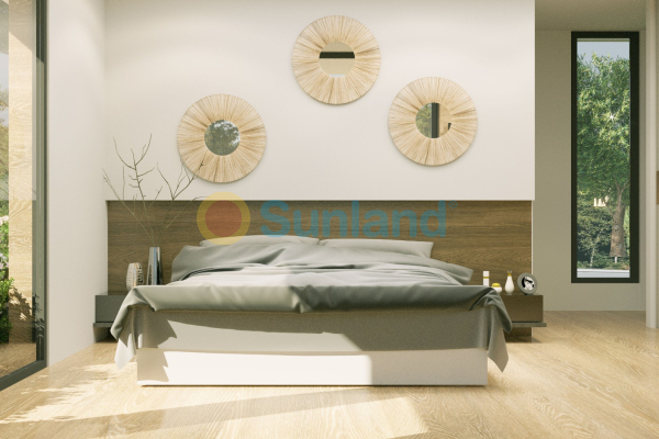 Planta baja: Salón – comedor – cocina, 2 dormitorios doble cama, uno de ellos con el baño y vestidor, 1 aseo.