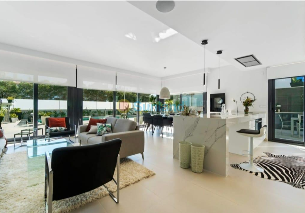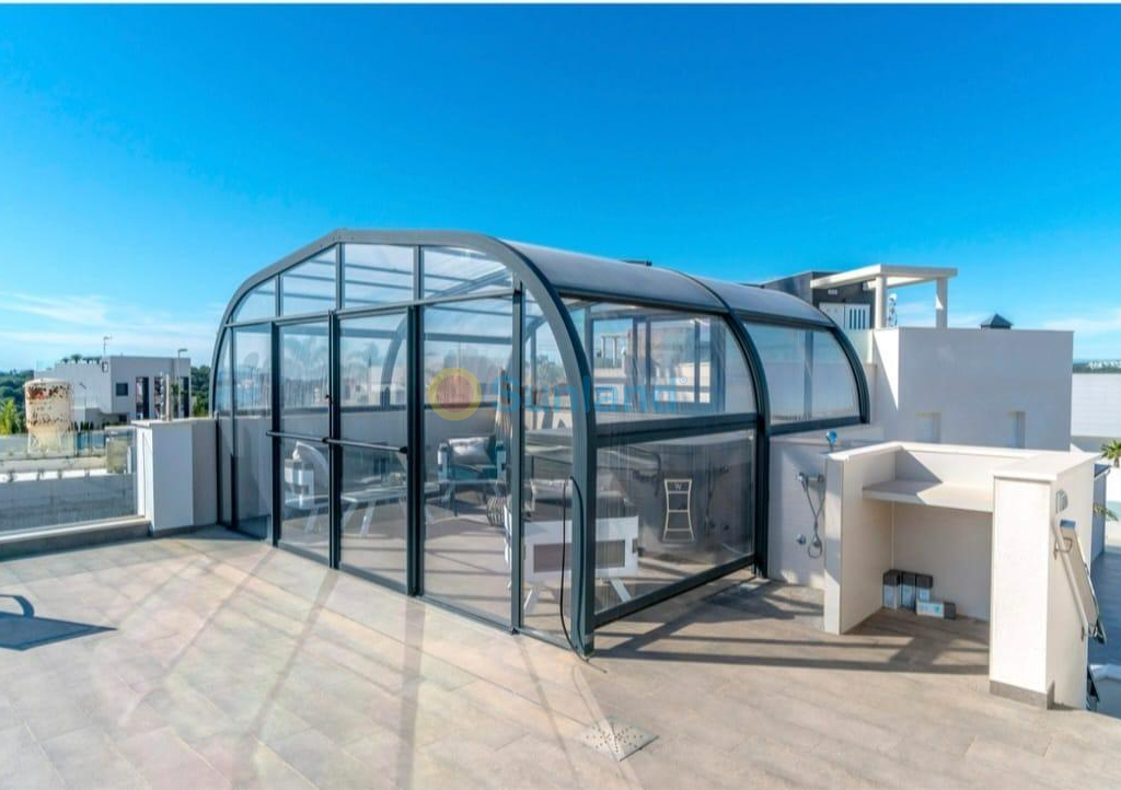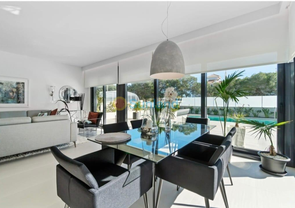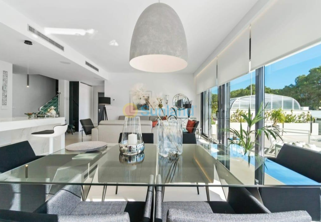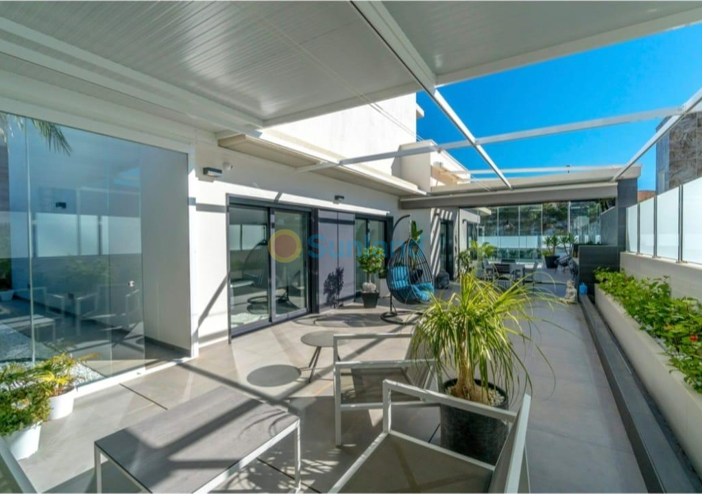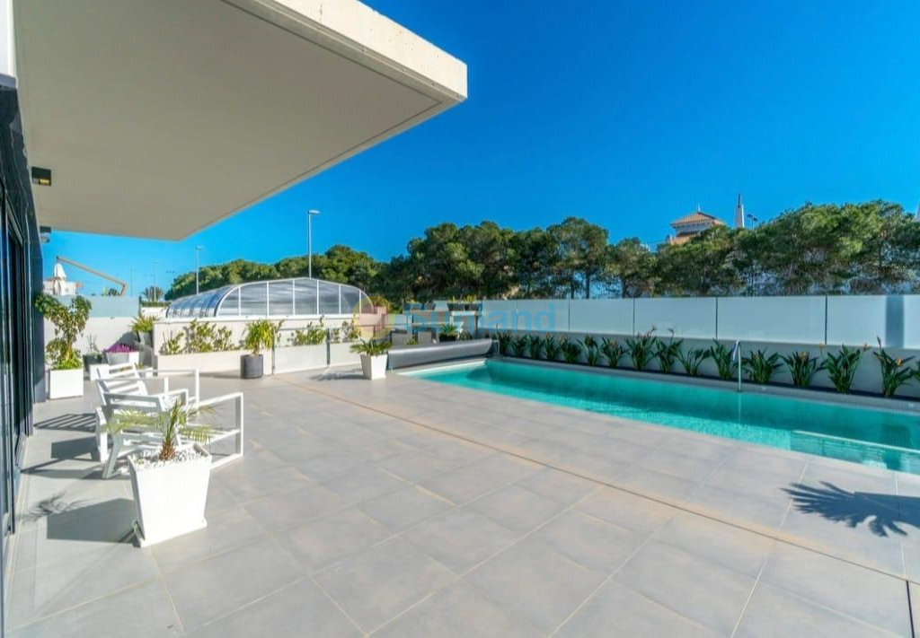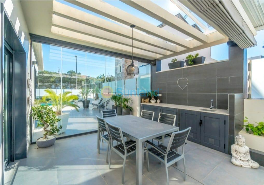 Campoamor, Chalet moderno de lujo con una parcela de 479 m2 y una vivienda de 234 m2 con 3 dormitorios ( 2 de los cuales en la planta baja), 3 baños, amplio salón comedor, cocina con su isla, gran terraza, piscina privada, solarium con zona acristalada y jacuzzi con vistas al mar, zona de barbacoa, se vende amueblada, con plaza de parking en la parcela y esta andando a la playa de aguamarina.. .