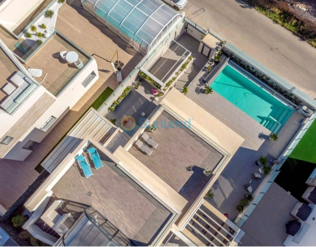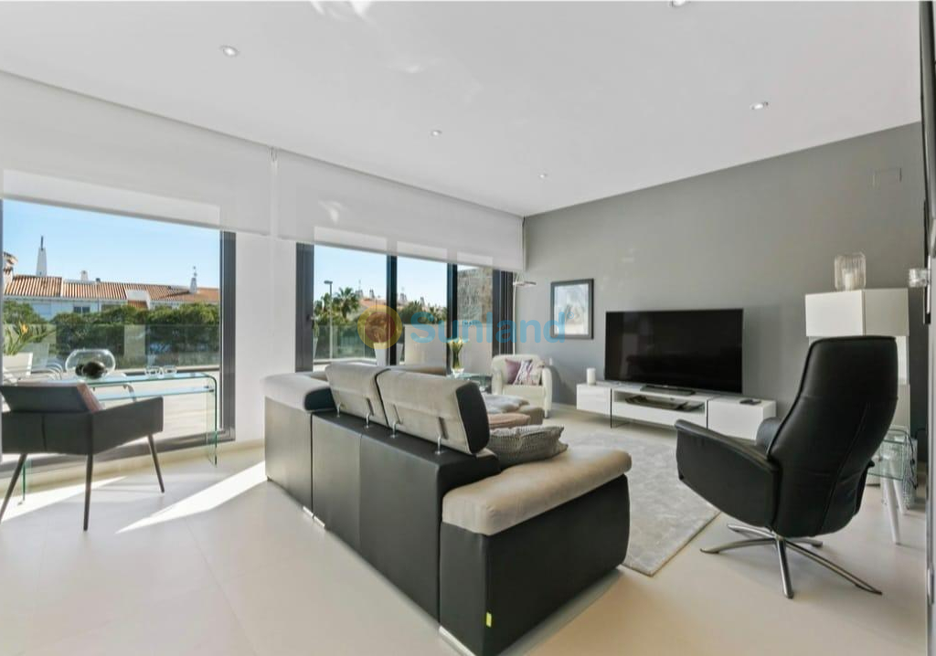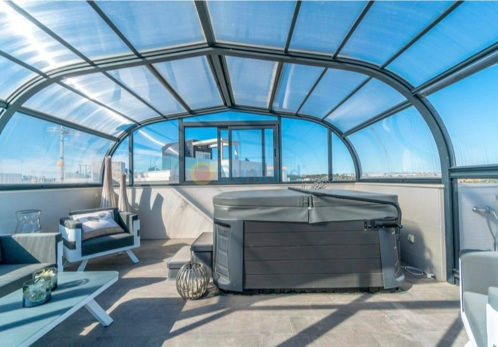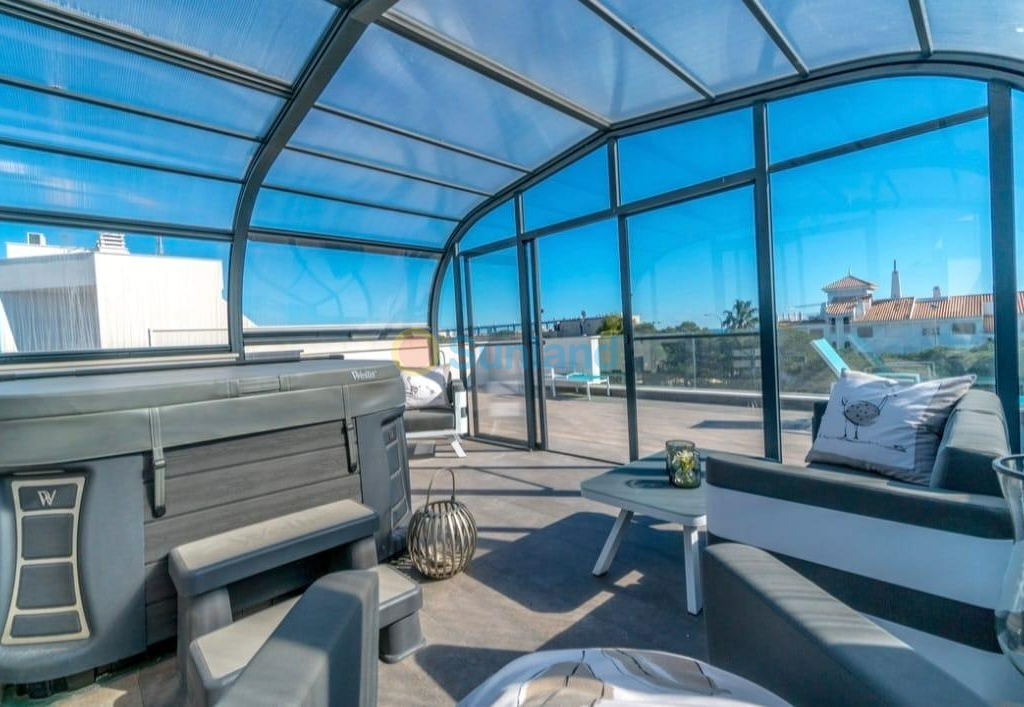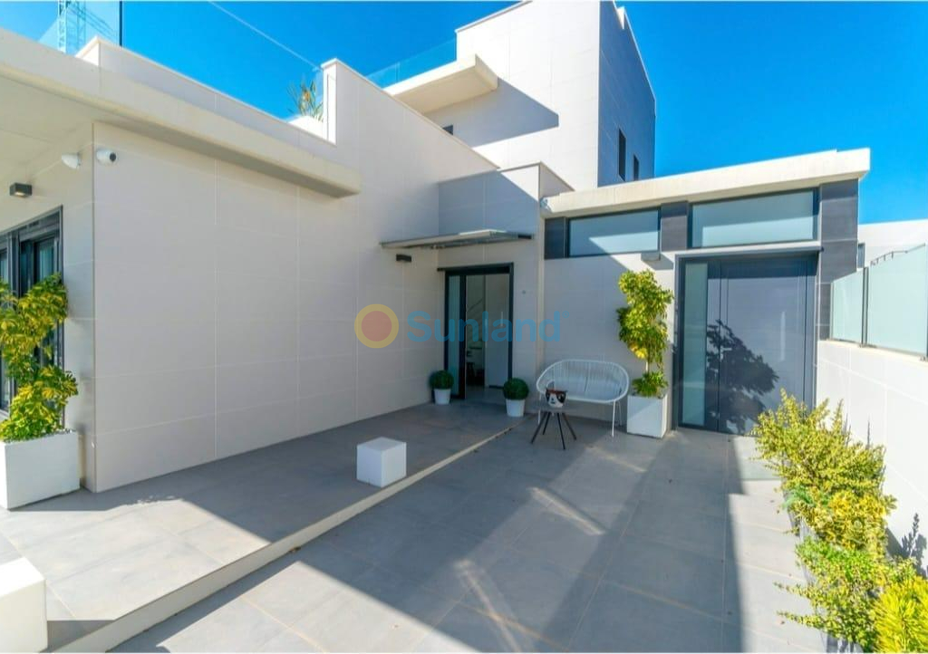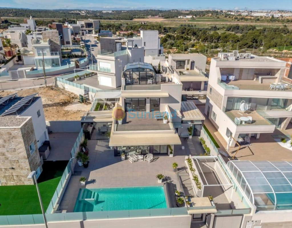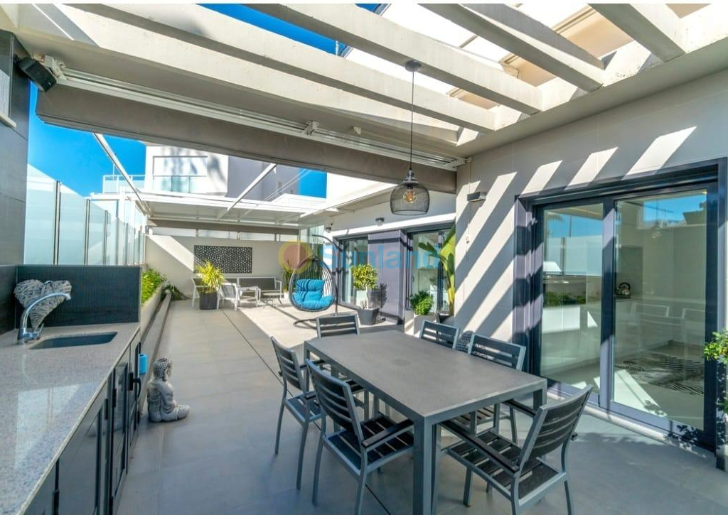 Campoamor, Chalet moderno de lujo con una parcela de 479 m2 y una vivienda de 234 m2 con 3 dormitorios ( 2 de los cuales en la planta baja), 3 baños, amplio salón comedor, cocina con su isla, gran terraza, piscina privada, solarium con zona acristalada y jacuzzi con vistas al mar, zona de barbacoa, se vende amueblada, con plaza de parking en la parcela y esta andando a la playa de aguamarina.. .