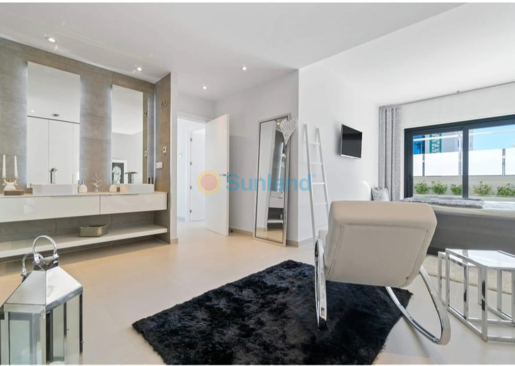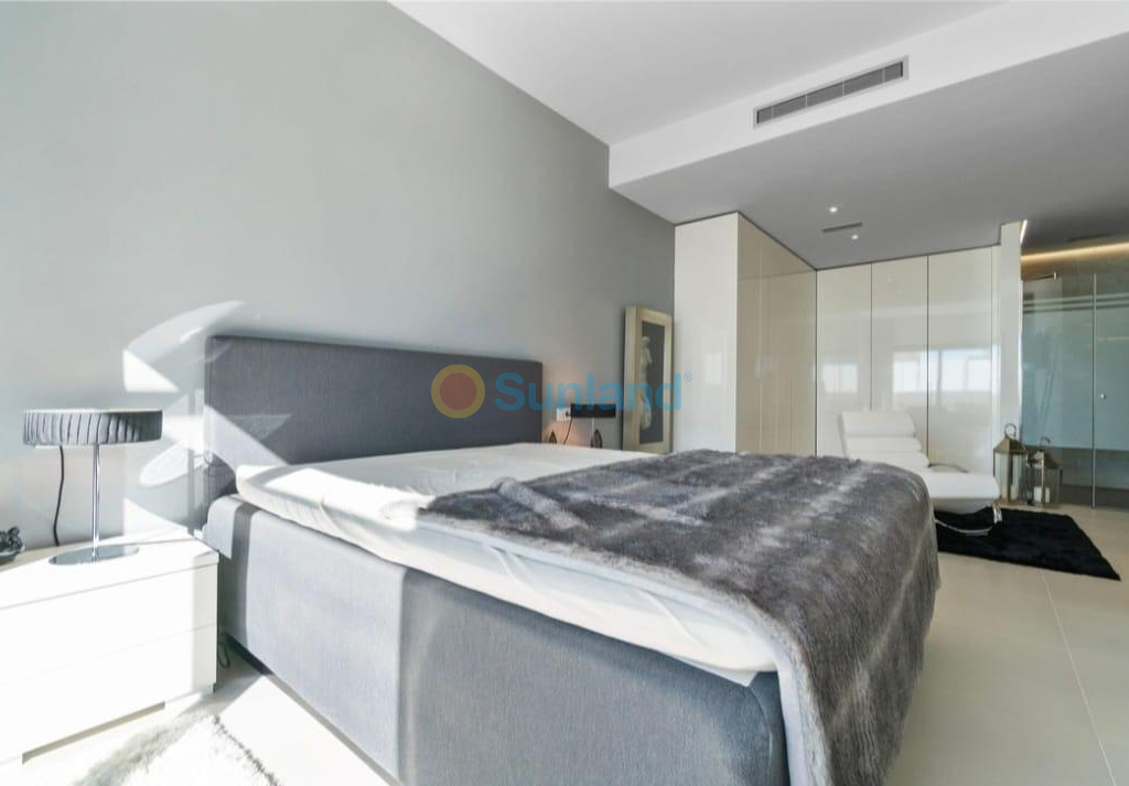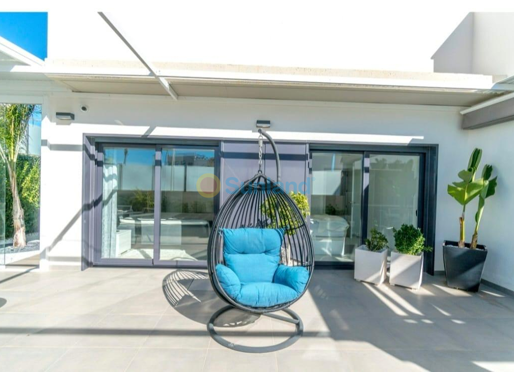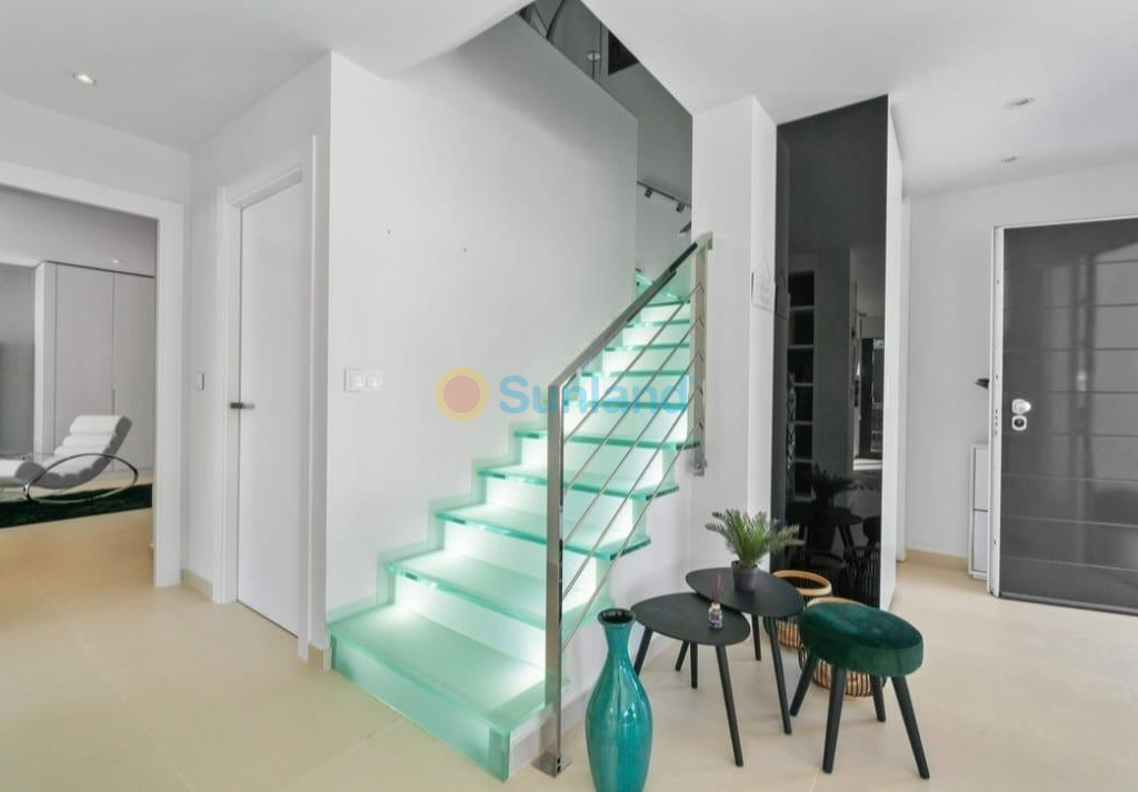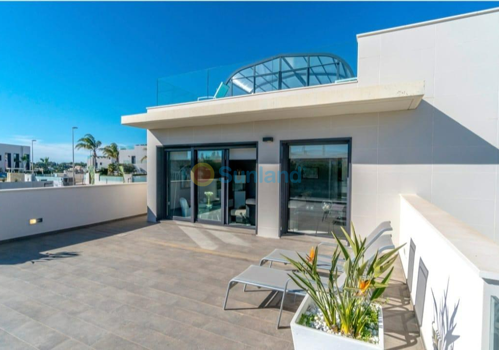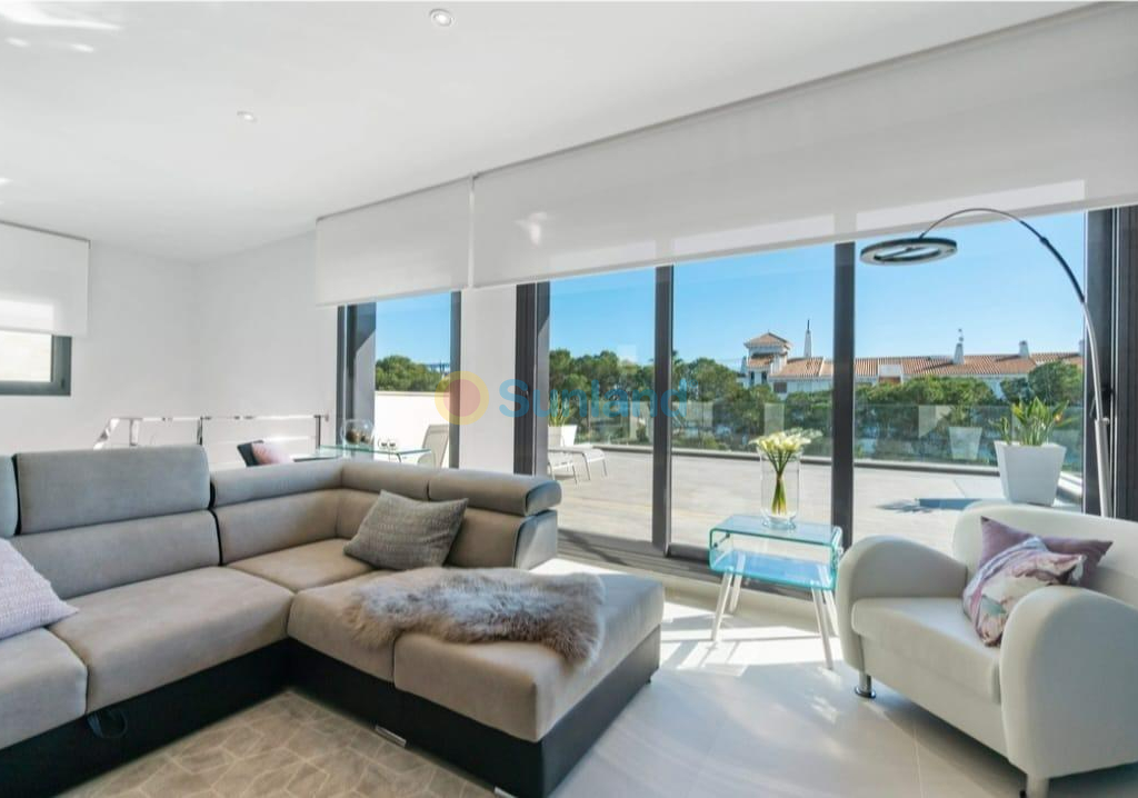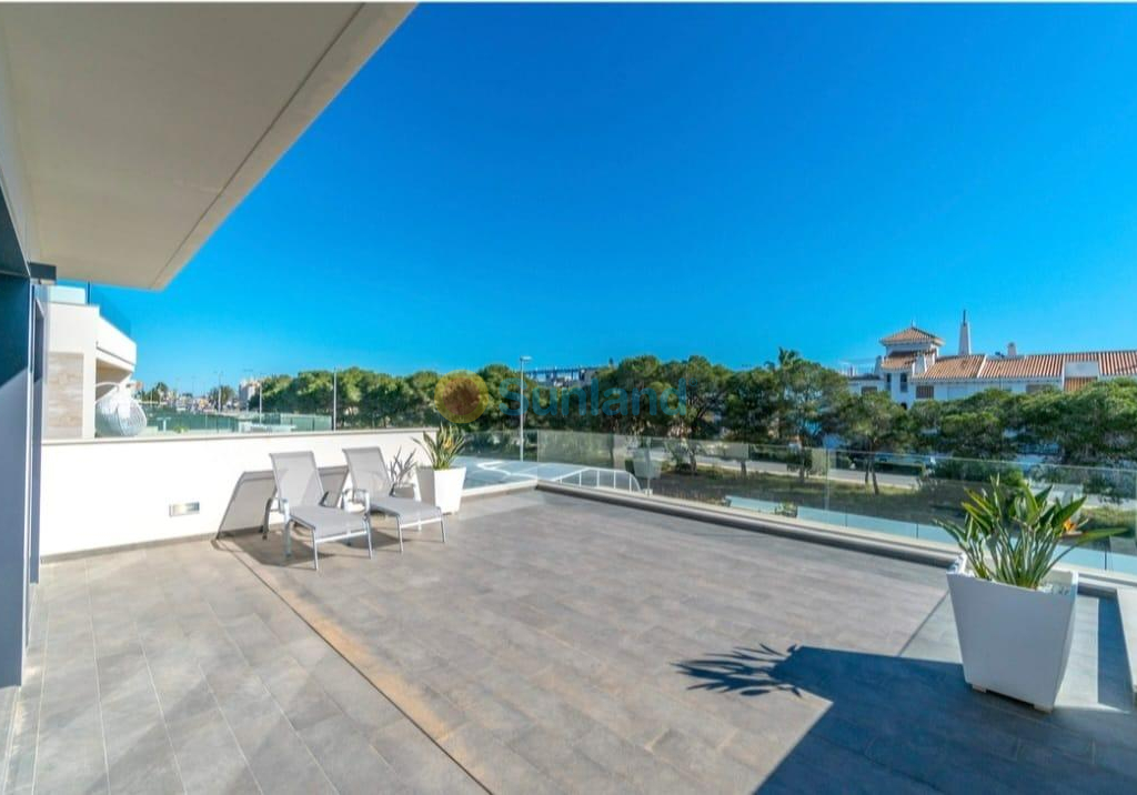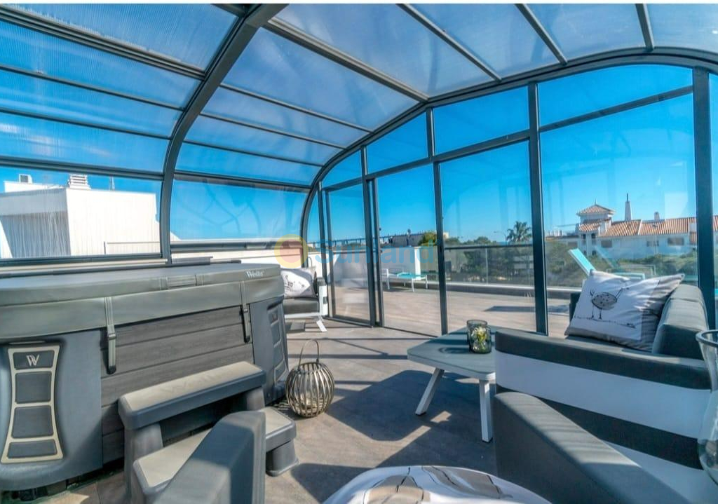 Campoamor, Chalet moderno de lujo con una parcela de 479 m2 y una vivienda de 234 m2 con 3 dormitorios ( 2 de los cuales en la planta baja), 3 baños, amplio salón comedor, cocina con su isla, gran terraza, piscina privada, solarium con zona acristalada y jacuzzi con vistas al mar, zona de barbacoa, se vende amueblada, con plaza de parking en la parcela y esta andando a la playa de aguamarina.. .