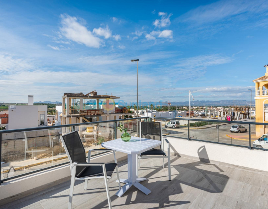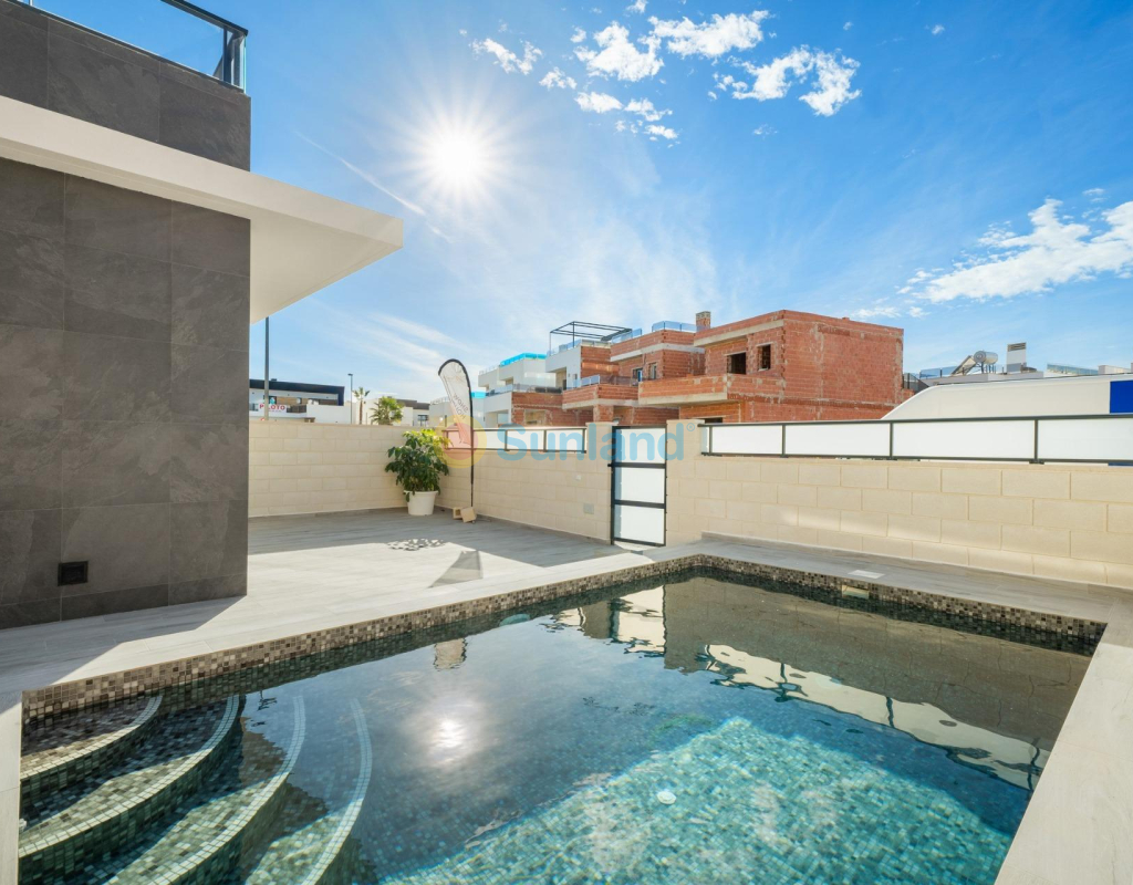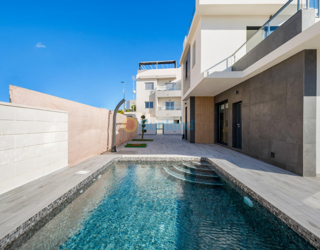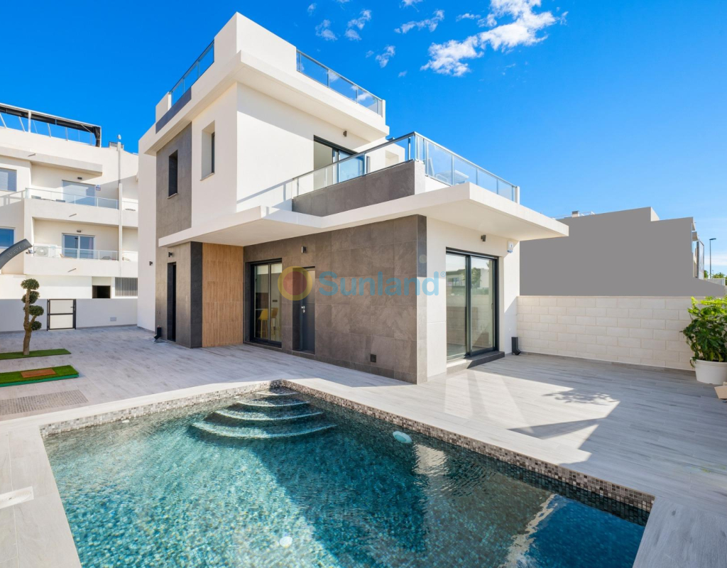 PAREADO DE OBRA NUEVA EN BENIJÓFAR CON PISCINA PRIVADA Pareado con 3 dormitorios, 3 cuartos de baños, cocina abierta al salon-comedor, parcela de 192 m2 con piscina privada y terraza en planta primera de 16 m2 con vistas despejadas. Posibilidad de habilitar un solárium privado de 46 m2 con un coste extra. Benijófar se encuentra en el margen derecho del río Segura, está bien comunicado con Orihuela y Guardamar del Segura por la carretera que te conducirá a sus estupendas playas de arena fina, a menos de 8km de distancia. Hay varios campos de golf en los alrededores (a menos de 4 km). También está comunicado mediante una carretera comarcal con Torrevieja. A 42 km. de Alicante y a 85 km. de Benidorm.