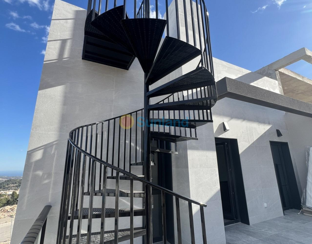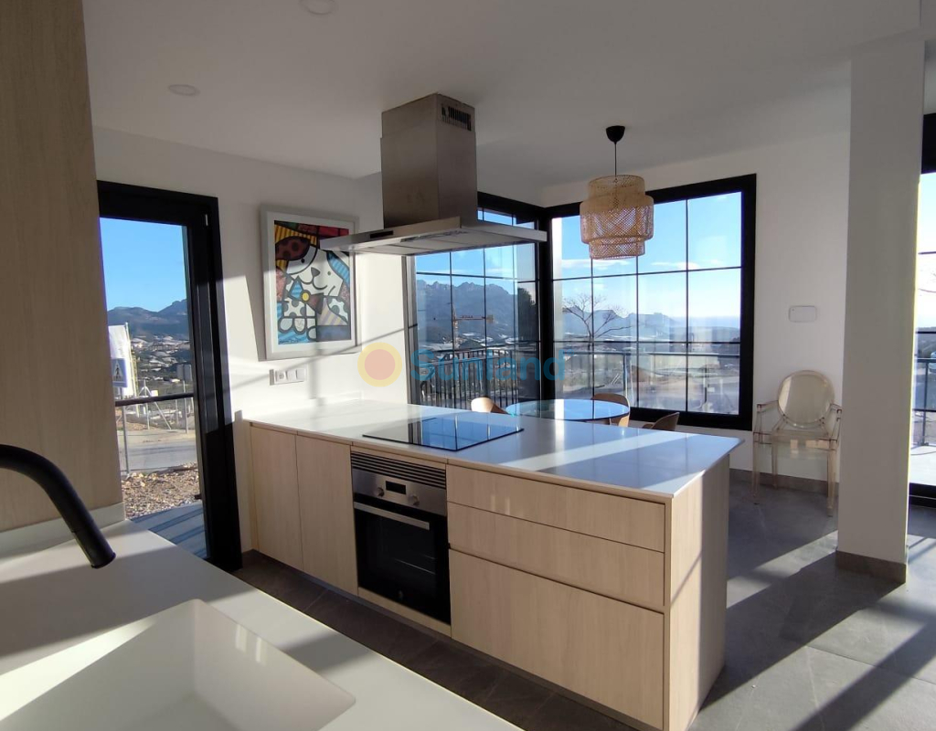 VILLAS JUMELÉES NEUVES À POLOP Nouvelle construction de maisons de ville modernes et de villas jumelées avec plusieurs terrasses et solarium, entièrement clôturées, avec parking pour véhicules et piscine privée à Polop. Propriétés modernes avec 3 chambres spacieuses avec armoires encastrées (la principale au rez-de-chaussée, avec salle de bains et dressing en suite), 2 salles de bains spacieuses, grand salon-salle à manger avec cuisine ouverte, terrasses spacieuses, grand demi sous-sol avec fenêtres. Cuisine équipée d'éléments bas et de plans de travail en pierre, avec plaque vitrocéramique, four, hotte aspirante, réfrigérateur, lave-linge, lave-vaisselle et chauffage aérothermique. Premières qualités : menuiserie intérieure en bois et stratifiés laqués blancs, menuiserie extérieure en pvc gris anthracite avec double vitrage et rupture de pont thermique, et stores automatiques à lamelles aluminium, sols céramiques de 1ère qualité antidérapants, murs lisses, porte blindée avec 5 points d'ancrage, grandes armoires encastrées. La ville de Polop offre une gamme étonnante d'options pour les amateurs de grands espaces entourés de nature et d'une paix inégalée. La municipalité jouit d'un climat méditerranéen avec des températures plus fraîches et un air plus pur. Elle est située à moins de 10 kilomètres de Benidorm, d'Altea et de leurs plages. Elle s'étend des rivières Guadalest et Algar jusqu'à la ville de Villajoyosa, en passant par les plages d'Albir et de Benidorm ; à l'intérieur des terres, elle est bordée par Callosa et Guadalest.