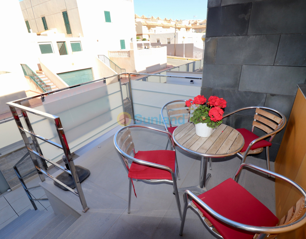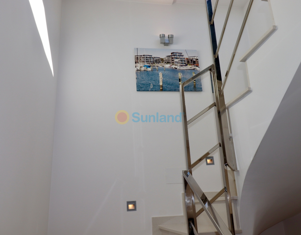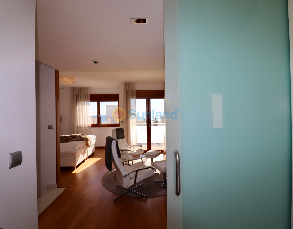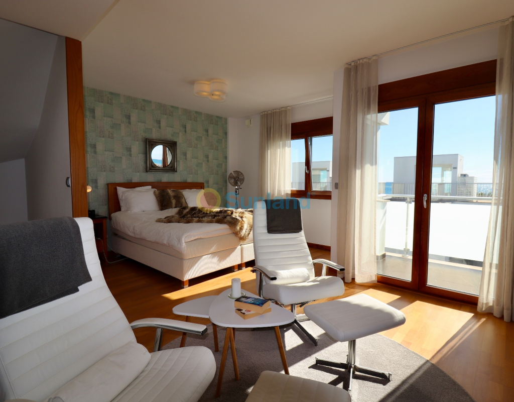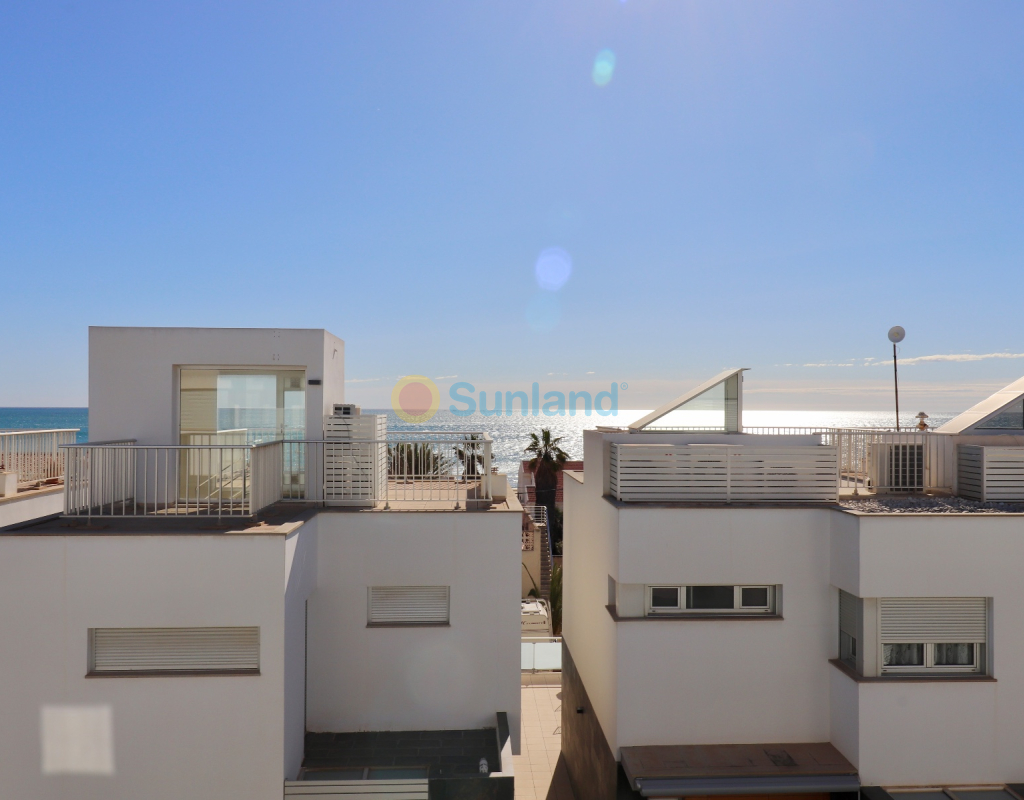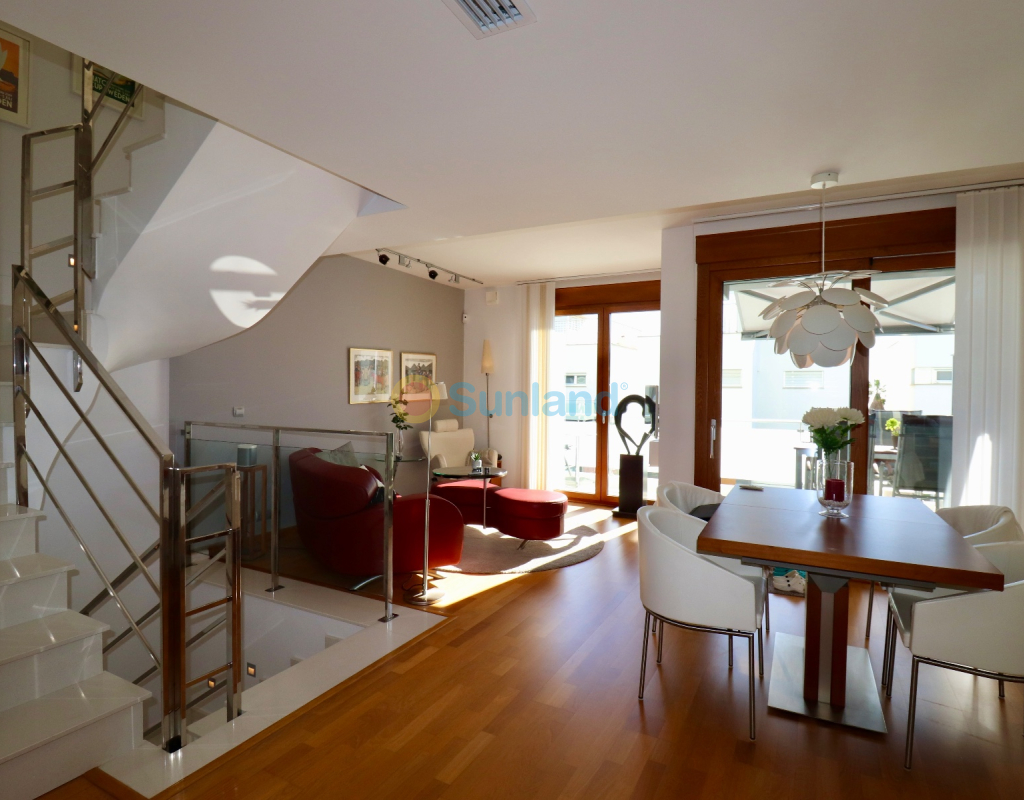 Découvrez cette maison de ville exclusive et unique sur deux niveaux, parfaitement positionnée à proximité des belles plages de Guardamar del Segura. Érigée par un constructeur renommé à la réputation de qualité irréprochable, cette luxueuse villa s'étend sur trois niveaux et offre une gamme de prestations haut de gamme. Entrez dans la propriété et soyez accueilli par un salon spacieux et une cuisine avec un plan d'étage ouvert et contemporain. La cuisine, équipée d'appareils Miele & Liebherr de première classe, allie élégance et fonctionnalité pour une expérience culinaire inégalée. Au premier étage, il y a une chambre aux dimensions généreuses, dotée d'une salle de bain privée et d'un dressing, ainsi qu'un balcon confortable avec une vue pittoresque. Un escalier moderne mène au toit-terrasse luxuriant, où vous pourrez profiter d'une vue imprenable sur la mer, idéale pour bronzer, barbecues et moments de détente. Descendez au niveau intermédiaire et découvrez deux autres chambres et une salle de bain, avec accès direct au jardin. Le sous-sol abrite un garage spacieux et un débarras pour un stockage supplémentaire. La maison est équipée d'une large gamme d'équipements, dont une buanderie séparée avec lave-linge/sèche-linge, des volets électriques, un système d'alarme avancé et un chauffage au sol à eau dans toute la maison. Profitez également du confort des parquets en chêne, des fenêtres économes en énergie, des stores électriques et des doubles filtres de purification d'eau. De plus, la piscine commune à côté de la maison vous invite à vous détendre et à passer du temps libre. Essentiellement, cette maison de ville ultramoderne avec une touche de sophistication offre la combinaison parfaite de style, de confort et de fonctionnalité. Entièrement meublée, cette maison attend un nouveau propriétaire qui souhaite faire passer son style de vie au niveau supérieur. Bienvenue à la maison.