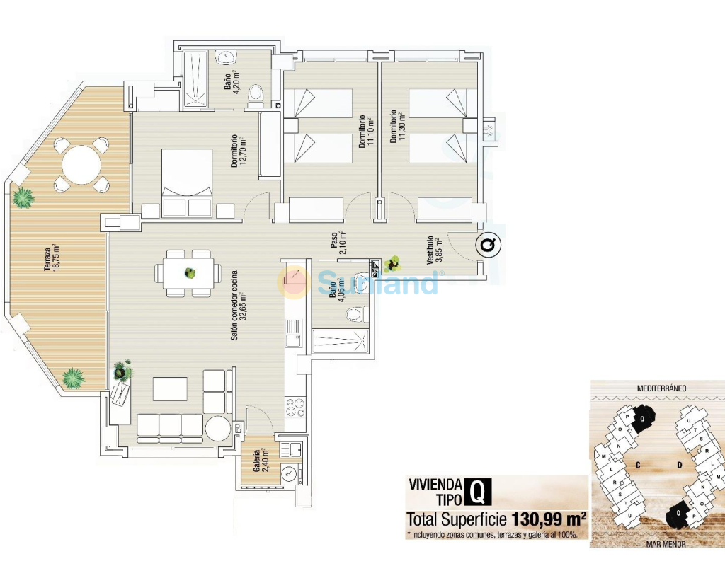 NOUVEAU COMPLEXE RÉSIDENTIEL À LA MANGA Ce nouveau complexe résidentiel est situé dans un endroit unique et spécial, entre deux mers, dans un endroit privilégié et avec tous les services dont vous pouvez avoir besoin à portée de main dans la région de Murcie, belle côte avec les plages d'eaux transparentes et peu profondes. Dans ce complexe résidentiel, les appartements ont été conçus pour tirer le meilleur parti des moindres recoins de la propriété, ainsi que de l'environnement. le choix des matériaux et la conception des logements. Vivez un monde de sensations et de moments agréables avec tous les services et activités que vous souhaitez à portée de main. Installations - Climatisation : Système de climatisation par gaines, pour le chaud et le froid, dans toute la maison (sauf dans les distributeurs et les salles de bains) et géré par une console centrale. Appareils électriques : Four en acier inoxydable. Plaque de cuisson en céramique noire avec trois brûleurs. Réfrigérateur en acier inoxydable. Hotte aspirante intégrée dans le meuble. Lave-vaisselle intégré. Espaces communs : Accès à l'immeuble par une porte en PVC blanc et double vitrage avec chambre d'air. Halls d'entrée et marches d'escalier spécialement décorés avec du marbre national. Main courante en aluminium thermo laqué blanc sur les escaliers intérieurs. Eclairage par détection de présence au sous-sol et dans les parties communes intérieures. Porte d'accès au garage sectionnelle motorisée blanche. Garde-corps d'urbanisation en acier inoxydable. Système de vidéo-porte. Parabole satellite avec chaînes européennes. Piscine avec solarium paysager. La Manga del Mar Menor est une bande de terre naturelle entourée de deux mers, la Mar Menor et la Méditerranée. À cette rareté s'ajoutent les multiples possibilités de loisirs et de temps libre, restaurants, supermarchés, censeurs médicaux, pharmacies, censeurs de sports nautiques, terrains de golf. La Manga est située sur la côte nord de la Costa Calida et est une destination de vacances très prisée des touristes. L'étroite bande de terre qui sépare la lagune chaude de la mer plus froide présente un microclimat unique. C'est l'une des régions les plus exotiques d'Espagne. L'aéroport de Corvera se trouve à environ 1 heure de route et celui d'Alicante à environ 2 heures.