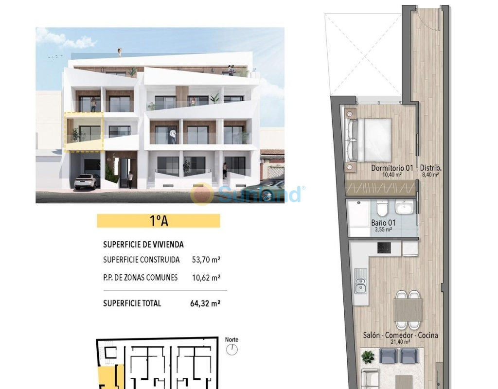 Appartements modernes à 250 m de la plage d'El Cura à Torrevieja Nouveau développement dans un emplacement de choix Ce nouvel immeuble d'appartements est situé à seulement 250 mètres de la célèbre plage d'El Cura à Torrevieja, offrant aux résidents un accès facile à l'une des plages les plus populaires de la région. L'immeuble se compose de 17 unités, comprenant des appartements de 1 et 2 chambres à coucher, chacun avec 1 ou 2 salles de bains. En outre, des penthouses sont disponibles avec des solariums privés et des vues imprenables sur la mer, parfaits pour profiter du style de vie méditerranéen. Des équipements haut de gamme pour se détendre Les résidents peuvent profiter de la piscine communautaire et du solarium sur le toit, idéal pour se détendre après une journée à la plage. L'immeuble propose également des places de parking souterrain et des salles de stockage en option, moyennant un coût supplémentaire, ce qui offre plus de commodité et de sécurité aux résidents. La vie urbaine animée de Torrevieja Torrevieja est une ville animée, connue pour ses activités culturelles et récréatives tout au long de l'année, ce qui en fait une destination idéale pour les résidents permanents et les vacanciers. Avec un climat doux et plus de 300 jours de soleil par an, la région est parfaite pour ceux qui aiment les activités de plein air et la vie à la plage. Emplacement idéal avec accès facile aux points d'intérêt Cette propriété est idéalement située à proximité de tous les services essentiels, y compris les supermarchés, les restaurants et les lieux de divertissement. Les principaux centres d'intérêt sont facilement accessibles : L'aéroport d'Alicante se trouve à 45 km. Plusieurs terrains de golf se trouvent à 7-10 km. Le centre commercial Zenia Boulevard est à seulement 8 km. Le port de Torrevieja se trouve à 2 km de l'immeuble. Profitez d'une vie moderne en bord de mer dans un quartier animé et bien desservi, où tout ce dont vous avez besoin se trouve à une courte distance.