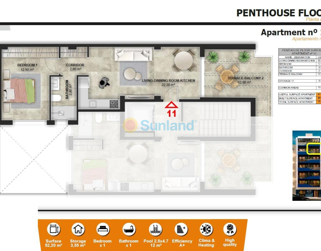 Appartements neufs à 200 mètres de la mer à Torrevieja Logements modernes dans un emplacement privilégié Découvrez cette nouvelle promotion au cœur de Torrevieja, à seulement 200 mètres de la plage de l'Acequión, l'une des plus populaires de la ville. Cet immeuble résidentiel comprend 11 logements répartis dans un environnement calme, idéal pour ceux qui souhaitent vivre près de la mer sans renoncer aux services urbains. L'emplacement offre un accès à pied au centre de Torrevieja, aux parcs, aux restaurants, aux supermarchés et à tous les services nécessaires à la vie quotidienne. Distances aux points clés : Plage de l'Acequión : 0,2 km Centre de Torrevieja : 0,7 km Port de plaisance Marina Salinas : 1,5 km Hôpital universitaire de Torrevieja : 5,5 km Camp de golf Villamartín : 10 km Centre commercial Habaneras : 3 km Aéroport d'Alicante : 45 km Différents types de logements pour tous les besoins Le bâtiment propose une sélection de studios, d'appartements de 1 et 2 chambres et d'appartements-terrasses avec de grandes terrasses privées. Tous les logements disposent d'un débarras au rez-de-chaussée et d'un accès à des installations communes modernes qui améliorent le niveau de confort et le style de vie. Espaces communs pour le bien-être et le plaisir Le toit-terrasse du bâtiment a été conçu comme un espace commun haut de gamme avec : Piscine Solarium Sauna Espace barbecue Idéal pour profiter du climat méditerranéen de Torrevieja tout au long de l'année. Des prestations haut de gamme dans chaque logement Les logements ont été construits avec des matériaux de première qualité et un design contemporain : Menuiserie extérieure en PVC avec double vitrage Guardian Sun Volets roulants motorisés avec isolation thermique Porte d'entrée blindée avec serrure de sécurité Cuisine équipée avec meubles hauts et bas et appareils électroménagers intégrés : plaque vitrocéramique, four, micro-ondes, hotte aspirante et lave-vaisselle Production d'eau chaude par système aérothermique Climatisation entièrement installée Éclairage LED Ascenseur dans le bâtiment Vivez à deux pas de la mer et du centre-ville Torrevieja est l'une des villes côtières les plus dynamiques et en pleine croissance de la Costa Blanca, célèbre pour son climat, ses plages, ses salines et sa vie culturelle. Cette promotion est idéale comme résidence principale, investissement ou résidence secondaire pour les vacances. Contactez-nous dès aujourd'hui pour plus d'informations ou pour organiser une visite et assurez-vous votre maison en bord de mer à Torrevieja.