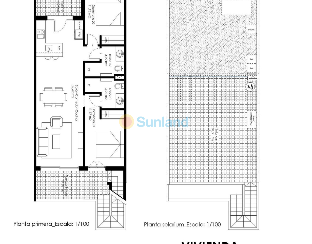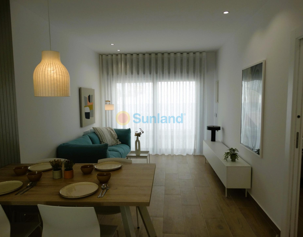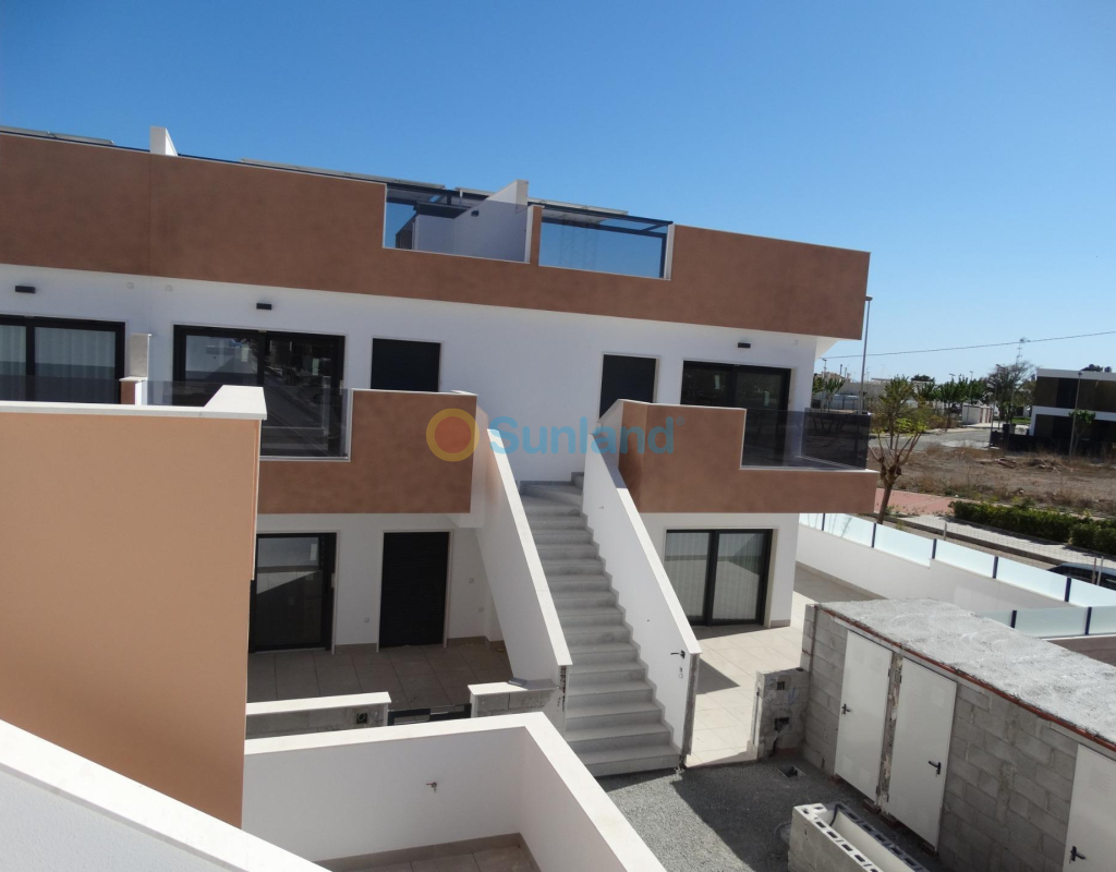 Bungalows neufs avec solarium ou jardin à Pilar de la Horadada Résidence moderne sur la Costa Blanca Sud Situé dans la charmante commune de Pilar de la Horadada, ce nouveau lotissement de bungalows offre un style de vie confortable et méditerranéen dans l'une des zones les plus attrayantes de la Costa Blanca. Pilar de la Horadada est connue pour son ambiance accueillante, son excellent climat et ses longues plages de sable fin telles que Las Higuericas et Mil Palmeras, idéales pour profiter en famille ou pratiquer des sports nautiques. Distribution et types de logements Le complexe se compose de 28 bungalows modernes disponibles en versions 2 et 3 chambres, répartis comme suit : Rez-de-chaussée avec jardin privé Étages supérieurs avec solarium privé et débarras attribué La plupart des logements sont orientés au sud, ce qui garantit une excellente luminosité, et offrent une vue sur la piscine communautaire ou le parc adjacent. Espaces fonctionnels et bien équipés Chaque logement a été conçu avec des espaces spacieux et fonctionnels : Cuisine américaine intégrée avec grand salon-salle à manger Armoires encastrées Terrasse privée dans chaque unité Place de parking incluse De plus, les logements disposent de : Eau chaude par système aérothermique Pré-installation de la climatisation Menuiserie extérieure en PVC avec double vitrage et volets en aluminium Meubles de salle de bains inclus Espaces communs et environnement naturel Le complexe résidentiel comprend une piscine communautaire entourée d'espaces verts, parfaite pour profiter du soleil et de la tranquillité. À seulement 4 km de la plage de Las Higuericas, vous pouvez facilement vous y rendre à pied ou à vélo en empruntant l'agréable promenade qui mène à la mer. Excellent emplacement et connectivité L'emplacement du lotissement permet d'accéder à tous types de services et de points d'intérêt : Supermarchés, magasins, bars et restaurants à moins d'1 km Terrains de golf tels que Lo Romero à 6 km Centre commercial Dos Mares à 11 km Plages de Mil Palmeras et Torre de la Horadada à seulement 5 minutes Aéroport de Murcie (Corvera) à 40 km Aéroport d'Alicante à 65 km Votre nouvelle vie au soleil Ce lotissement à Pilar de la Horadada représente une excellente opportunité de profiter de la vie méditerranéenne dans une maison moderne et bien située. Contactez-nous dès aujourd'hui pour plus d'informations ou pour organiser une visite et faire le pas vers votre nouvelle maison sur la Costa Blanca.