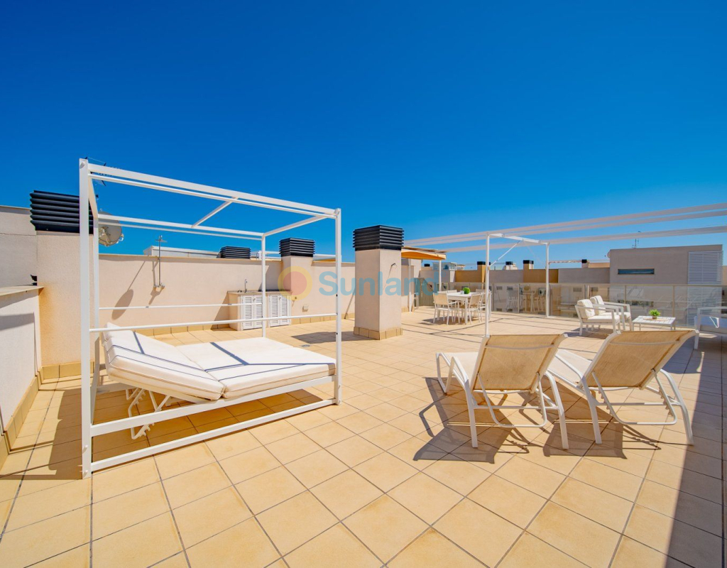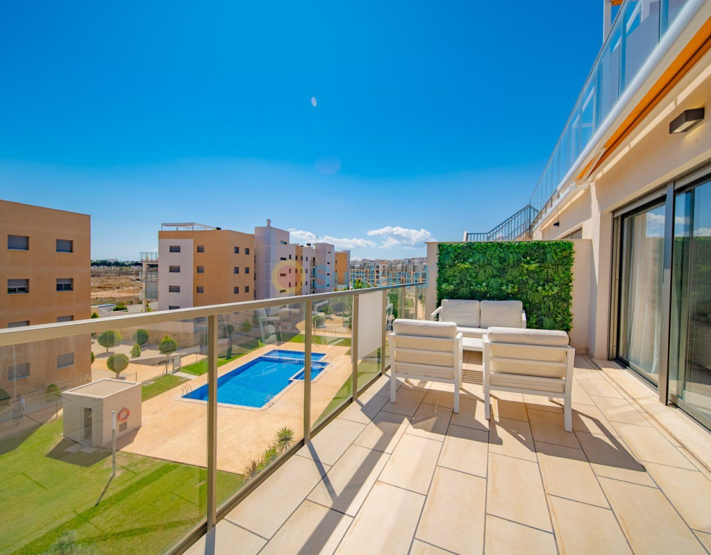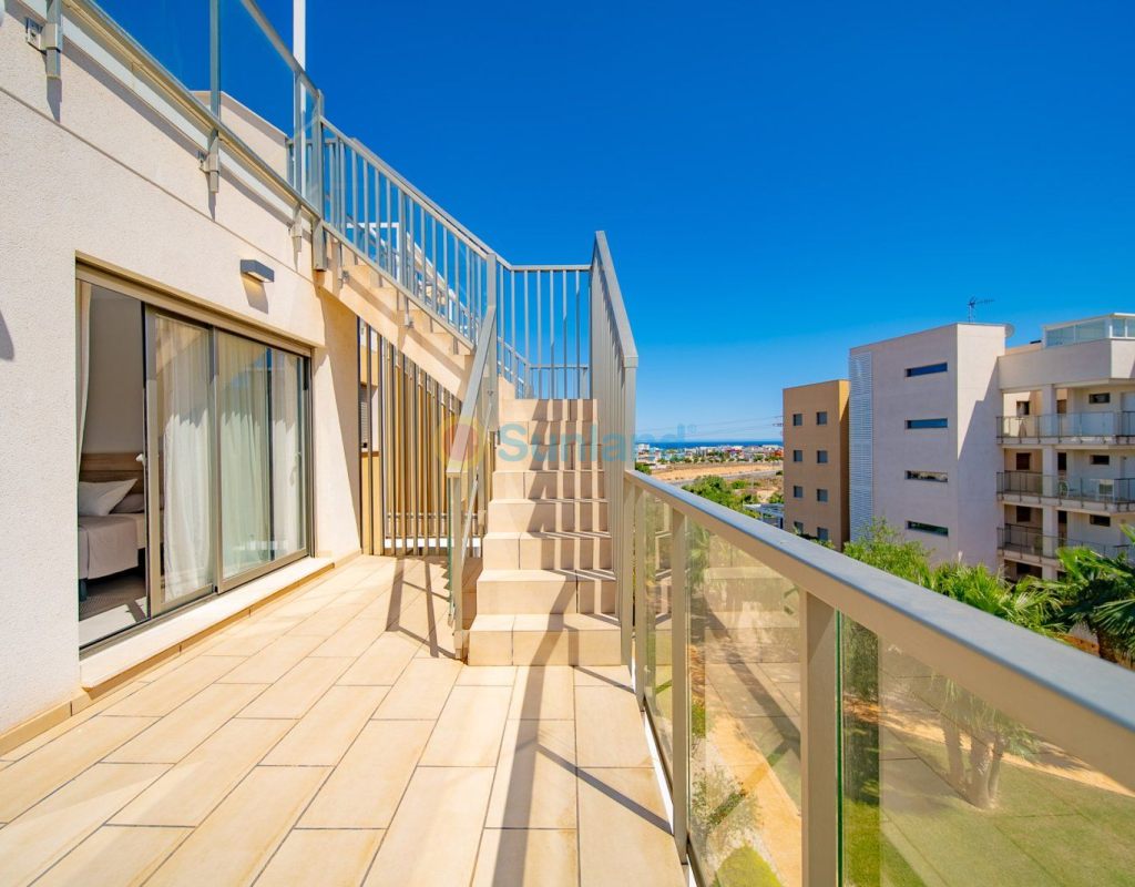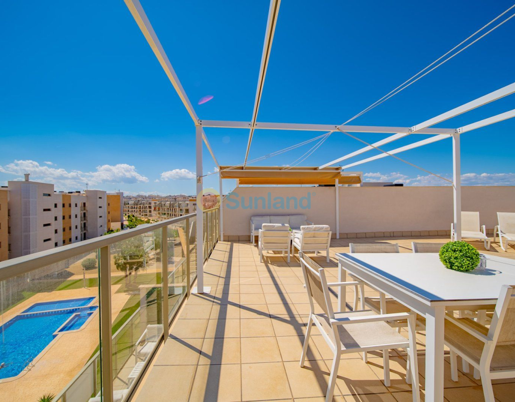 Penthouse avec 3 chambres à Villamartin, Orihuela Costa. Nous vous présentons ce fantastique penthouse situé dans Villamartin Gardens, un complexe résidentiel privé avec piscine commune. Son emplacement est idéal, dans une zone qui offre tout : Commerces, supermarchés, à quelques minutes du centre commercial Zenia Boulevard et du golf de Villamartin. Large choix de restaurants, bars, cafés, pharmacie à proximité. Plages d’Orihuela Costa à seulement 5 minutes en voiture. Caractéristiques principales 3 chambres et 2 salles de bains (dont une en suite) Chauffage au sol dans les salles de bains Grand salon-salle à manger Cuisine avec bar américain Buanderie Terrasse de 22 m² Orientation sud Solarium privé de 85 m² Parking souterrain Débarras 2 piscines communautaires La propriété est vendue meublée et avec des électroménagers de qualité. Elle comprend des finitions haut de gamme et a été utilisée comme résidence secondaire, donc en excellent état.
