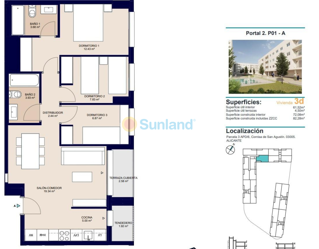 Nouveau développement résidentiel à Alicante avec vue dégagée Maisons nouvellement construites dans un emplacement privilégié Découvrez ce nouveau programme résidentiel exclusif à Alicante, conçu pour offrir un maximum de confort et de qualité de vie. Avec 84 maisons de 2 et 3 chambres, ce complexe est situé à San Agustín - Pau II, une zone stratégique avec tous les services essentiels à portée de main. Les résidents profiteront d'un environnement moderne et fonctionnel, avec de grands espaces verts, une piscine commune, une aire de jeux pour enfants, des places de parking et des salles de stockage. De plus, sa situation en hauteur garantit une vue imprenable sur la ville et la nature environnante. Services et commodités dans le quartier Ce complexe résidentiel est entouré d'une large gamme de services qui faciliteront votre vie quotidienne : Centres éducatifs : jusqu'à 9 écoles et instituts à proximité. Supermarchés et magasins : Quatre grands supermarchés à proximité. Centre commercial de l'île de Corfou : avec des magasins, des salles de sport, des restaurants et une variété de boutiques. Installations sportives : zones d'exercice et d'activités de plein air. L'excellente infrastructure du quartier garantit le confort, la sécurité et l'accessibilité, ce qui en fait un lieu idéal pour les familles et les investisseurs. Qualité et design des logements Les logements ont été conçus selon une approche moderne et efficace, avec des matériaux de haute qualité et des technologies durables : Porte d'accès renforcée pour plus de sécurité. Installation d'un système de climatisation (chaud et froid). Menuiserie à rupture de pont thermique et double vitrage pour améliorer l'isolation thermique et acoustique. Production d'eau chaude sanitaire par aérothermie, garantissant l'efficacité énergétique et la durabilité. Environnement avec accès rapide aux principaux points d'intérêt. Le quartier de San Agustín est situé sur une légère colline, offrant des vues panoramiques sur la ville d'Alicante, le mont Benacantil et les montagnes environnantes. Son climat méditerranéen et la proximité d'espaces verts et de loisirs en font un lieu de vie idéal. Distances clés : Centre ville d'Alicante - 2 km. Aéroport d'Alicante-Elche - 14 km. Plage de San Juan - 6 km. Terrain de golf d'Alicante - 7 km. Port d'Alicante - 5 km. Découvrez le style de vie méditerranéen à Alicante Alicante offre un climat exceptionnel, une vie culturelle dynamique et une infrastructure de premier ordre, ce qui en fait l'une des villes les plus prisées d'Espagne. Ce nouveau développement résidentiel à San Agustin - Pau II combine un design élégant avec un emplacement imbattable. Contactez-nous dès aujourd'hui pour organiser une visite et découvrir votre prochaine maison à Alicante.