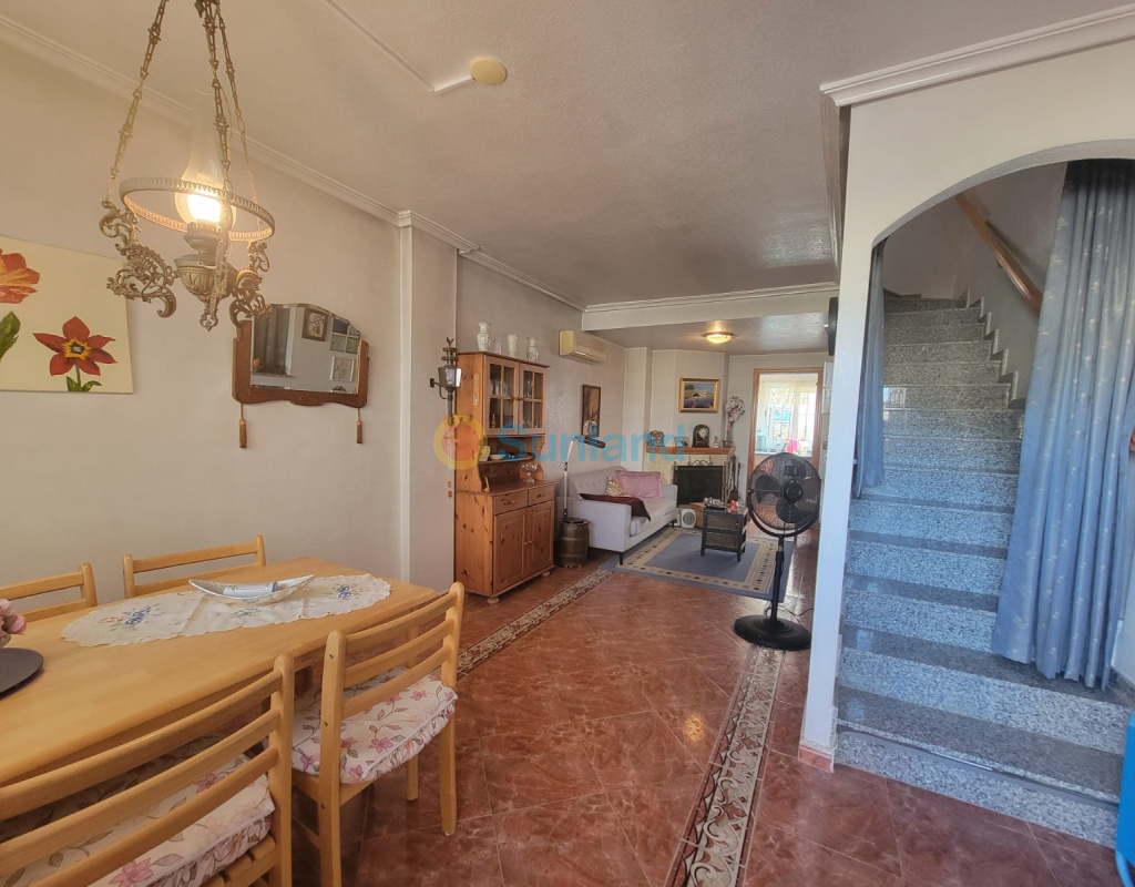Découvrez cette magnifique maison jumelée de trois étages située dans un quartier résidentiel bien entretenu avec piscine et jardins à Playa Flamenca, à seulement cinq minutes en voiture des plages et à une agréable promenade du centre commercial Zenia Boulevard. Au rez-de-chaussée, une spacieuse terrasse avant mène à un lumineux salon-salle à manger avec cheminée, une cuisine séparée entièrement équipée avec accès à un patio privé et une buanderie, et une élégante salle de bain avec douche à l'italienne. Le premier étage abrite deux chambres doubles avec placards intégrés et une salle de bain complète avec baignoire ; la chambre principale a accès à une terrasse donnant sur la piscine. Le dernier étage comprend un charmant grenier avec une chambre double et une salle de bain privée. La propriété comprend un spacieux garage fermé de 23 m² avec un débarras au sous-sol commun, la climatisation, des meubles et est en parfait état, prête à emménager. Situé dans un quartier privilégié, entouré de toutes les commodités, boutiques et restaurants, et à quelques pas du célèbre marché hebdomadaire de Playa Flamenca, où vous pourrez profiter du shopping, des tapas et d'une atmosphère incomparable. Climat: Le climat de la Costa Blanca, souvent considéré comme le meilleur d'Europe, favorise un mode de vie sain et convivial en plein air, caractérisé par de nombreuses installations sportives et de loisirs, ainsi que par des stations balnéaires cosmopolites et dynamiques qui se distinguent par leurs services haut de gamme, certains exclusifs et considérés comme véritablement luxueux. Tous ces services s'adressent à une clientèle exigeante en quête de qualité et de proximité. La Costa Blanca bénéficie de plus de 300 jours de soleil par an. Un véritable paradis avec d'excellentes connexions avec toute l'Europe. L'aéroport d'Alicante-Elche dispose d'installations modernes et d'un accès facile et pratique depuis n'importe quelle partie de la province. Autour: La Costa Blanca continue d'attirer des gens de toute l'Europe et du monde entier, car elle offre une qualité de vie unique dans un cadre magnifique au bord de la mer Méditerranée, entourée de montagnes et d'une végétation luxuriante. Outre les terrains de golf et les marinas du littoral, la région offre également des pistes de ski dans les montagnes voisines de la Sierra Nevada, de Javalambre et de Valdelinares, véritables paradis pour les amateurs de sports d'hiver, au cœur de paysages naturels magnifiques. La Costa Blanca offre un art de vivre d'une richesse unique, où les plus belles plages et criques de la Méditerranée se mêlent à un arrière-pays peuplé de montagnes et de villes qui recèlent des cultures et des monuments historiques uniques. Nous avons un cadeau pour vous : Dans notre agence immobilière, nous vous aidons à transformer votre nouveau bien en la maison de vos rêves en vous offrant une visite technique gratuite de notre bureau d'études. Notre équipe vous conseillera sur les améliorations et les options de décoration pour votre propriété. C'est entièrement gratuit ! IMPORTANT!! N'oubliez pas que nos services n'augmentent JAMAIS le prix final du bien pour nos clients. Notre expérience dans le secteur fait de nous votre allié, un conseiller de confiance qui vous aidera à choisir la maison de vos rêves dans le meilleur quartier, vous informera sur le prix du marché des biens qui vous intéressent, sur les normes de qualité appliquées et vous fournira toutes les informations essentielles et objectives pour une expérience pleinement satisfaisante. Notre agence fait partie d'un groupe d'entreprises reconnues spécialisées dans le secteur de la maison : architecture, décoration d'intérieur, mobilier, conseil immobilier, etc. Ces ressources internes nous permettent d'offrir des services uniques et exclusifs à nos clients.