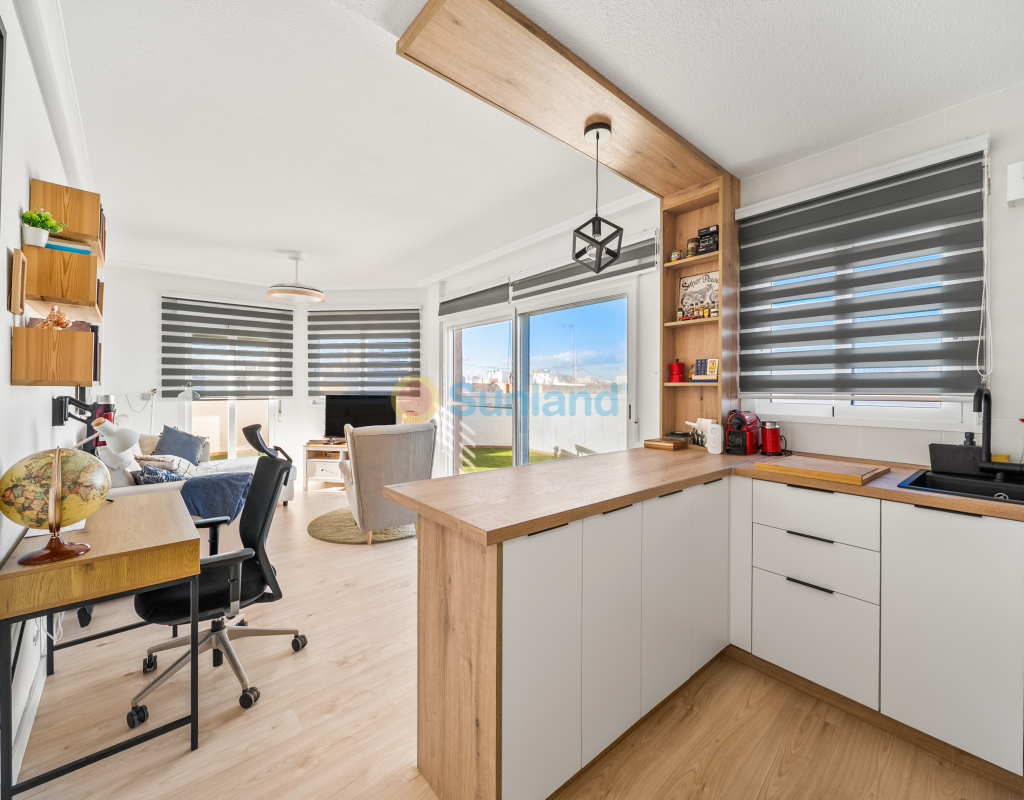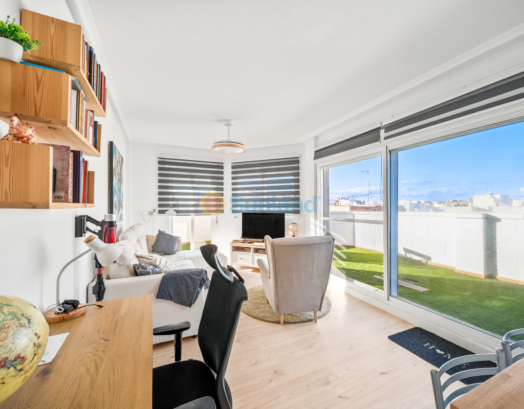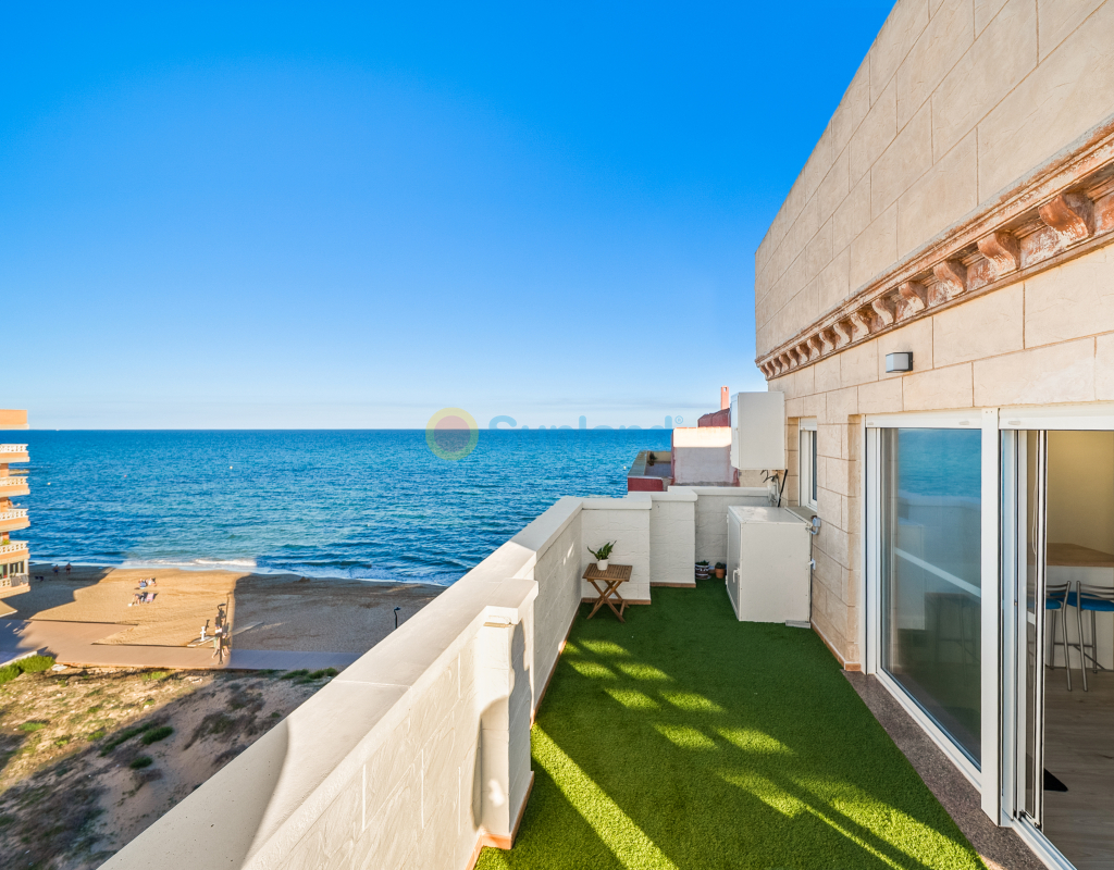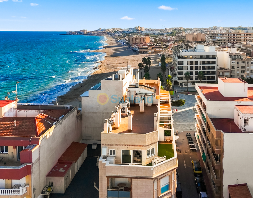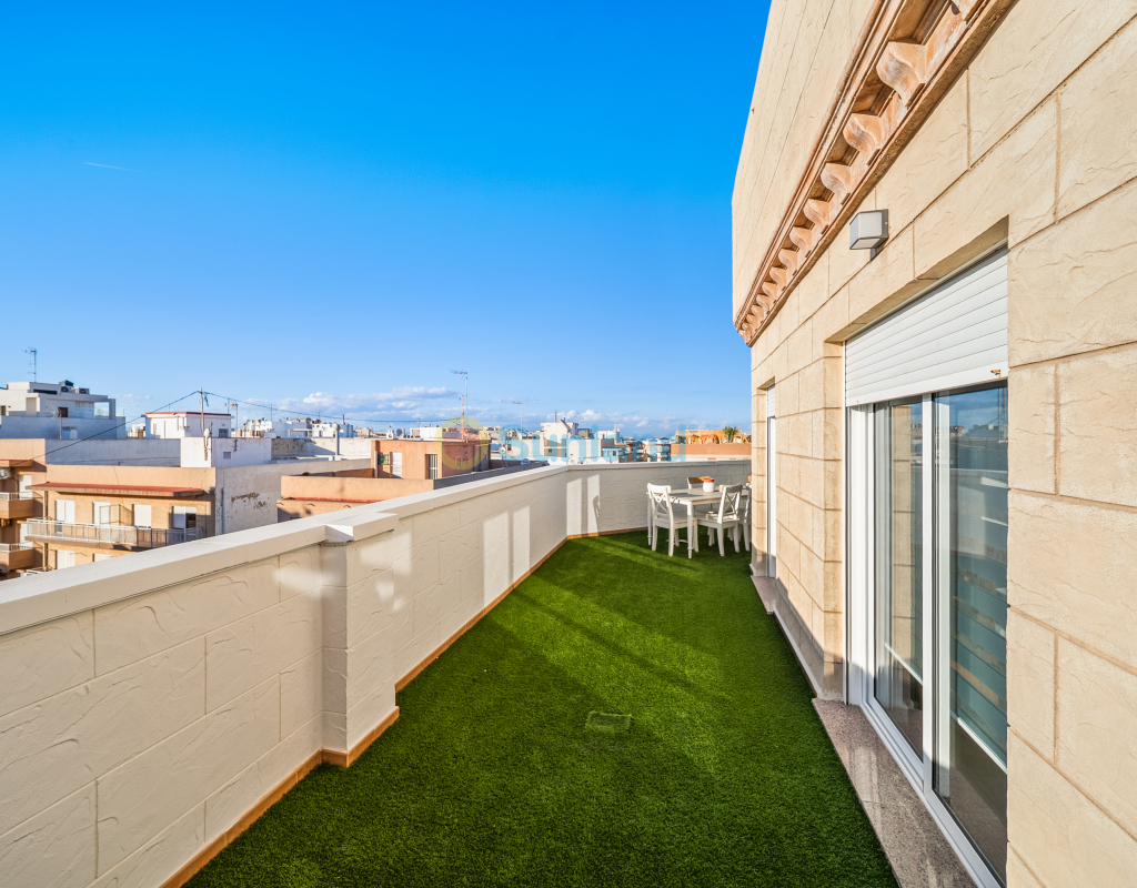 Penthouse d’angle rénové avec vue sur la mer à La Mata. Penthouse situé au 5ᵉ étage, récemment rénové et à seulement 50 mètres de la plage de La Mata. Le logement dispose de 90 m² construits et d’une grande terrasse de 45 m² avec vue sur la mer. Il comprend 2 chambres, 2 salles de bain, une cuisine ouverte et un salon lumineux avec accès direct à la terrasse. Vendu entièrement meublé et équipé, avec climatisation et orientation ouest. Caractéristiques principales : 2 chambres 2 salles de bain 90 m² construits Terrasse de 45 m² avec vue sur la mer Cuisine ouverte Climatisation Orientation ouest 5ᵉ étage Meublé Immeuble avec ascenseur Charges annuelles : IBI : 250 € Communauté : 400 € Emplacement : À 50 m de la plage de La Mata À 50 m des bars et restaurants À 100 m du supermarché À 500 m du parc naturel Laguna Salada de La Mata