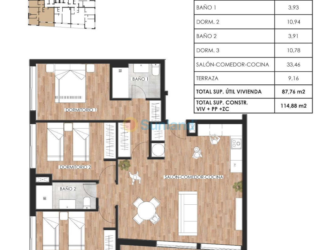 Appartements modernes neufs dans le centre de Torrevieja, Costa Blanca Complexe résidentiel exclusif avec équipements haut de gamme Découvrez un projet immobilier haut de gamme comprenant 35 appartements modernes au cœur de Torrevieja. Proposant des agencements de 1, 2 ou 3 chambres et 2 ou 3 salles de bains, cette résidence comprend également des penthouses de luxe avec solariums privés. Conçue pour offrir confort et élégance, cette communauté allie une architecture contemporaine à des finitions de haute qualité et des équipements communs exceptionnels. Emplacement privilégié dans le centre de Torrevieja Situé à seulement 600 mètres de la plage d'Acequion, ce complexe bénéficie d'un emplacement privilégié à Torrevieja. Avec des supermarchés, des restaurants, des services médicaux, des magasins et les transports publics à quelques minutes à pied, c'est le choix idéal pour ceux qui recherchent un style de vie méditerranéen confortable à proximité de tout. Torrevieja est célèbre pour son climat méditerranéen doux, ses belles plages de sable et ses promenades en bord de mer animées, ce qui en fait une destination de choix sur la Costa Blanca. Des installations de style resort pour le bien-être et la détente Le bâtiment comprend une gamme exceptionnelle d'équipements communs. Au rez-de-chaussée, vous trouverez une piscine chauffée, un espace club social et une salle de sport entièrement équipée. Le solarium sur le toit offre une véritable oasis de détente avec des chaises longues, un sauna finlandais, un espace barbecue et un mini jacuzzi. Des escaliers et un ascenseur mènent au toit, offrant confort et accessibilité à tous les résidents. Des logements de haute qualité au design contemporain Ces appartements neufs disposent de cuisines ouvertes de style américain intégrées au salon, de terrasses spacieuses, d'armoires encastrées et de cuisines entièrement équipées avec des appareils électroménagers. Les salles de bains comprennent des meubles, des parois de douche et le chauffage au sol pour un confort maximal. Il y a également une pré-installation pour la climatisation gainable. Un parking souterrain et des débarras sont disponibles en option moyennant un supplément. Entouré par la nature et la beauté du littoral Torrevieja est célèbre pour ses lagunes salées naturelles et ses parcs naturels protégés. Le parc naturel de La Mata et Torrevieja est situé à proximité de la ville et offre de magnifiques sentiers de randonnée et de superbes lacs salés roses et verts. Cet environnement unique permet un mode de vie sain et offre des paysages à couper le souffle. Distances par rapport aux principaux points d'intérêt Plage d'Acequion 0,6 km Port de Torrevieja 1,5 km Parc naturel de La Mata 4 km Golf de Villamartin 8 km Aéroport d'Alicante 45 km Aéroport de Murcie 60 km Vivez le style de vie méditerranéen Ne manquez pas l'occasion d'acquérir une maison moderne dans l'une des villes côtières les plus prisées d'Espagne. Contactez-nous dès aujourd'hui pour organiser une visite et réserver votre place dans ce nouveau programme immobilier exceptionnel.