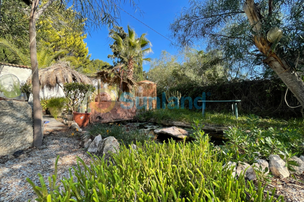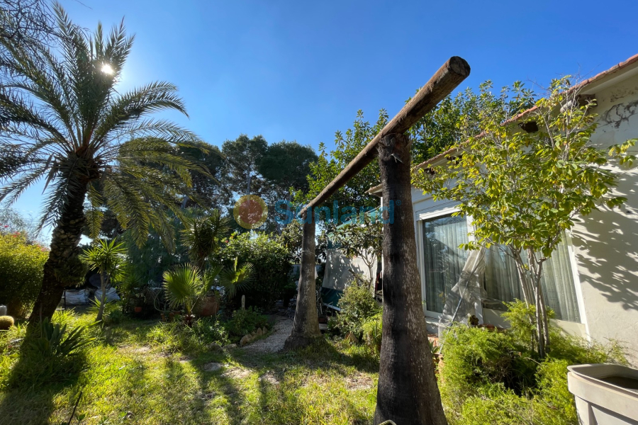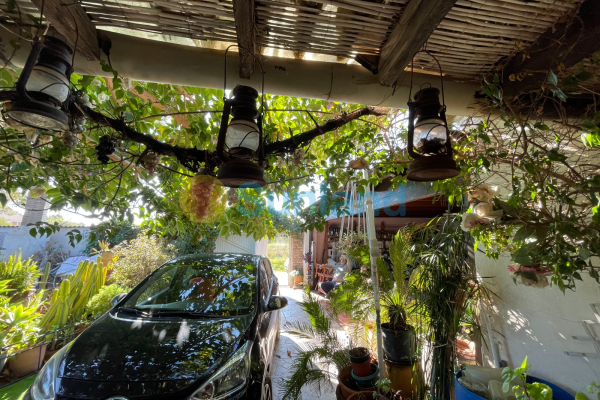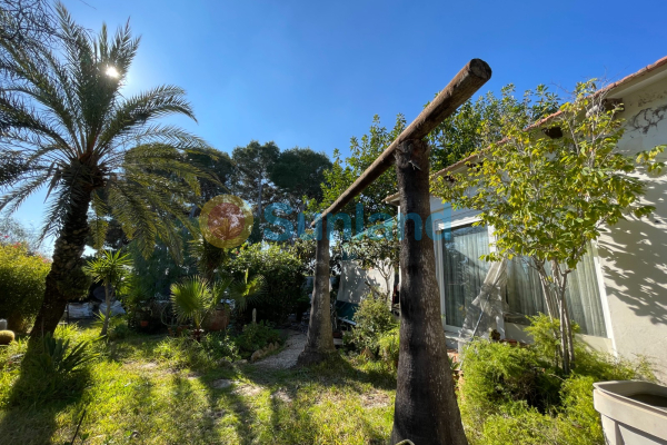 C'est une maison indépendante avec 1250 m2 de terrain plein de jardins, plusieurs arbres matures, un barbecue en pierre et un petit lac avec des nénuphars.