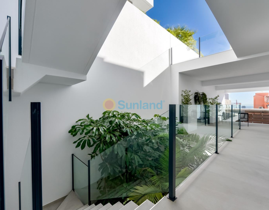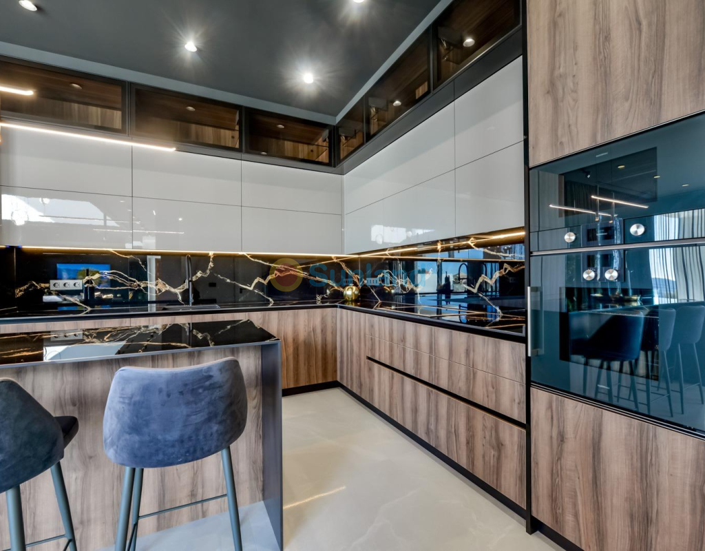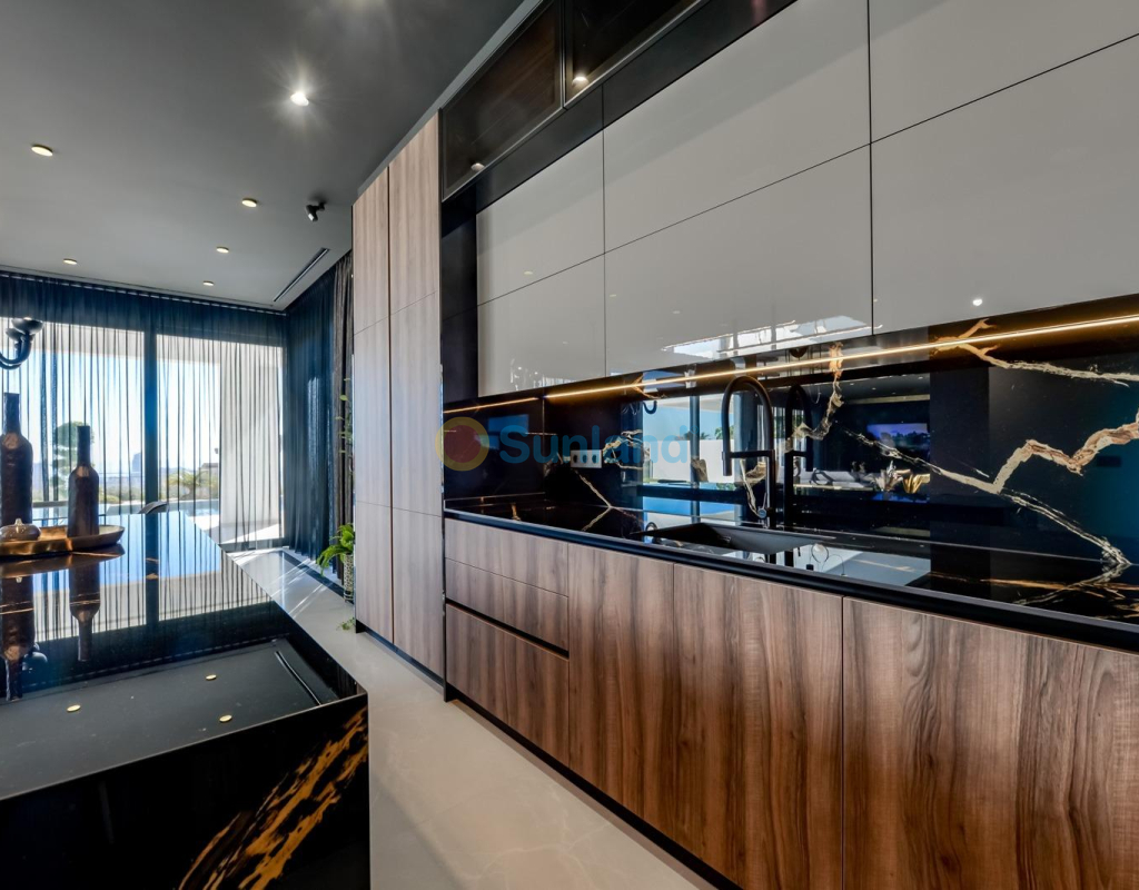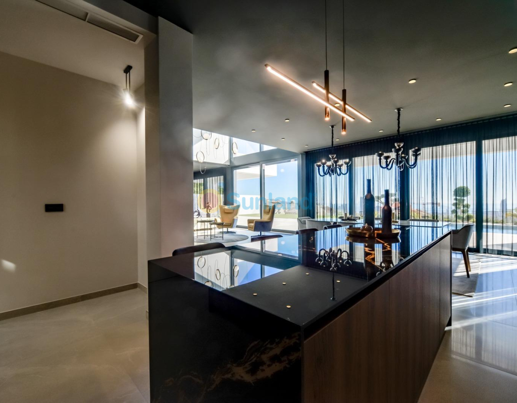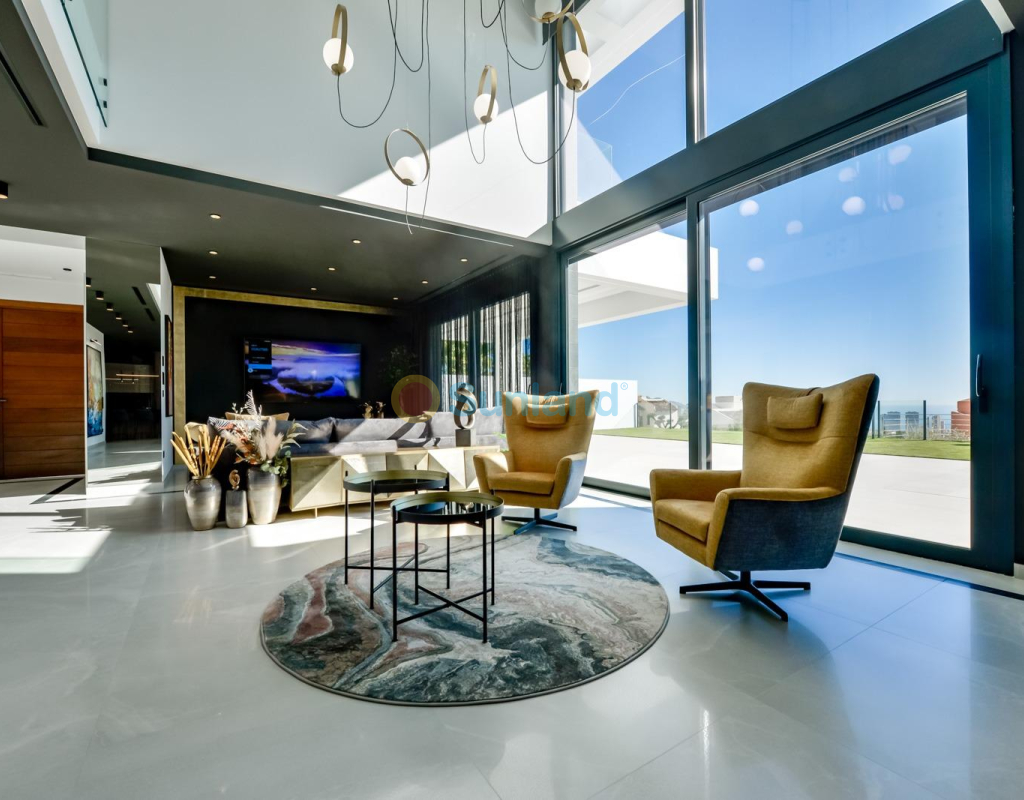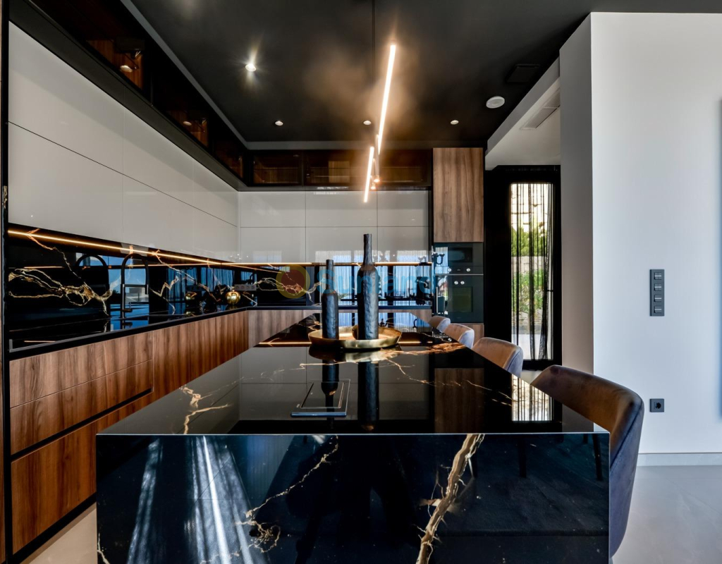 VILLA DE LUXE NEUVE A FINESTRAT AVEC VUE SUR LA MER Nouvelle construction d'une villa de luxe avec vue sur la mer à Sierra Cortina, Finestrat. En arrivant à l'urbanisation, il y a un mur en pierre naturelle d'une hauteur de 7 mètres et les portes d'accès automatiques à la villa qui arrivent au garage couvert au niveau de la rue avec double hauteur, lumière naturelle et jardin avec des palmiers de différentes hauteurs de 180 m2, une salle vitrée de 78 m2 avec ascenseur, escalier intérieur, vestiaire et assez d'espace pour mettre des fauteuils, convertir cet espace en un bureau ou simplement une salle d'attente pour les visiteurs. L'étage suivant de 190 m2 d'espace clos est situé au-dessous du niveau du terrain mais à 3 mètres au-dessus du niveau de la rue et bénéficie donc de la lumière naturelle. On peut y accéder par l'ascenseur ou l'escalier à l'intérieur de la villa, ou par l'escalier à l'extérieur du garage, dans ce dernier cas on ne peut accéder qu'aux couloirs extérieurs, à la salle des installations ou à la porte principale de cet étage, ce qui permet d'effectuer l'entretien de la maison sans avoir besoin d'entrer à l'intérieur de la maison. À l'intérieur de cet étage, on trouve 4 chambres spacieuses, un salon avec patio anglais de 17 m2 avec l'escalier menant au terrain, une buanderie, 2 salles de bain, des couloirs extérieurs de 40 m2 et une salle d'installations. Lorsque nous montons à l'étage principal par 3 voies d'accès, nous voyons un salon de 130 m2 avec double lumière, une cuisine ouverte, des toilettes invités, des vues panoramiques sur la mer, et une piscine de 54 m2 en stratifié, un beau jardin et 2 grandes terrasses couvertes. A l'étage des chambres on accède par ascenseur ou escalier intérieur où l'on trouve une chambre de maître de plus de 50 m2 avec salle de bain en-suite, dressing et terrasse, deux chambres d'environ 20 m2 chacune, une salle de bain et la terrasse pour ces chambres. La villa est équipée de Led à l'extérieur et à l'intérieur, chauffage au sol, domotique, cristaux Gamma élevés, climatisation centralisée, stores automatiques, hauts plafonds et bien plus encore : Salon - 95 m2 Chambres à coucher - 8 (principale 52 m2 et secondaire 20 m2) Salles de bains - 5 Terrain- 890 м2 Bâti- 998 м2 Piscine- 12 X 5 Quatre étages Jardin (20 m2) - entièrement aménagé avec système d'irrigation automatique Ascenseur (Otis) à l'intérieur de la maison Chauffage par le sol Domotique (contrôle de la climatisation, du chauffage au sol, de l'éclairage intérieur et extérieur, des stores) Stores électriques Lumières extérieures et intérieures de marque Siemens Hauts plafonds jusqu'à 3,20 m de hauteur Vue impressionnante sur la mer Un étage pour les invités Chauffage aérothermique Cuisine entièrement équipée avec îlot Armoires encastrées Sol en carreaux de porcelaine Mur en pierre naturelle sculptée à la main Garage pour 4 véhicules avec portes automatiques 160 m2 + hall d'entrée 78 m2 Parking ouvert 37 Villa située dans le complexe touristique Sierra Cortina, à proximité de deux terrains de golf, de parcs à thème, d'un grand centre commercial et à quelques minutes des plages de Benidorm. Finestrat est situé dans la région Marina Baixa de la Costa Blanca, à proximité de Benidorm et à environ 40 kilomètres de la ville d'Alicante et de l'aéroport international. Le village est situé sur le flanc de la montagne Puig Campana et offre de belles vues sur les montagnes, la côte et la mer Méditerranée.