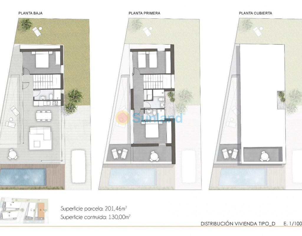 EKSKLUSIVE NYBYGGET VILLAER I TORRE DE LA HORADADA Eksklusive 3 værelses villaer beliggende kun 300 m fra stranden i Torre de la Horadada. Ny bbuild promovering af 4 selvstændige villaer, med ca. 215m2. af grund, 130m2 ca. bygget opdelt i stueplan, 1. sal, solarium og med mulighed for kælder mod merpris. Villaer har 3 soveværelser, 3 badeværelser, stue med åbent køkken, have med privat pool og parkeringsplads. Villaerne ligger kun 300 meter fra stranden og 200 meter fra Plaza Nueva indkøbscenter. Torre de la Horadada ligger syd for Alicante i en smuk beliggenhed ved kysten. De smukke strande i Torre de la Horadada og Mil Palmeras har fint sand og smuk promenade. Der er masser af restauranter, barer og butikker, også vandsport, dykning og snorkling. Det er godt forbundet kun 40 minutter fra Alicante og Murcias Corvera lufthavne, med store kommercielle indkøbscentre og flere golfbaner alle inden for rækkevidde.