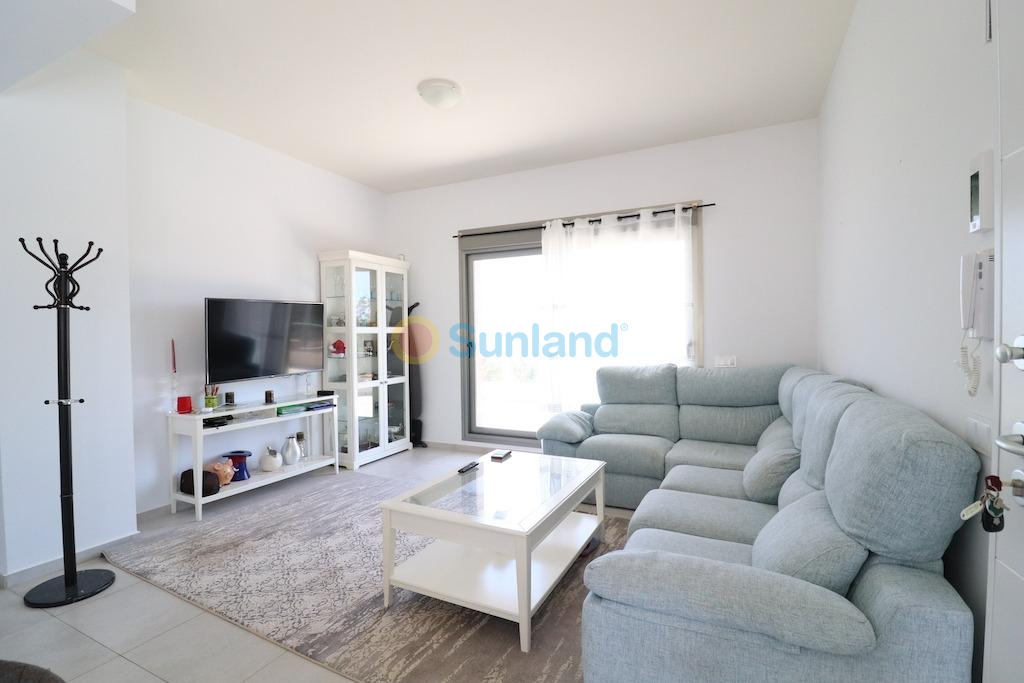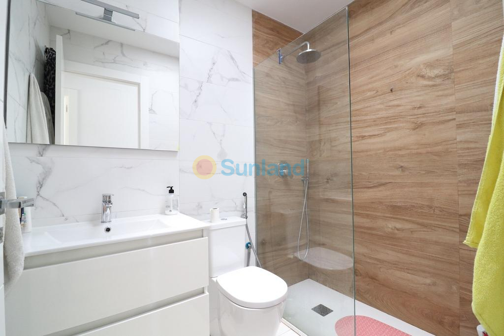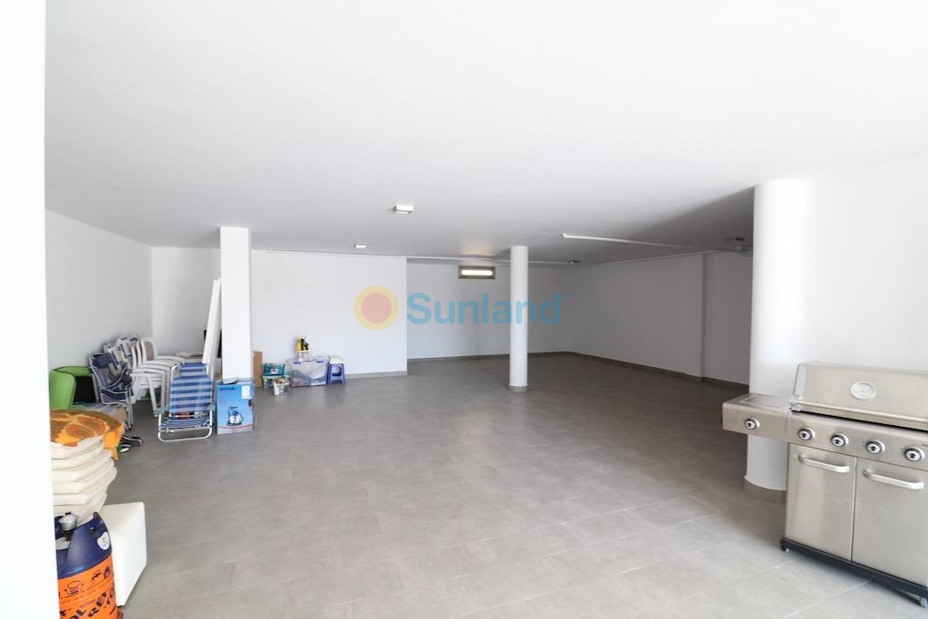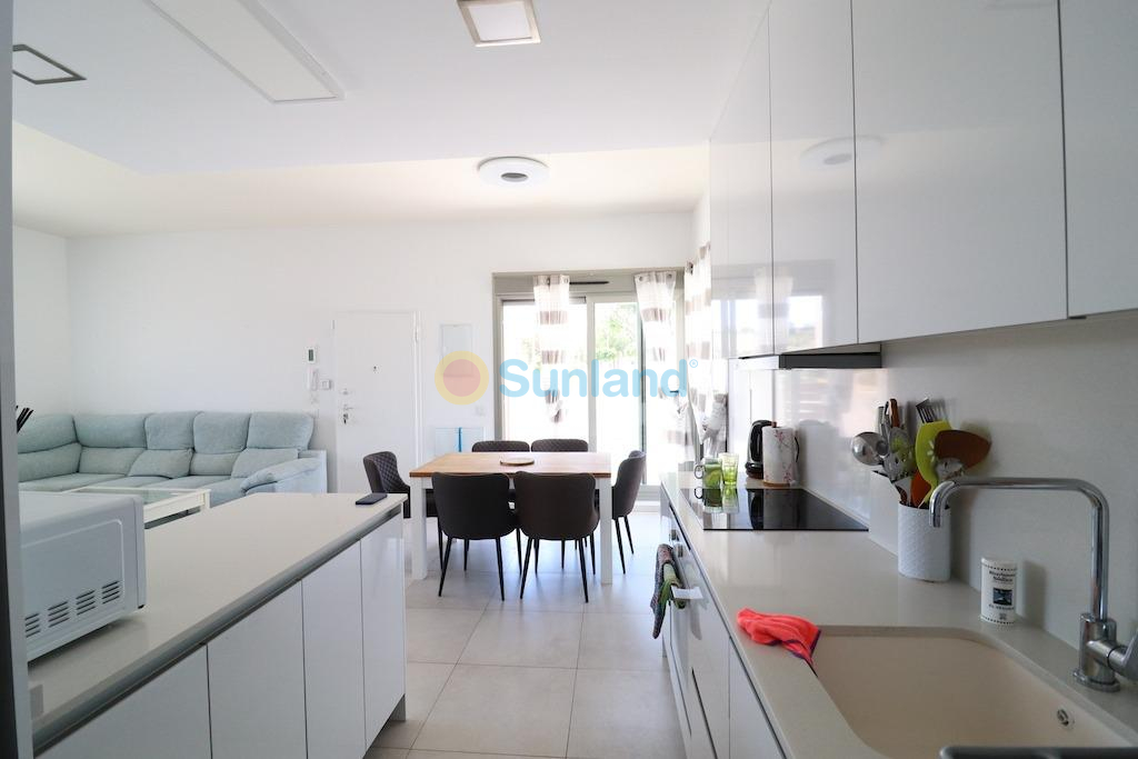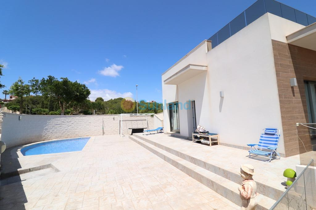 Residencial Vistabella, San Miguel de Salinas, villa en angle avec vue sur la mer et les salines et face à un parc, orienté plein sud avec un terrain de 405 m2 et une maison sur un étage de 100 m2 avec 3 chambres, 2 salles de bain, cuisine avec son îlot central, cellier, salon, garage avec accès direct à la maison de 153 m2, solarium de 60 m2, piscine privée. Vendue meublée et climatisée.