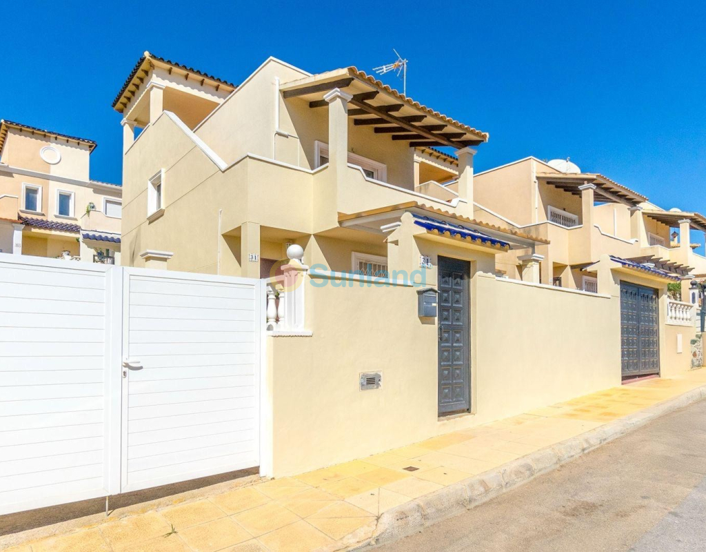 Wij presenteren met trots deze goed onderhouden, vrijstaande villa in de populaire woonwijk Blue Lagoon in Villamartin. De woning beschikt over 3 slaapkamers en 2 badkamers, met een praktische indeling die geschikt is voor zowel permanent verblijf als vakantiewoning. De lichte woonkamer sluit aan op een volledig uitgeruste keuken, en de slaapkamers bieden comfortabele ruimte voor het hele gezin of gasten. Buiten vindt u een ruim terras op de begane grond, ideaal voor dineren in de open lucht, en een privé dakterras met panoramisch zeezicht. Er is ook privéparkeergelegenheid en toegang tot een goed onderhouden gemeenschappelijk zwembad. Gelegen in een rustige omgeving maar dichtbij golfbanen, stranden en voorzieningen, biedt deze villa een ontspannen mediterrane levensstijl aan de Costa Blanca.